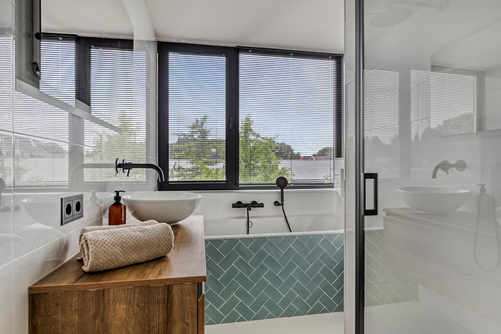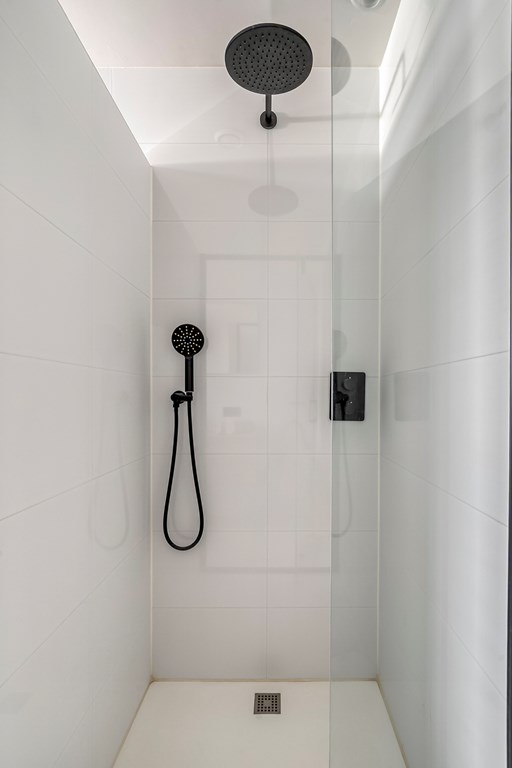 Off the landing is the modern, fully tiled bathroom, fitted with a bathtub, a generous walk-in shower with glass door, a wall-hung toilet, and a stylish vanity unit. The clean, contemporary finish contributes to a luxurious, well-kept feel.