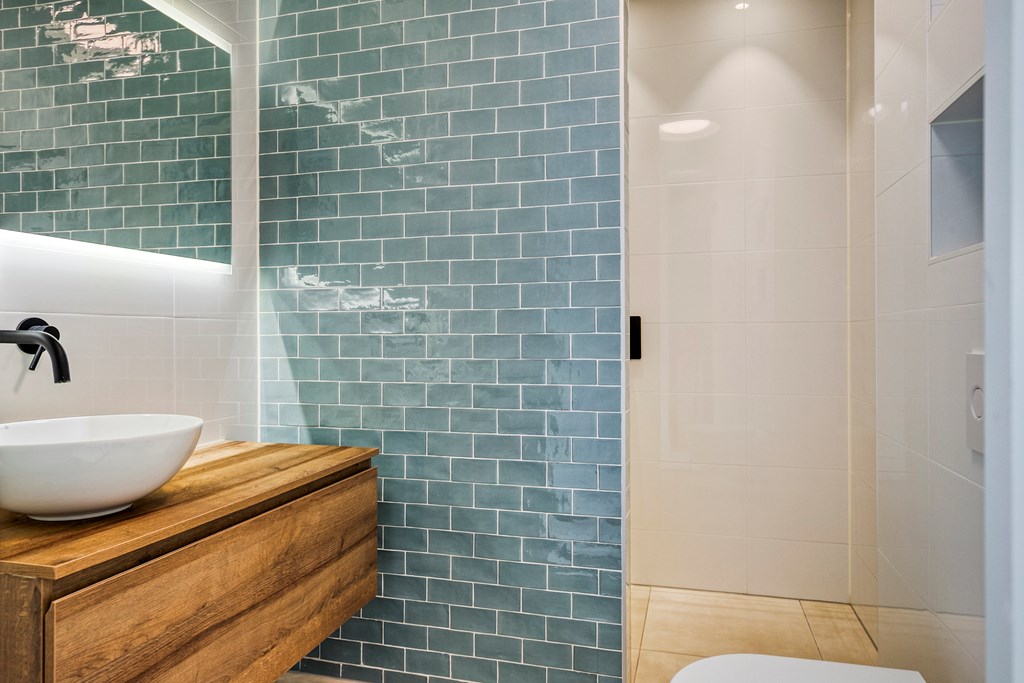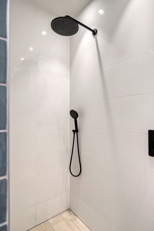 The second bathroom matches the style of the first: fully tiled, modern, and practically arranged. It features a large walk-in shower, a wall-hung toilet, and an elegant vanity unit with storage.