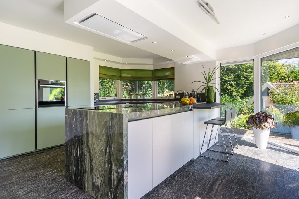 Large windows usher daylight into the three bedrooms and two bathrooms, framing serene green views throughout. The ground floor flows from a bright entrance hall to a generous living room with unique architectural rhythms, a gas fireplace, and sliding glass doors revealing landscaped southeast gardens. The kitchen, renewed in 2020, features stone worktops, high-quality appliances, and direct terrace access for effortless garden dining. A study on this level offers flexibility for work or conversion to a fourth bedroom.