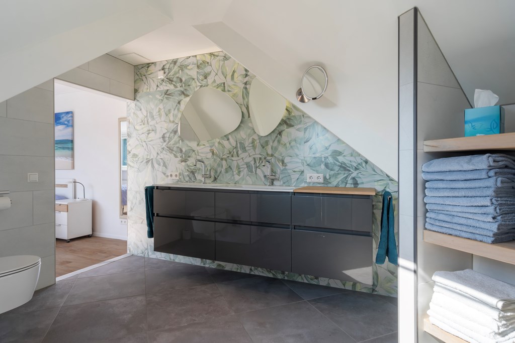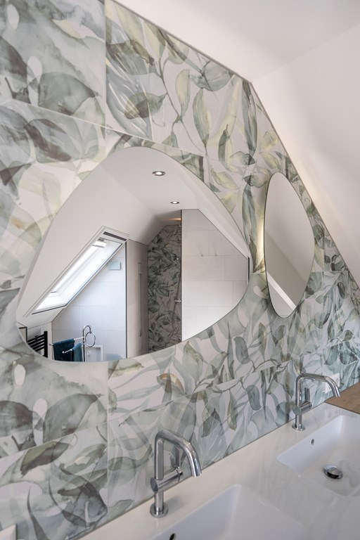 Upstairs, the main suite enjoys air conditioning, an en-suite bathroom with contemporary finishes and a private balcony. Two further bedrooms offer built-in wardrobes, balcony access, and atmospheric loft lines with exposed beams. Comfort is enhanced throughout with underfloor heating, air conditioning, double glazing, and a comprehensive alarm system.
