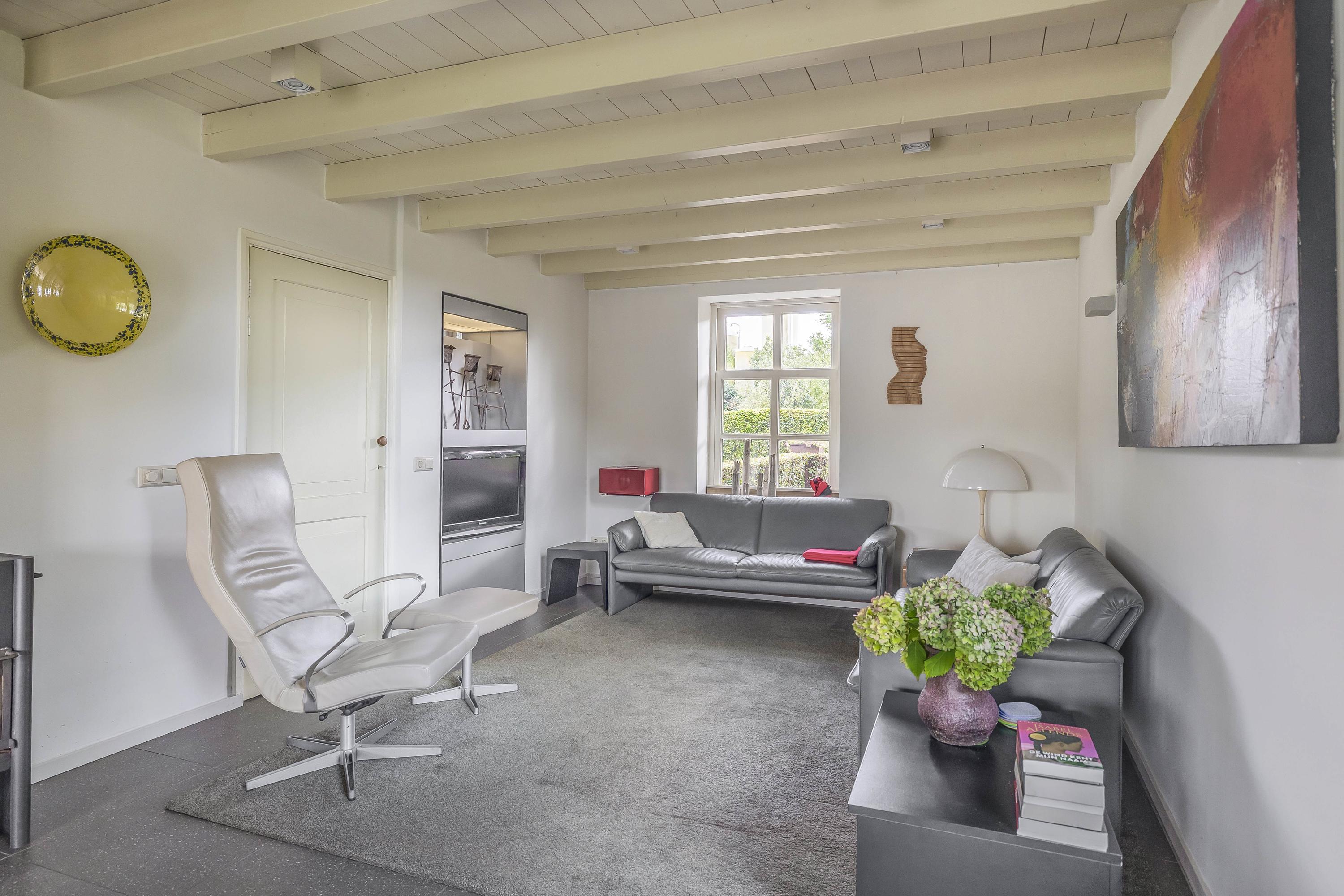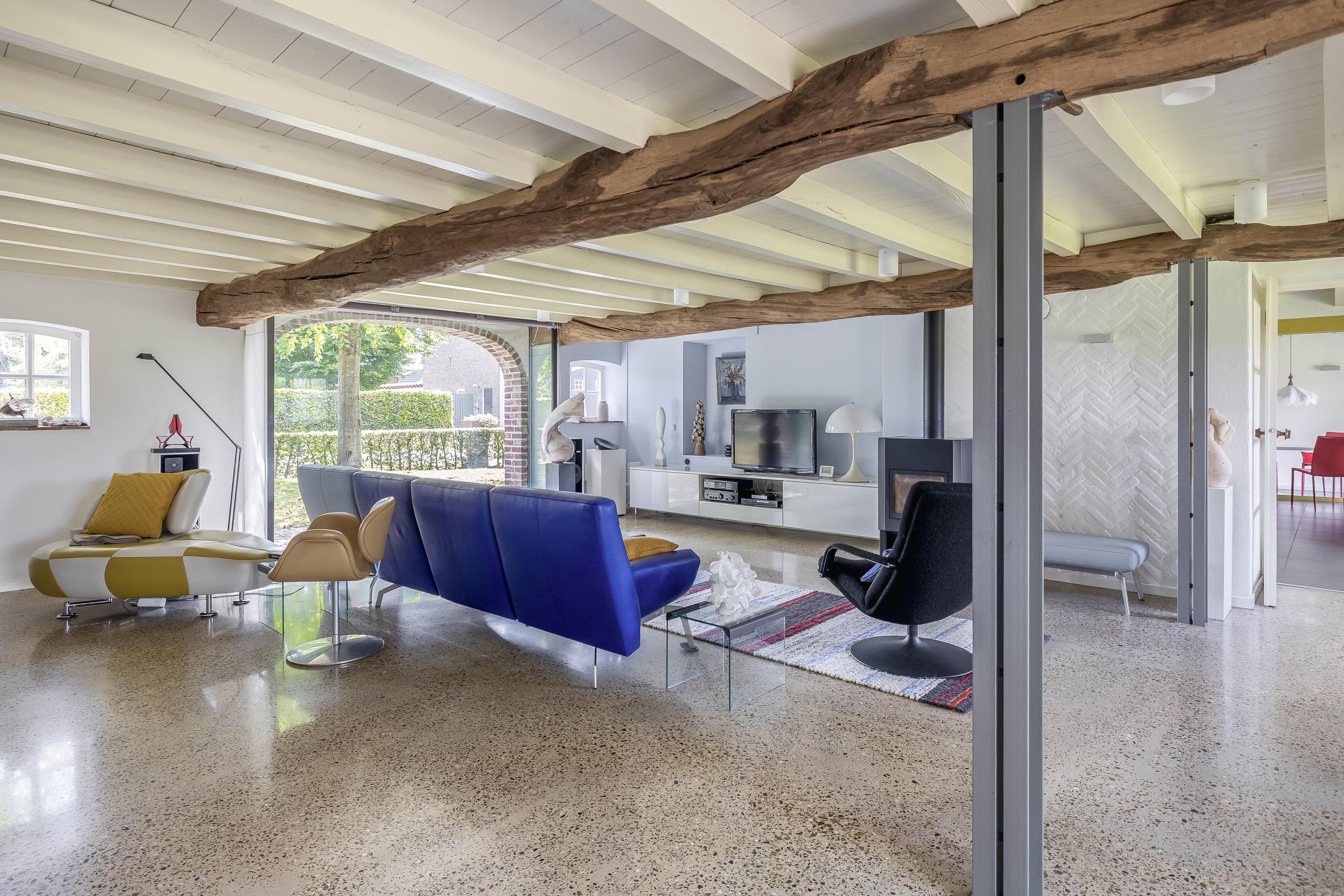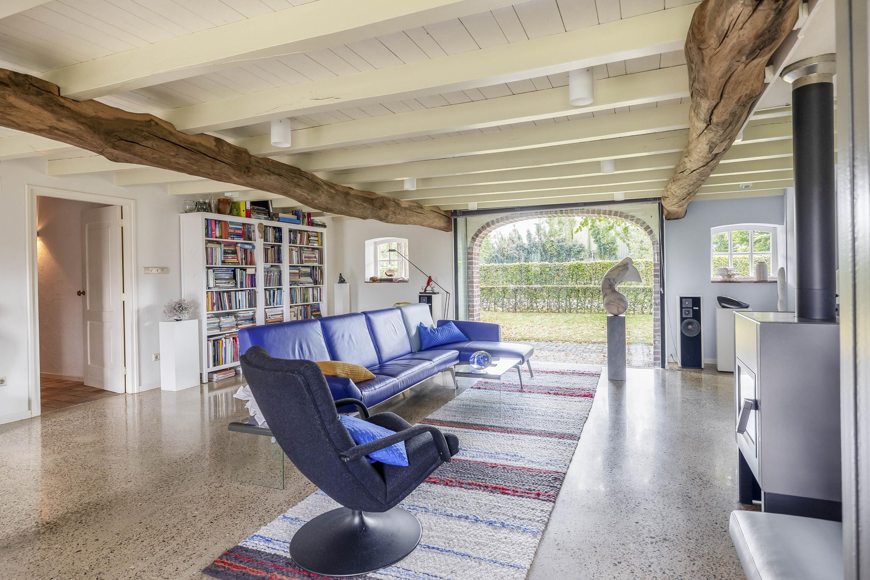 Double doors from the kitchen lead to the living room, which has a smooth, polished concrete floor with underfloor heating. The living room has stucco walls and a beautiful wooden beamed ceiling with attractive old oak beams. A large window at the front and double French doors at the rear offer a beautiful view of the garden. Here too, a wood-burning stove has been installed for extra warmth and cosiness.