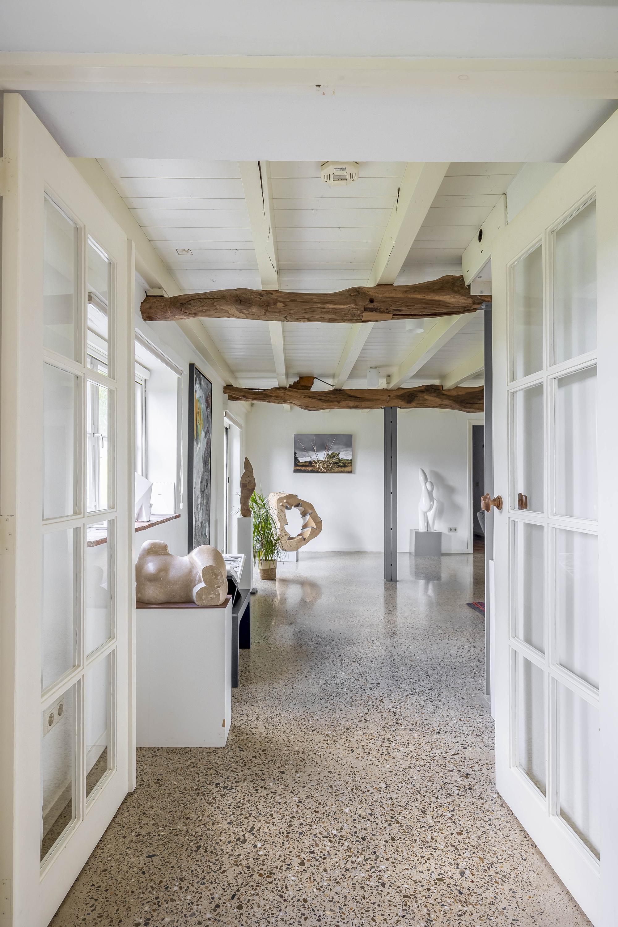 From the fixed staircase in the entrance hall, you reach the first floor of the main house. Here you will find a spacious landing with carpeted floors, stucco walls, and a beamed ceiling, with a view into the hall on the ground floor. From here, you have access to two bedrooms and the second bathroom.