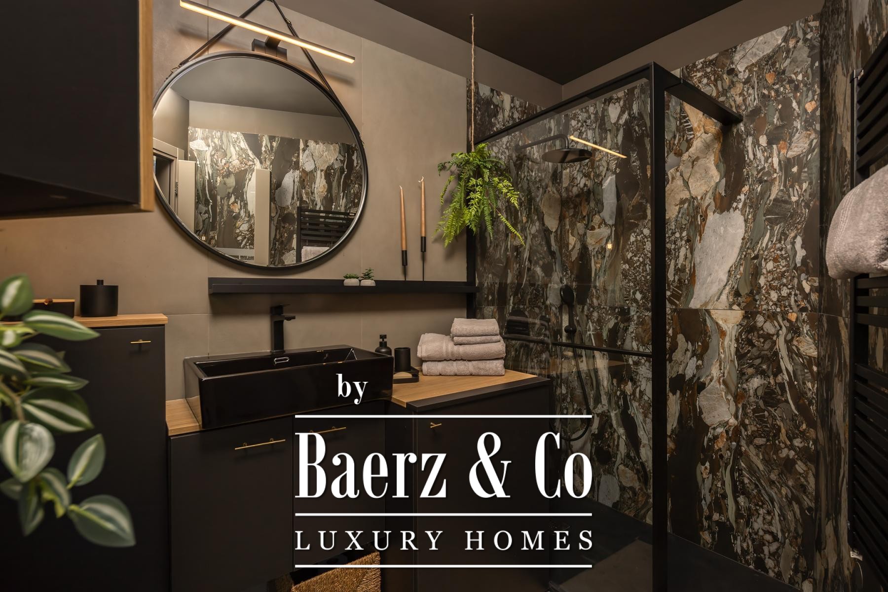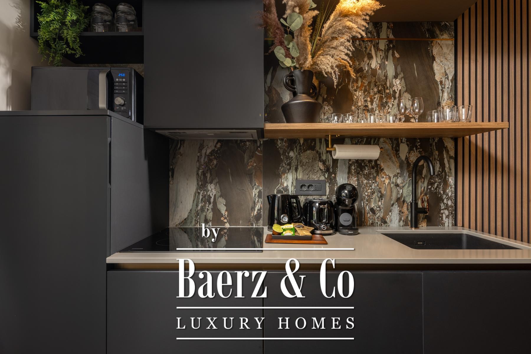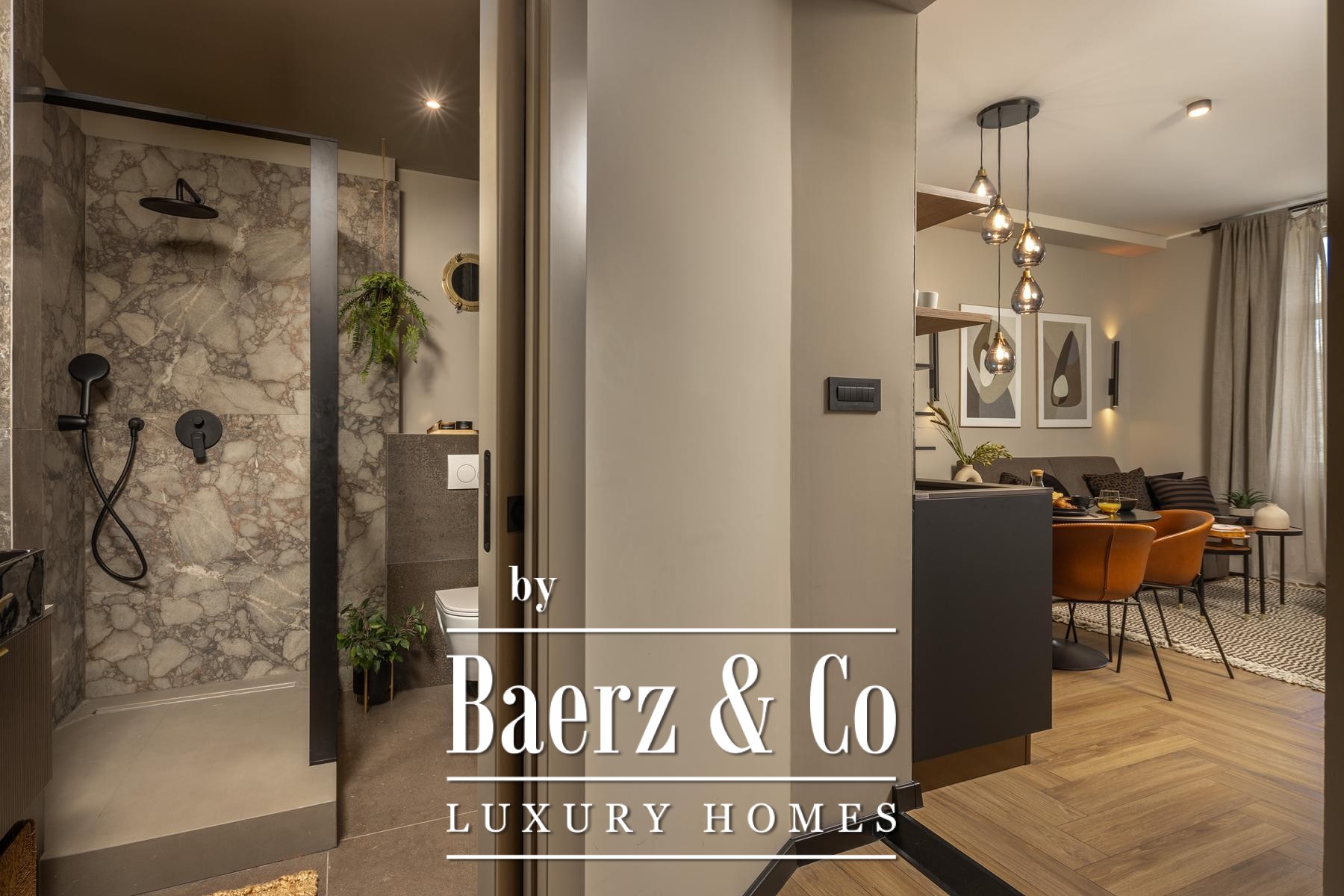 The interiors are shaped by a refined use of warm beige and anthracite, highlighted by gold details and custom lighting. Italian furnishings, large-format porcelain tiles, and matte black Veneta Cucine kitchens with sophisticated stone-marble backsplashes set an elevated tone. Frosted glass partitions, wooden wall slats with LED accents, and designer brass lighting complete the ambience.