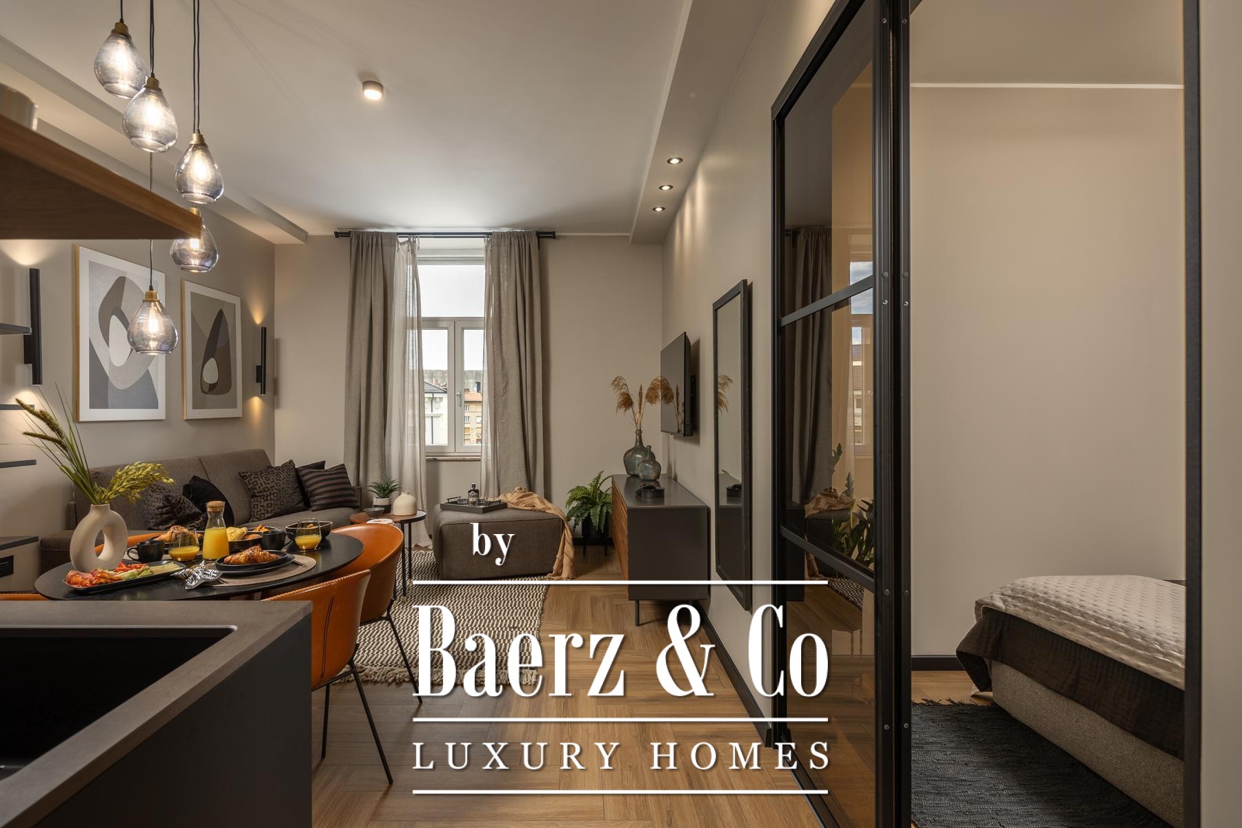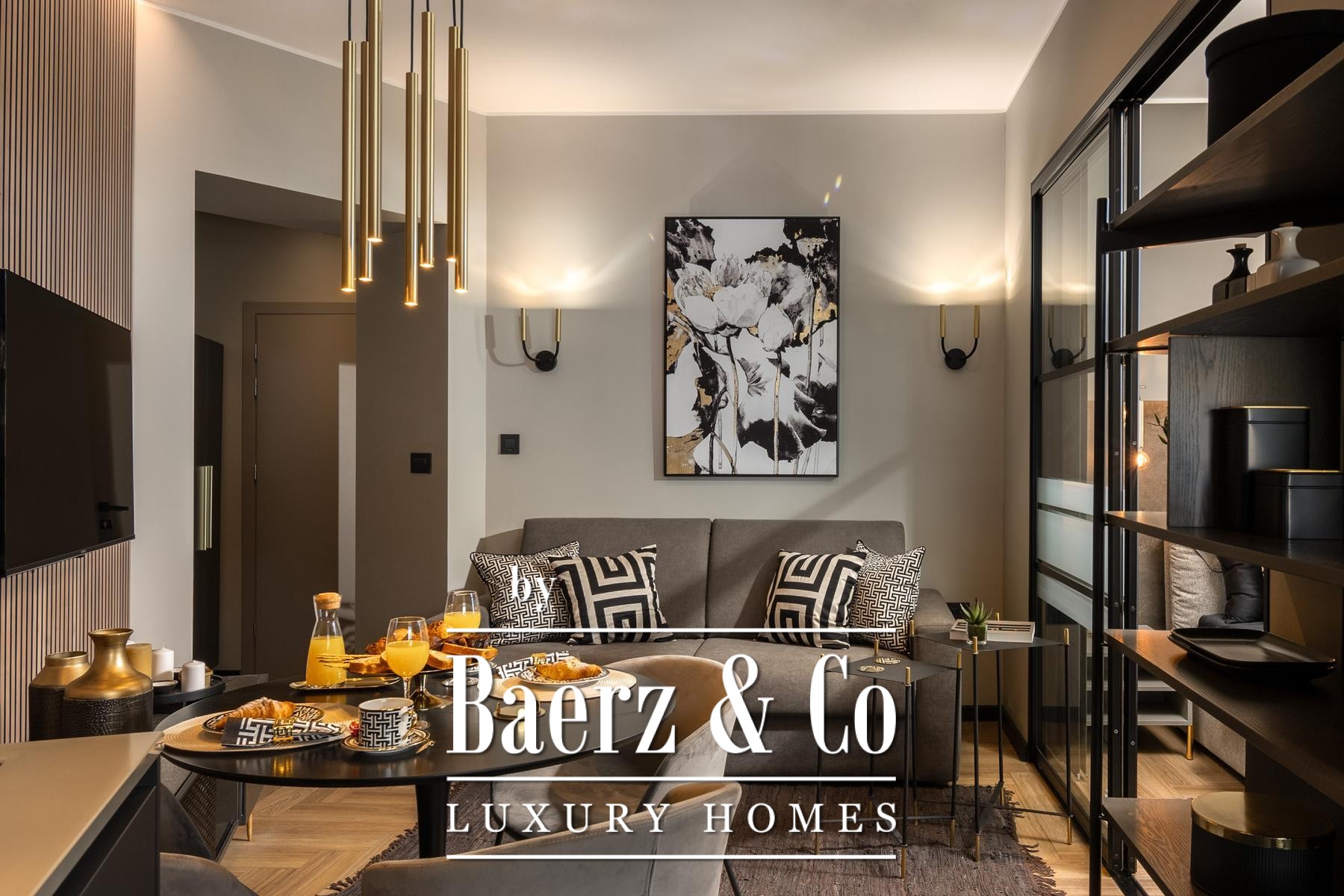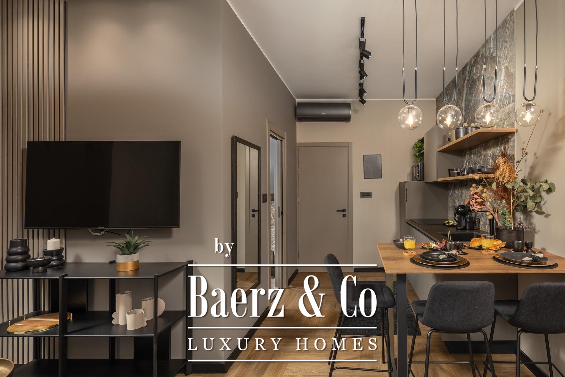 The interiors are shaped by a refined use of warm beige and anthracite, highlighted by gold details and custom lighting. Italian furnishings, large-format porcelain tiles, and matte black Veneta Cucine kitchens with sophisticated stone-marble backsplashes set an elevated tone. Frosted glass partitions, wooden wall slats with LED accents, and designer brass lighting complete the ambience.