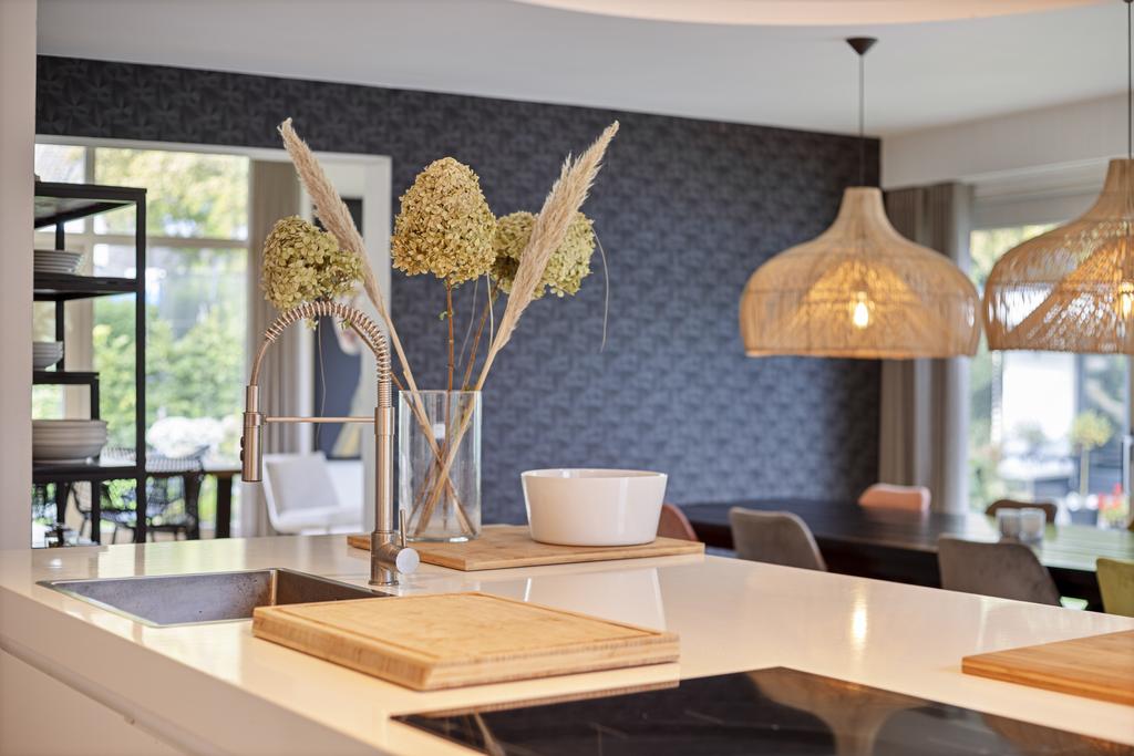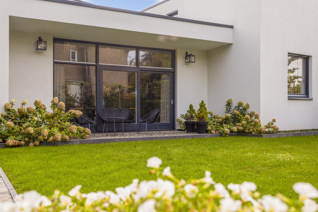 The side and rear gardens are accessible via four large sliding doors. All rooms are finished with either a modern concrete-look floor or a classic wooden herringbone floor. The kitchen is designed around a central island and is fully equipped with all necessary built-in appliances.