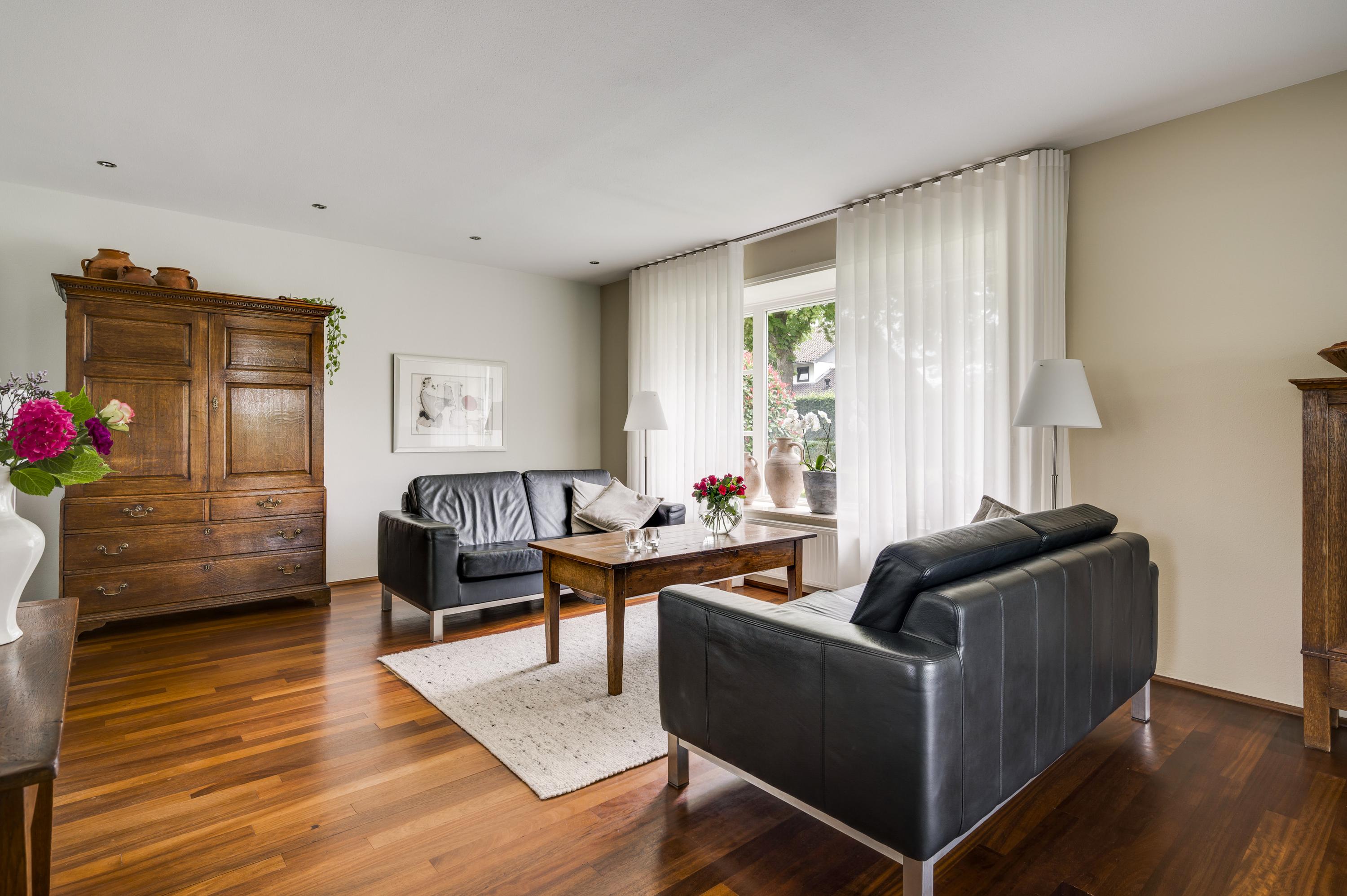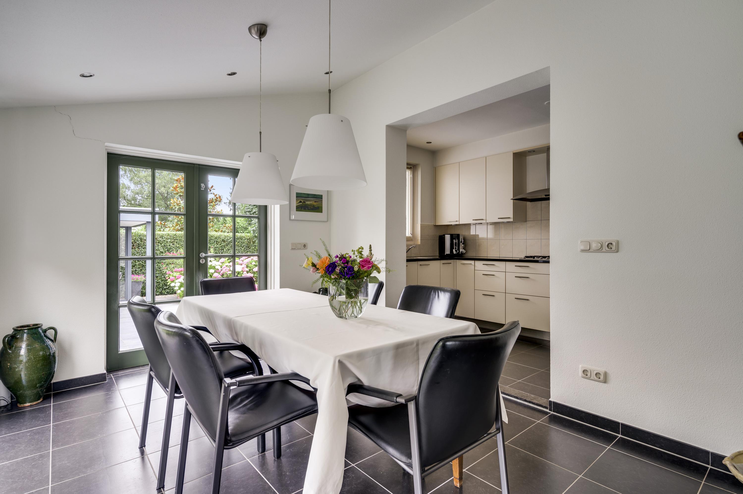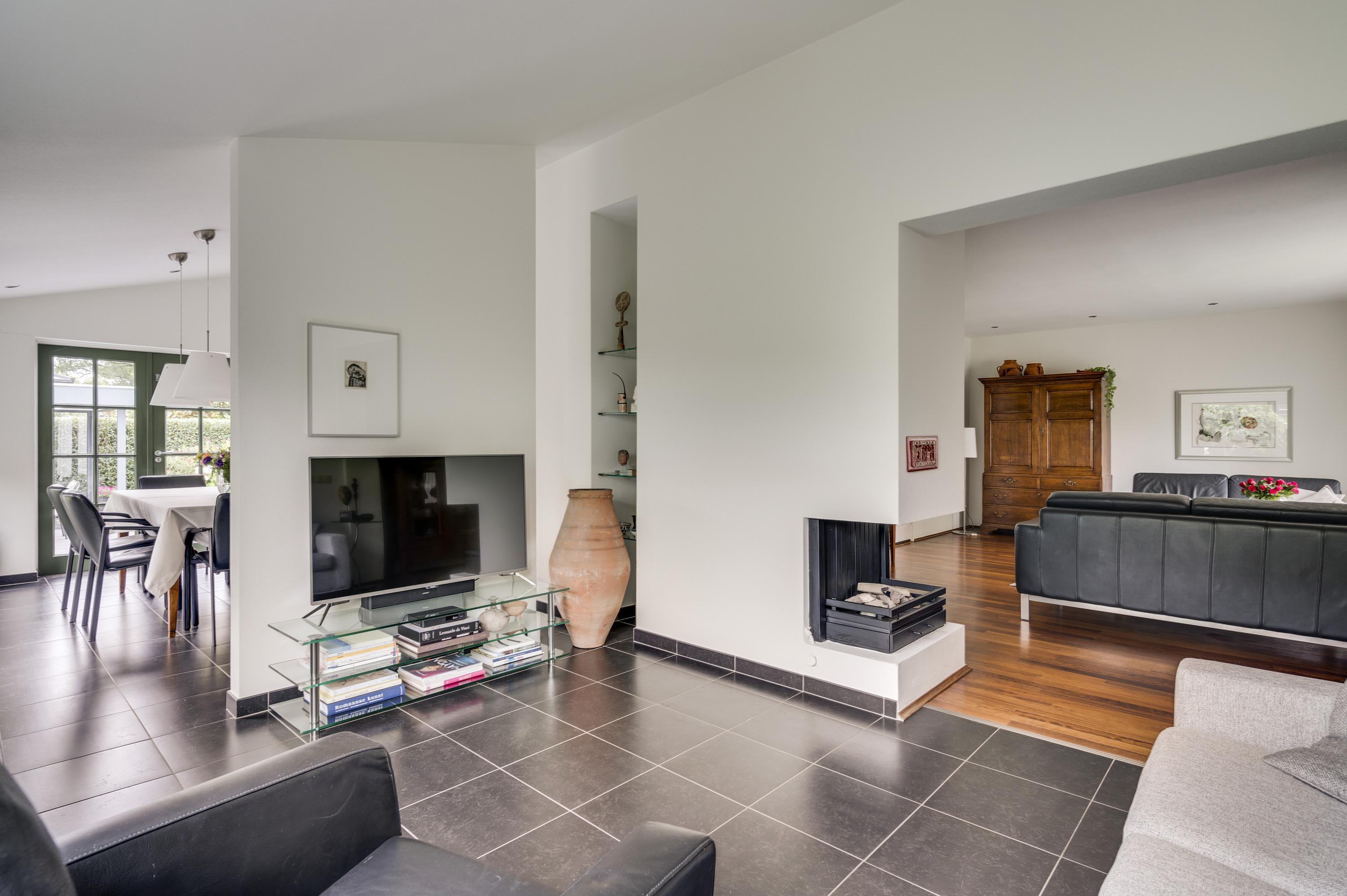When you enter the spacious hall, you immediately feel the atmosphere of this special house. The bright living room is divided into three attractive rooms: a sitting room, a TV room and a dining room, which flow into each other harmoniously. The large windows provide beautiful light and a magnificent view of the beautifully landscaped garden. Through the French doors you walk straight onto the terrace, where you can enjoy peace and privacy.