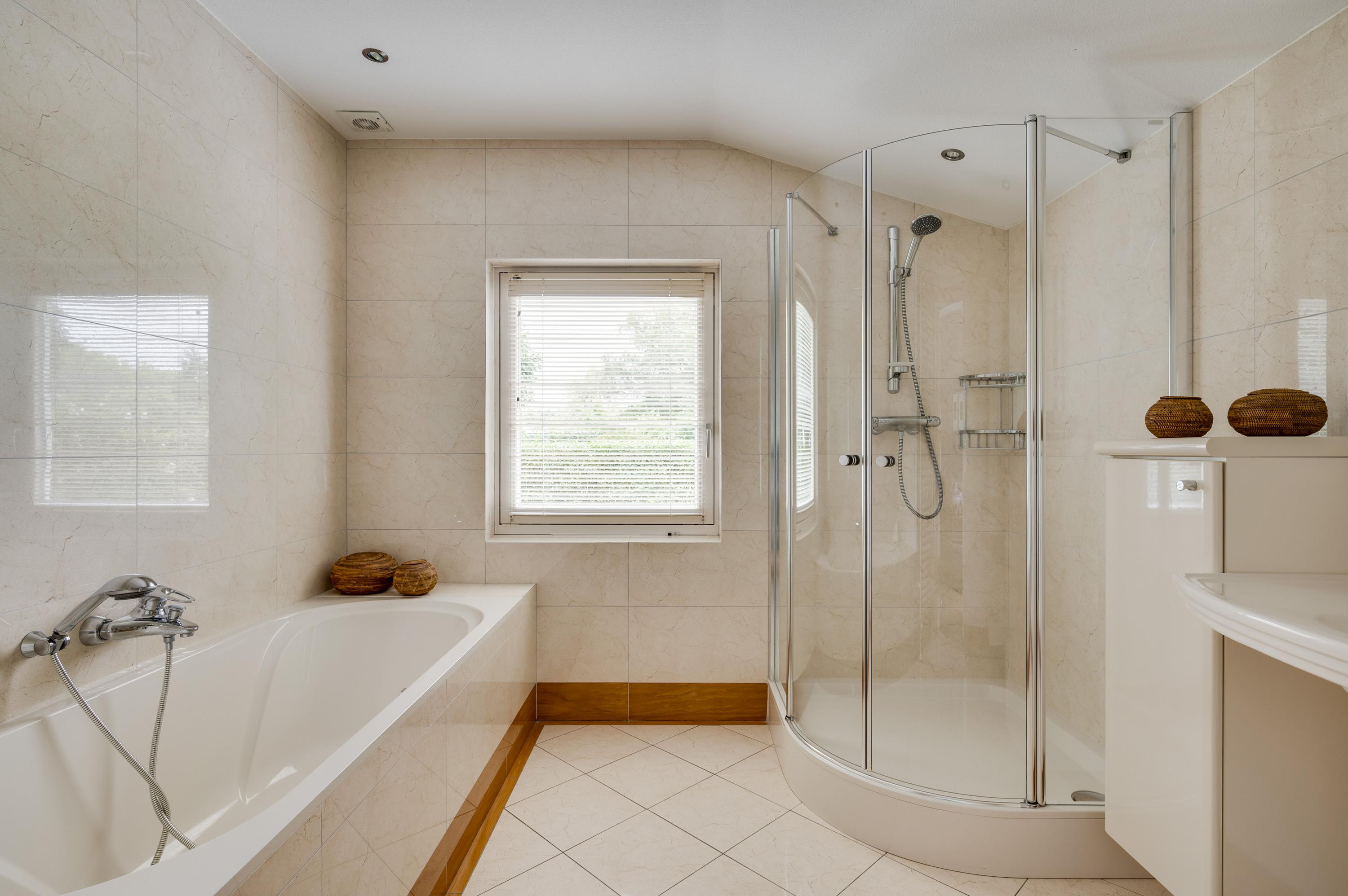 The ground floor offers a spacious master bedroom with its own bathroom and balcony, an ideal private space to relax. The bathroom has a bath, extra spacious shower, washbasin and comfortable underfloor heating. In addition, there is a practical office room and a toilet on this floor. Thanks to this layout, the house is extremely suitable for those who mainly want to live on the ground floor, with the option of offering guests their own space on the first floor.