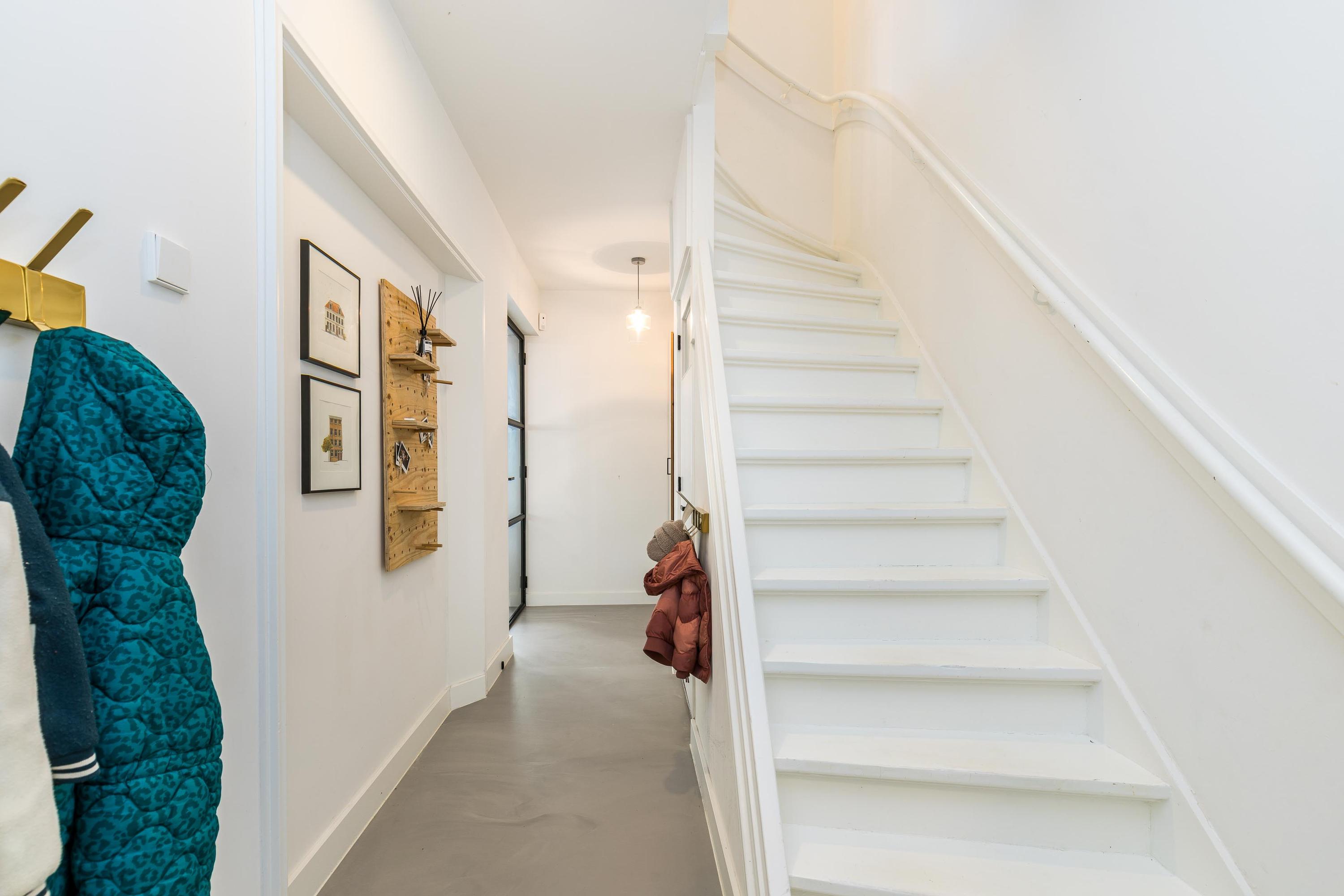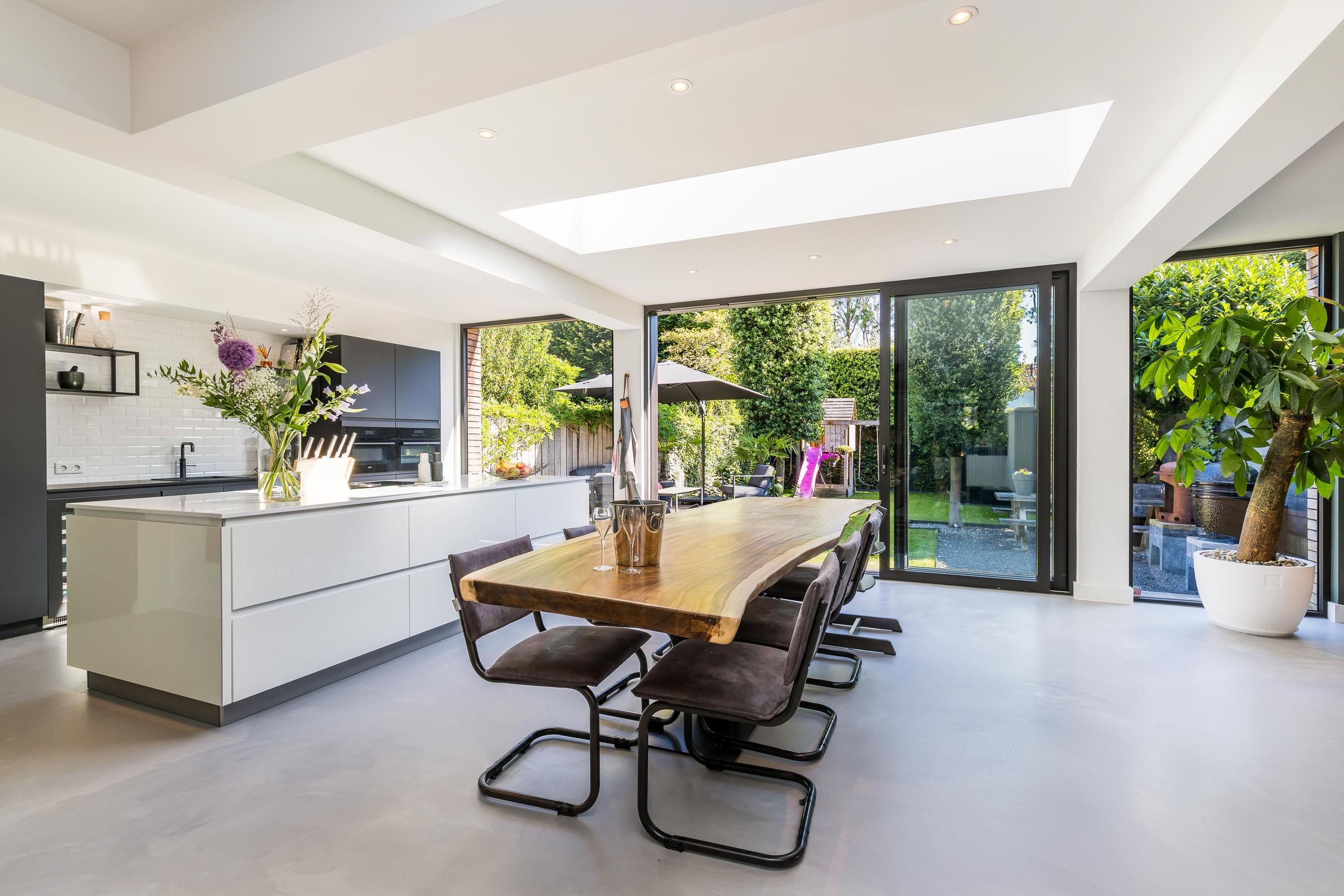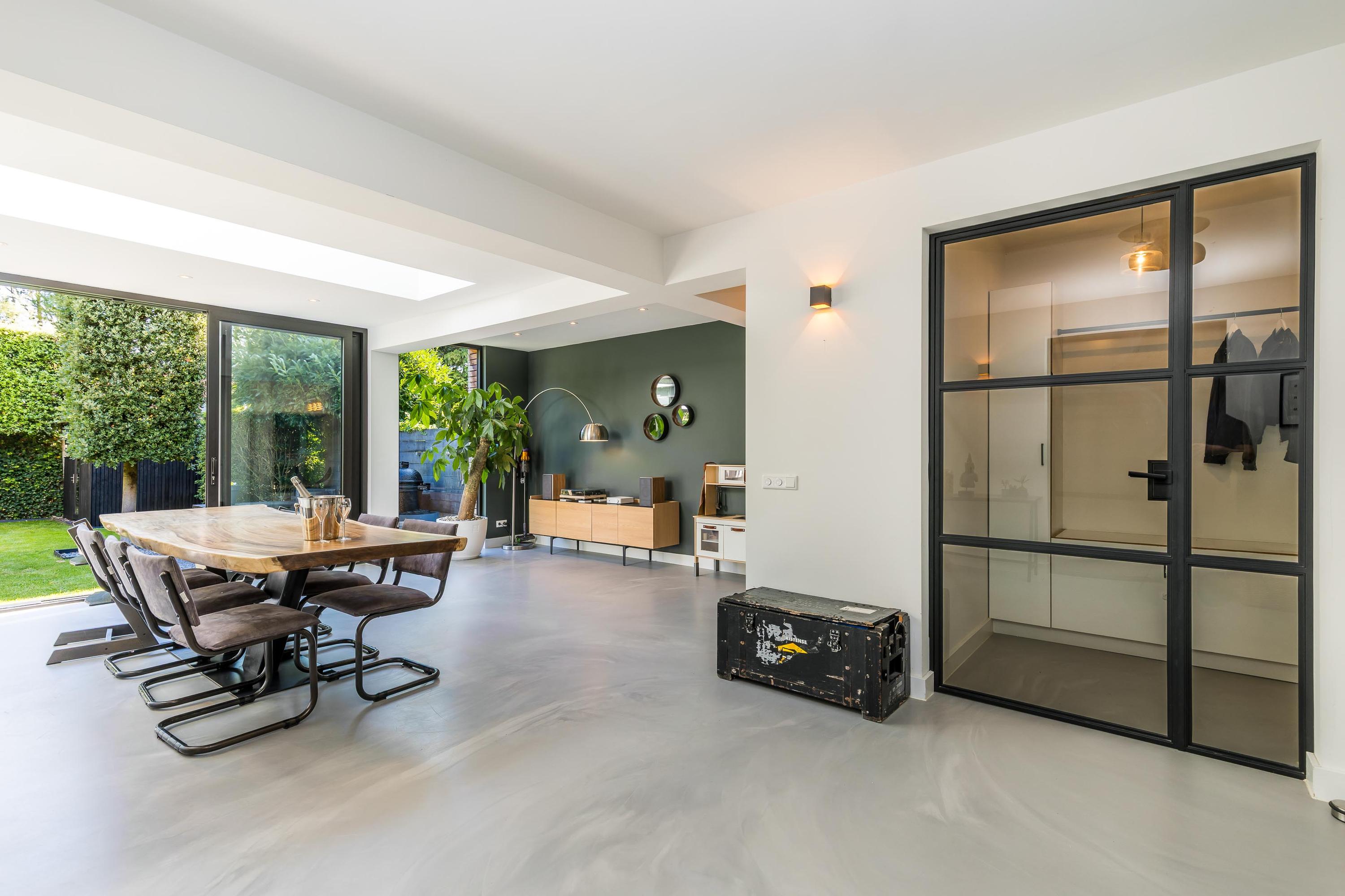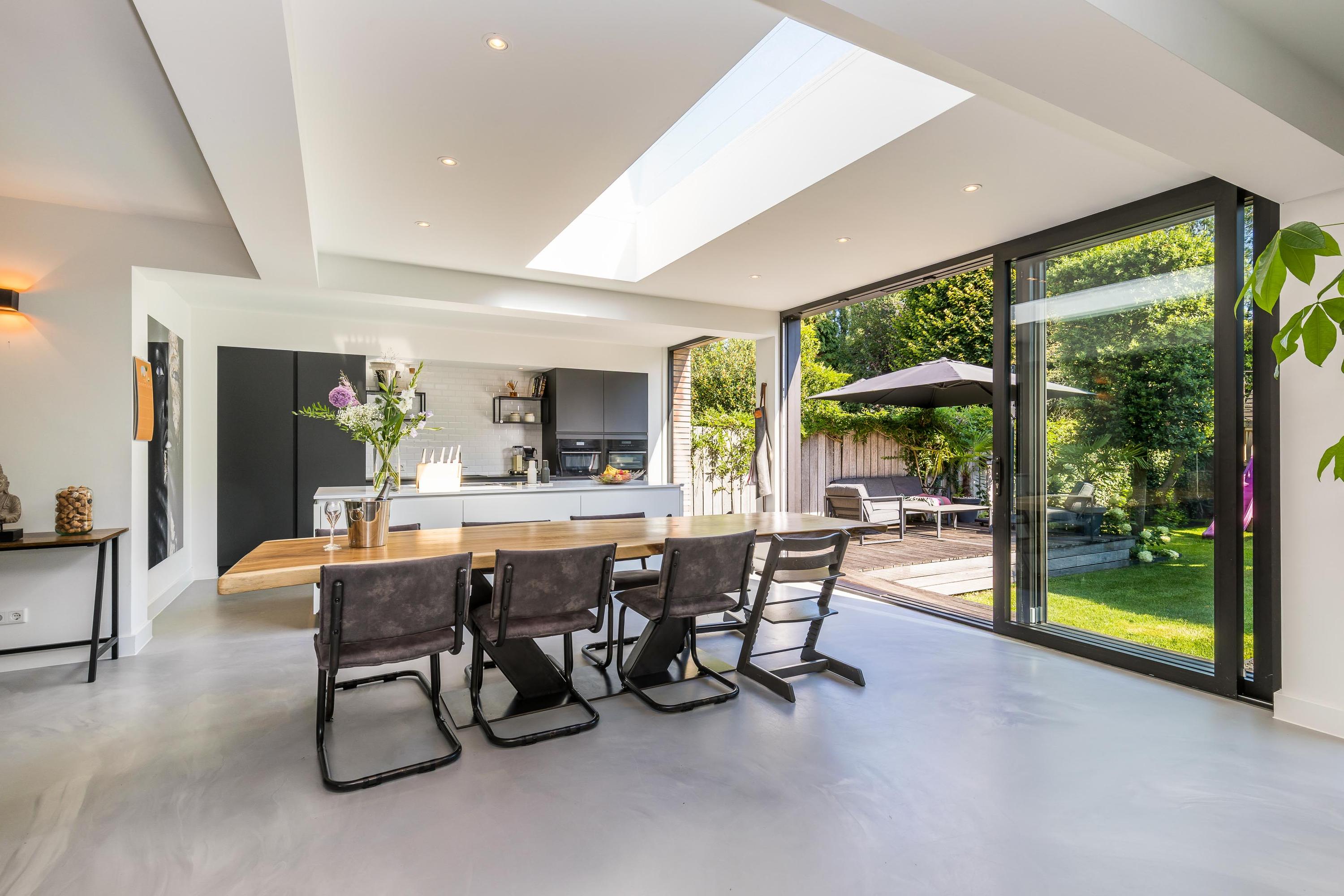 The ground floor is bathed in light and exudes a sense of space. In 2019, the property was almost completely renovated, including the installation of a modern open-plan kitchen with high-end built-in appliances, a large refrigerator, freezer, and a wine climate cabinet. The expansive living room features a full-width glass façade with double sliding doors, providing direct access to the back garden. There is also a practical utility room with connections for a washing machine and dryer.