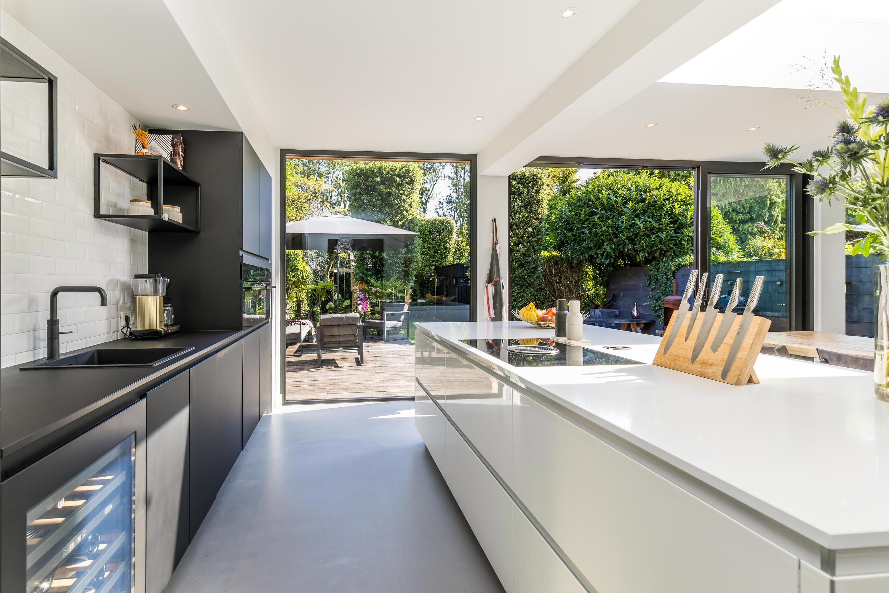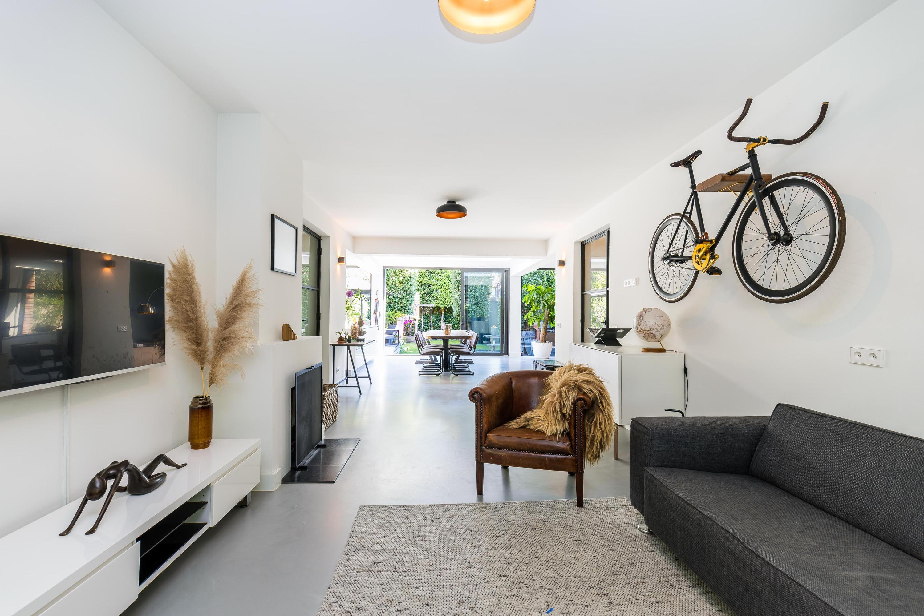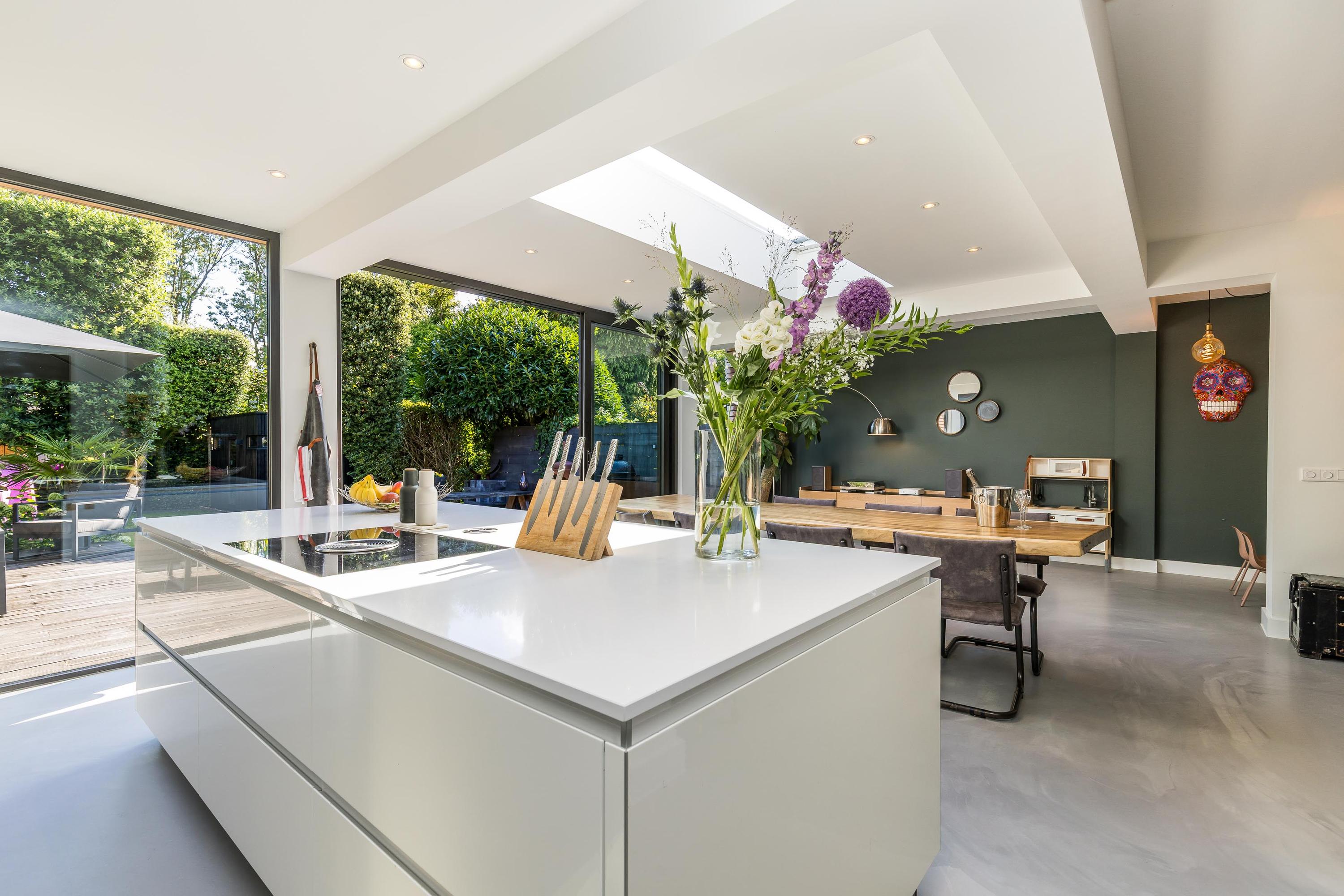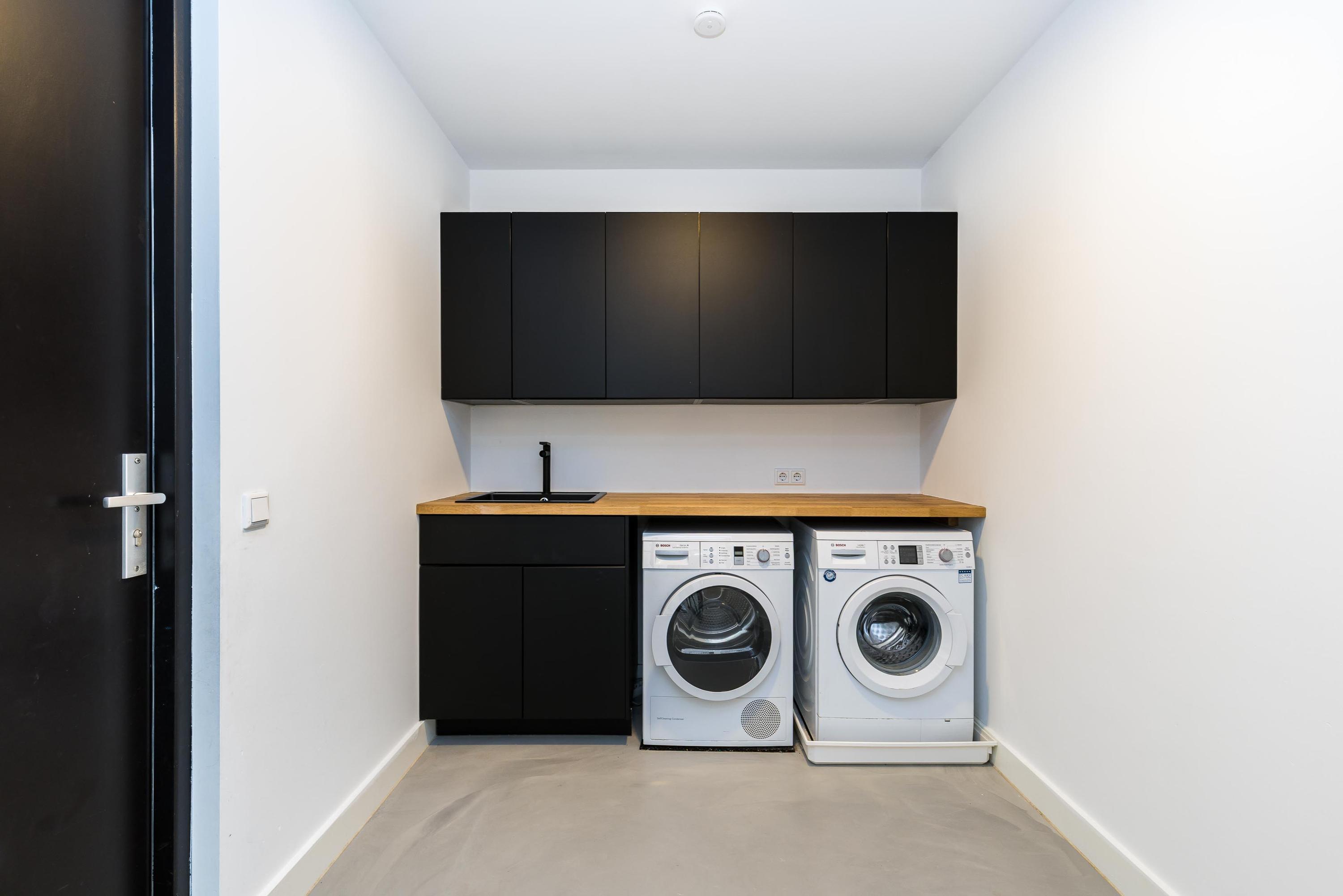 The ground floor is bathed in light and exudes a sense of space. In 2019, the property was almost completely renovated, including the installation of a modern open-plan kitchen with high-end built-in appliances, a large refrigerator, freezer, and a wine climate cabinet. The expansive living room features a full-width glass façade with double sliding doors, providing direct access to the back garden. There is also a practical utility room with connections for a washing machine and dryer.