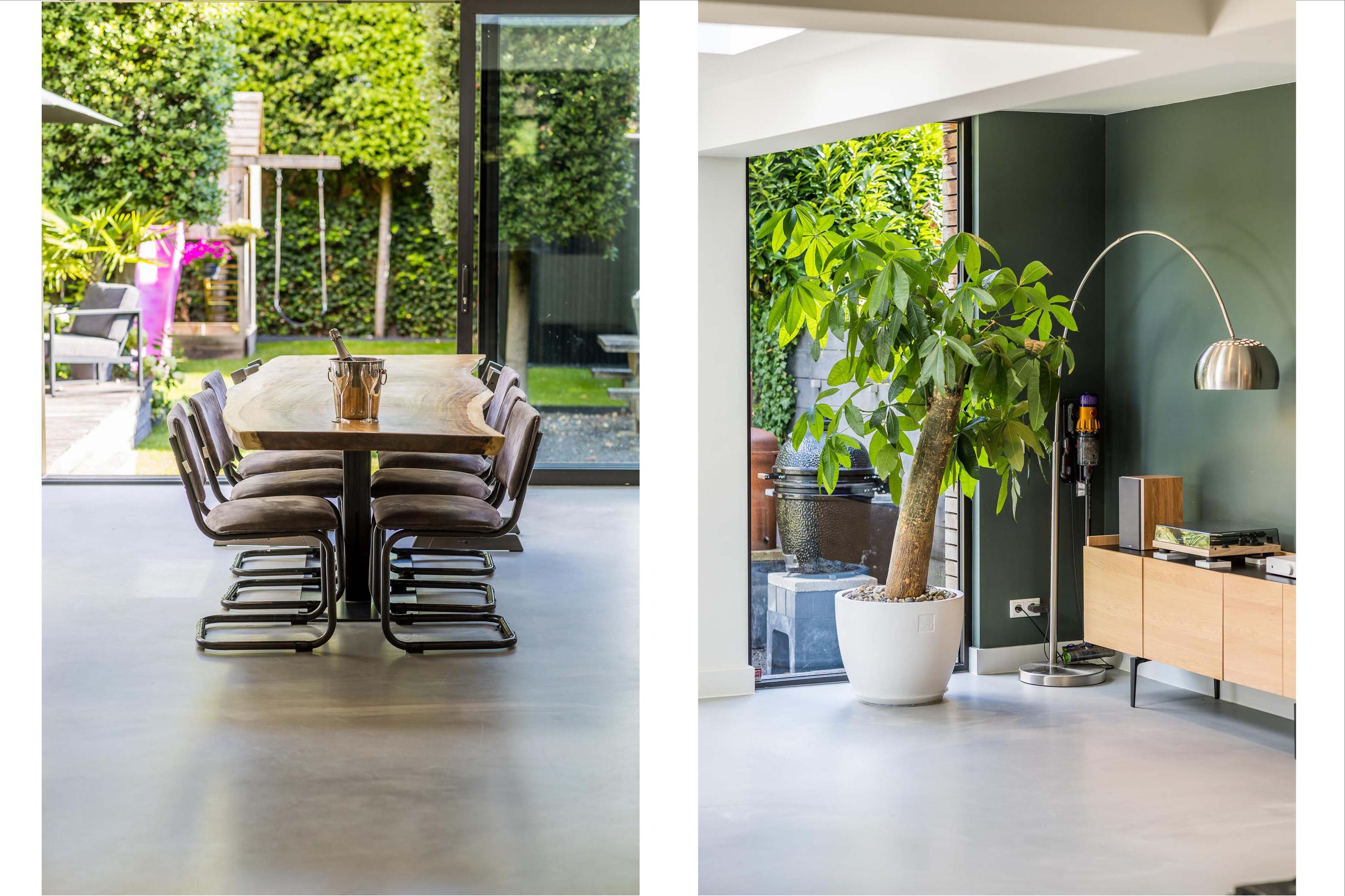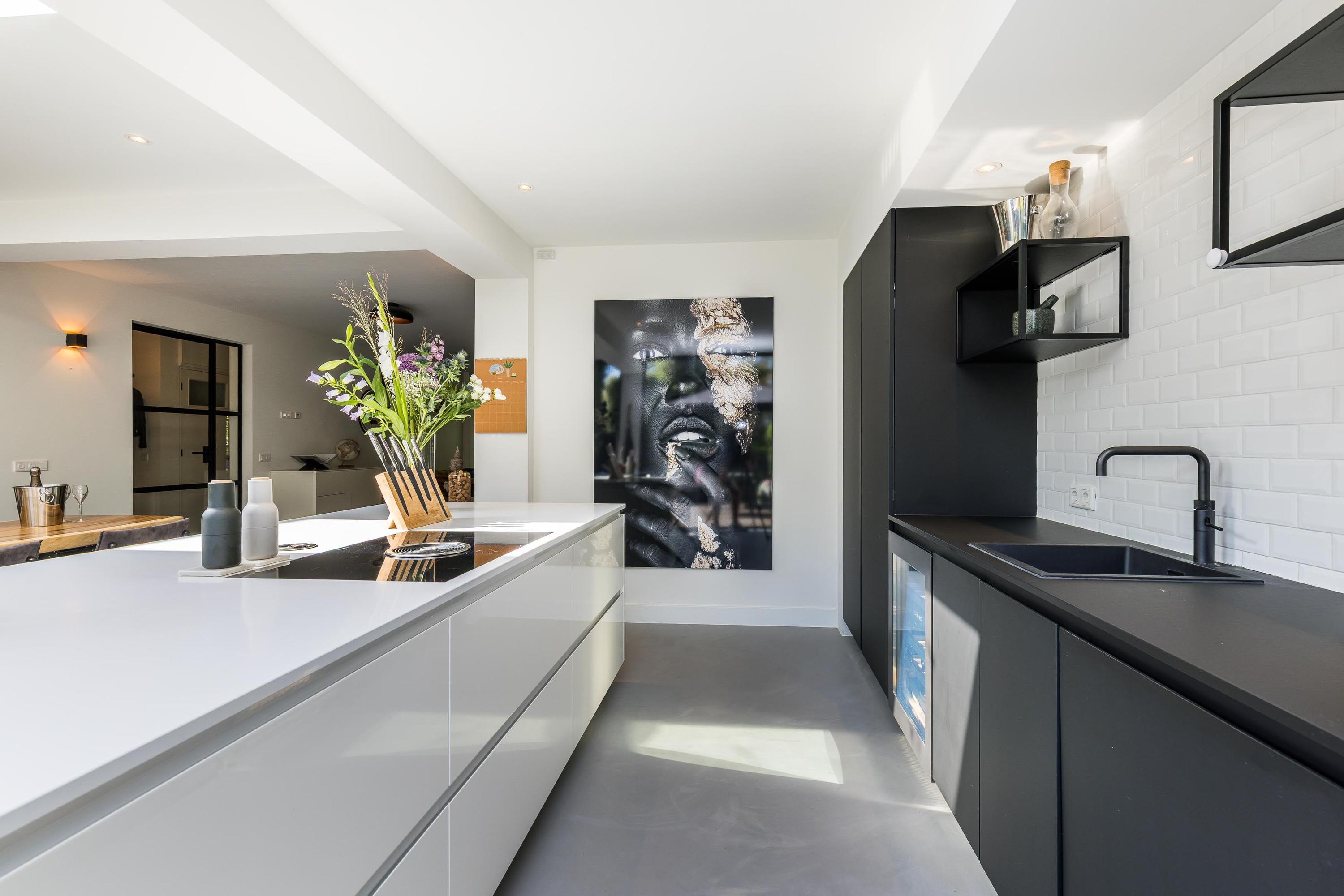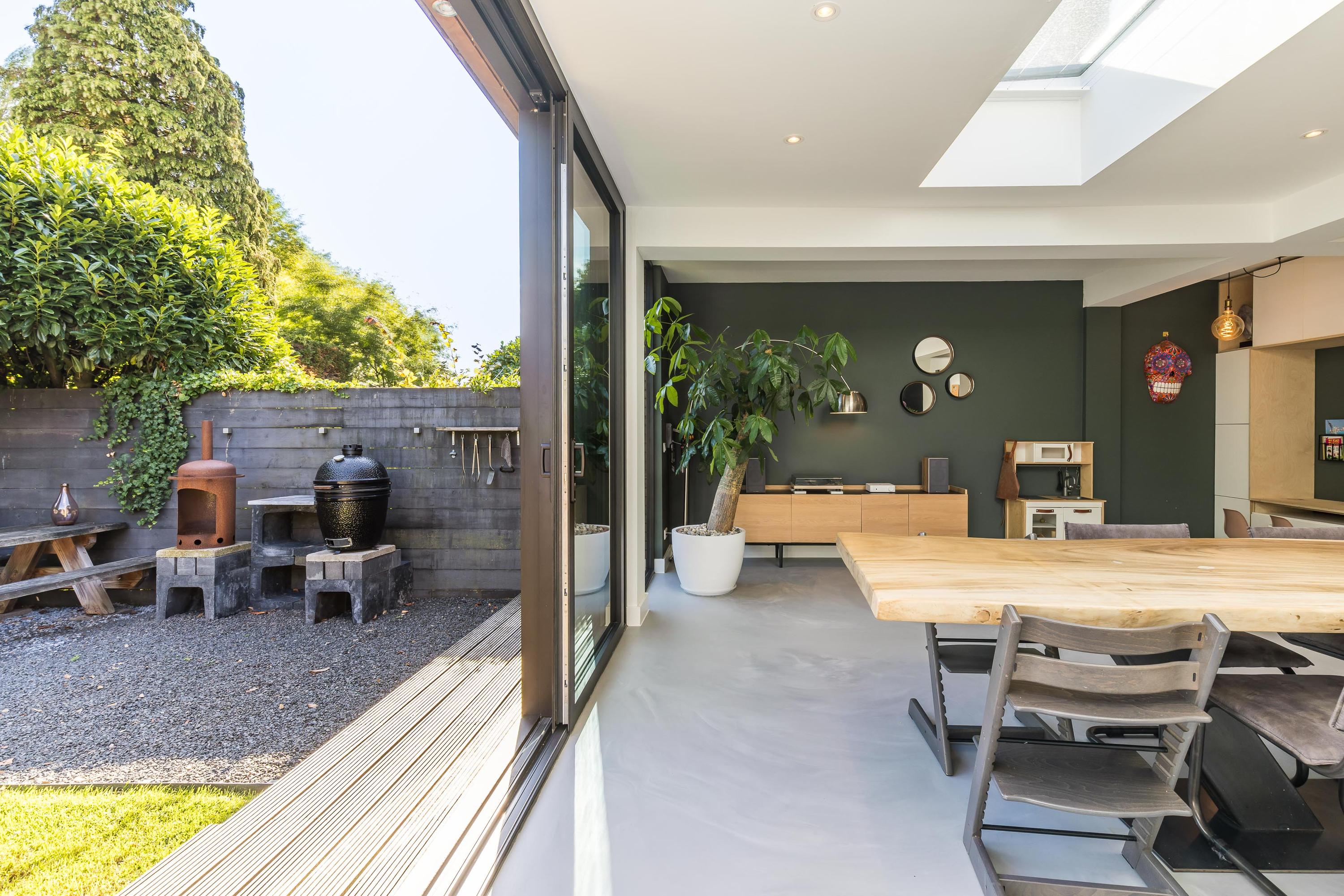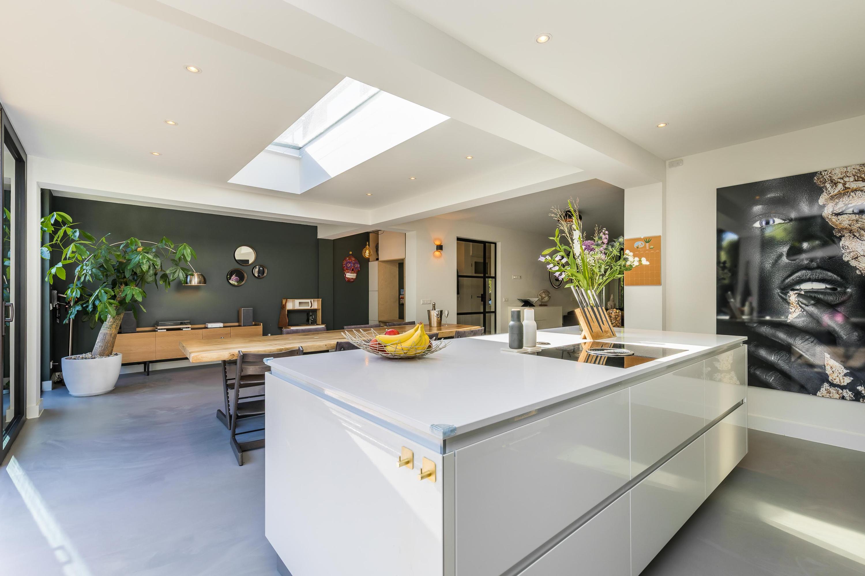 The ground floor is bathed in light and exudes a sense of space. In 2019, the property was almost completely renovated, including the installation of a modern open-plan kitchen with high-end built-in appliances, a large refrigerator, freezer, and a wine climate cabinet. The expansive living room features a full-width glass façade with double sliding doors, providing direct access to the back garden. There is also a practical utility room with connections for a washing machine and dryer.