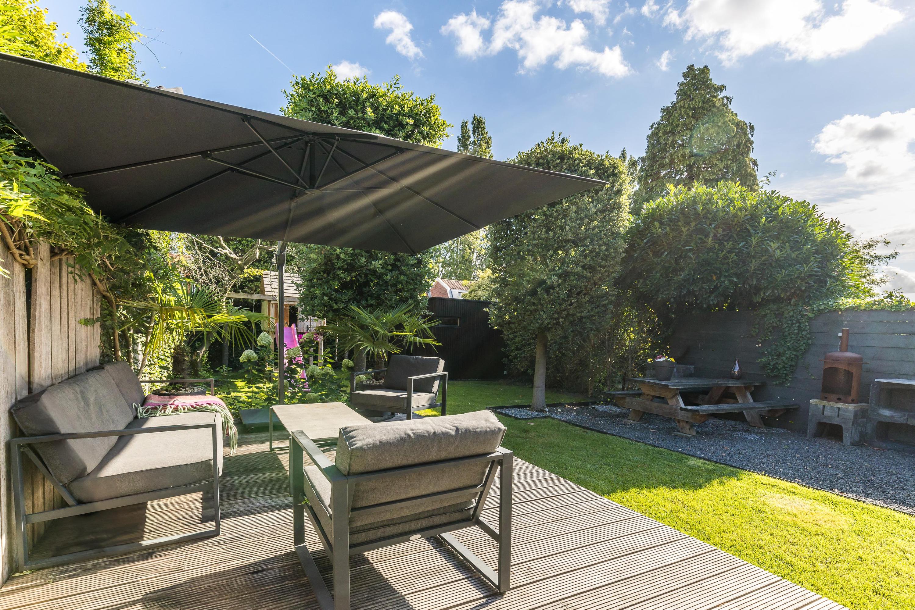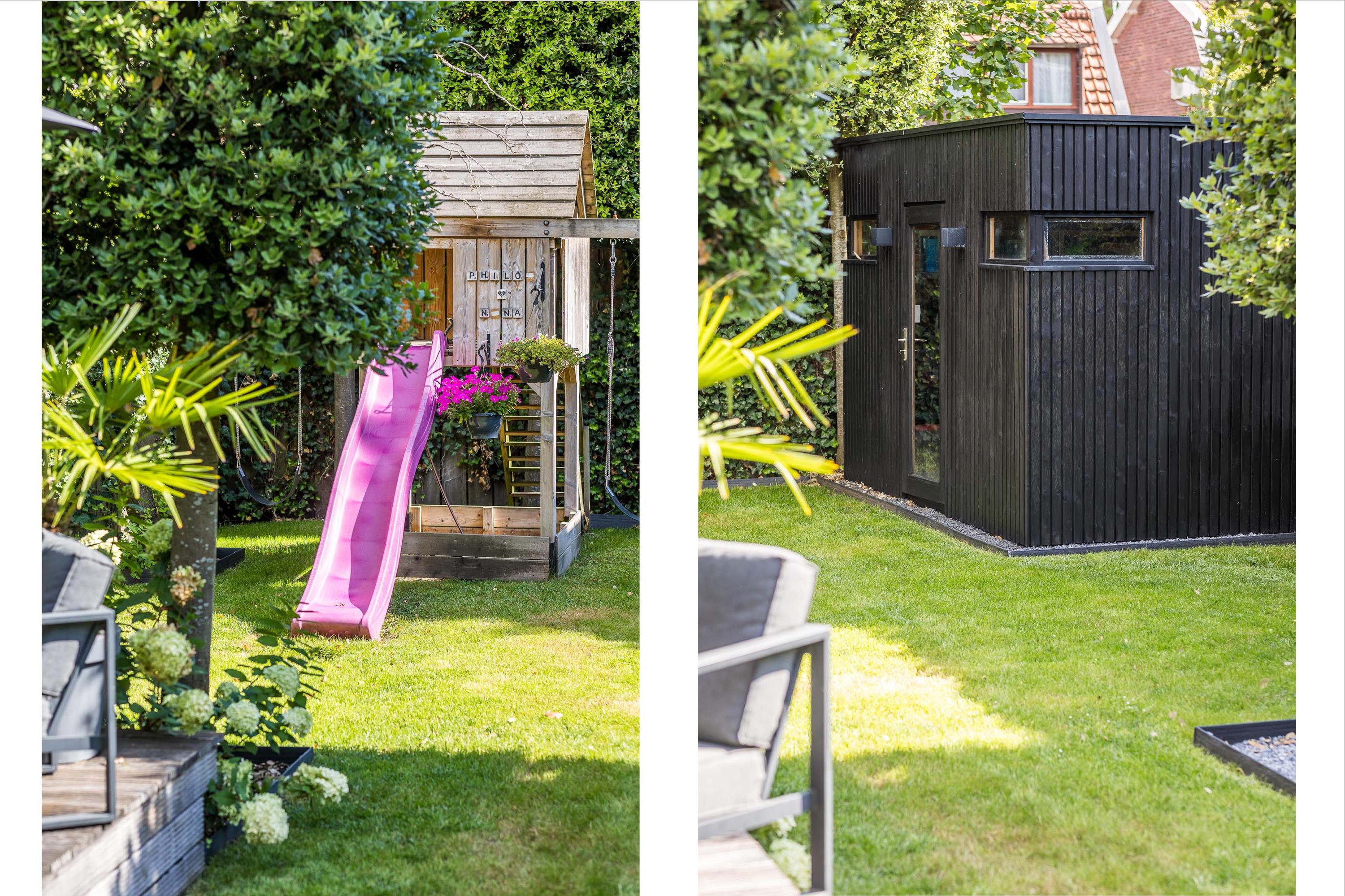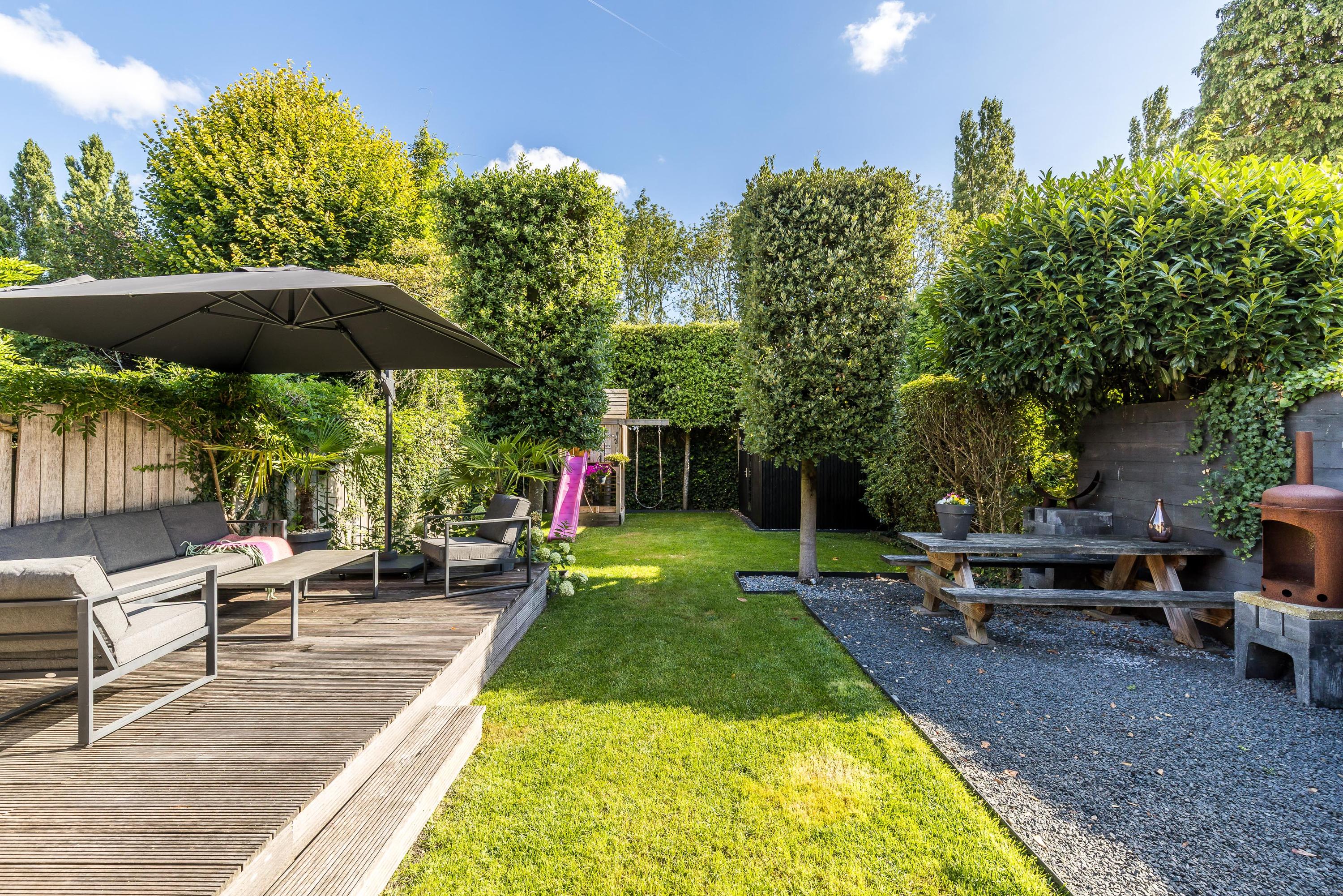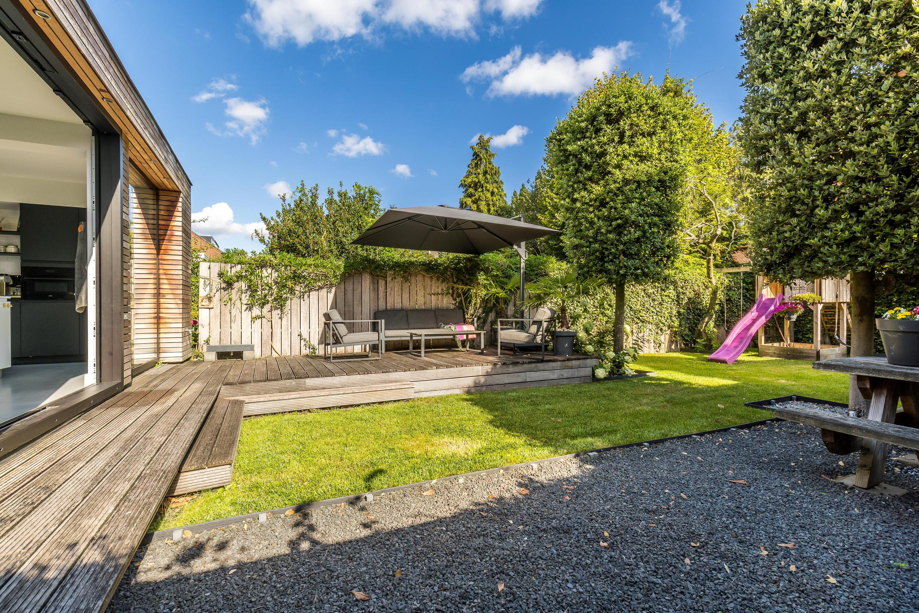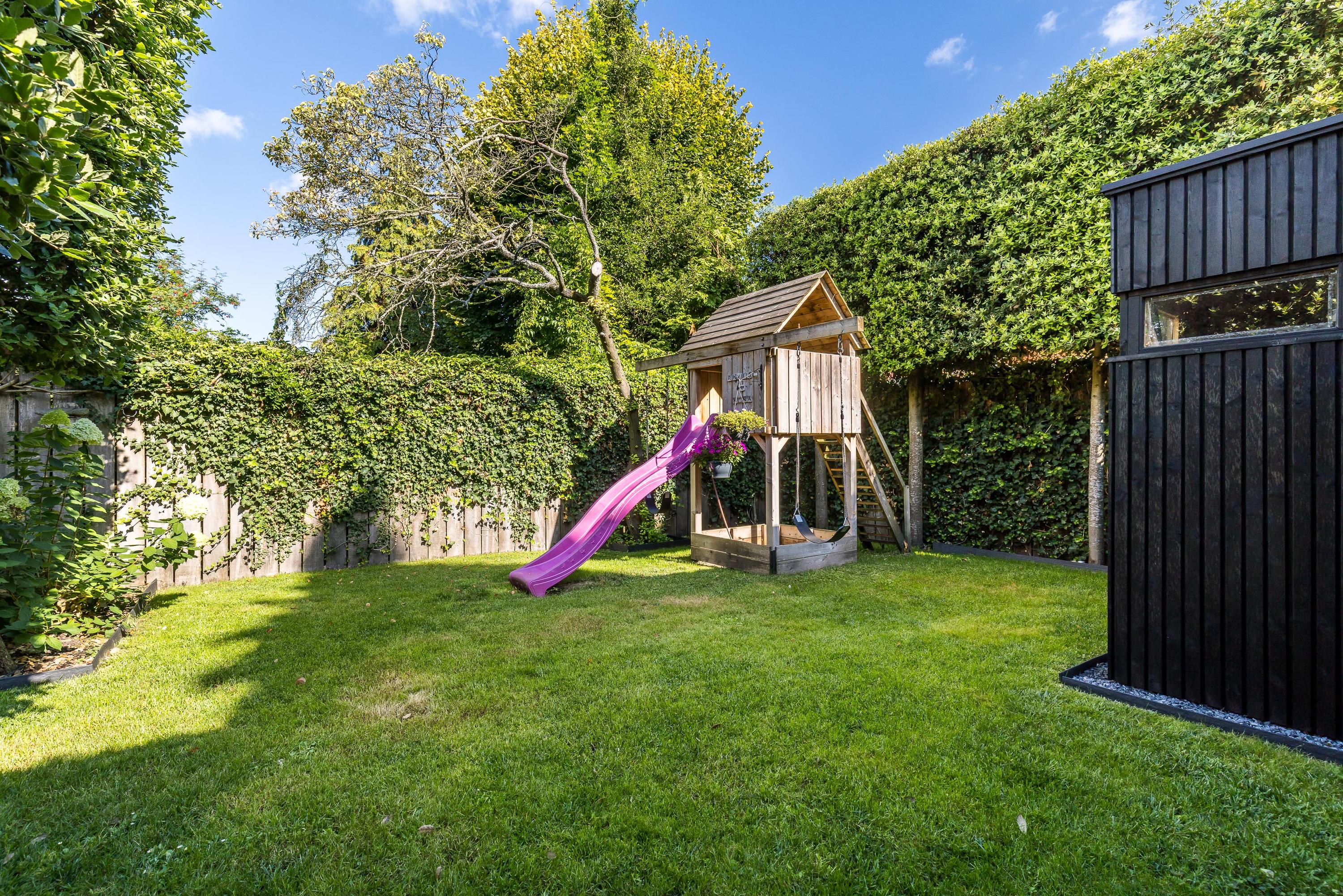 - Beautifully landscaped, sunny, and child-friendly back garden with play structure