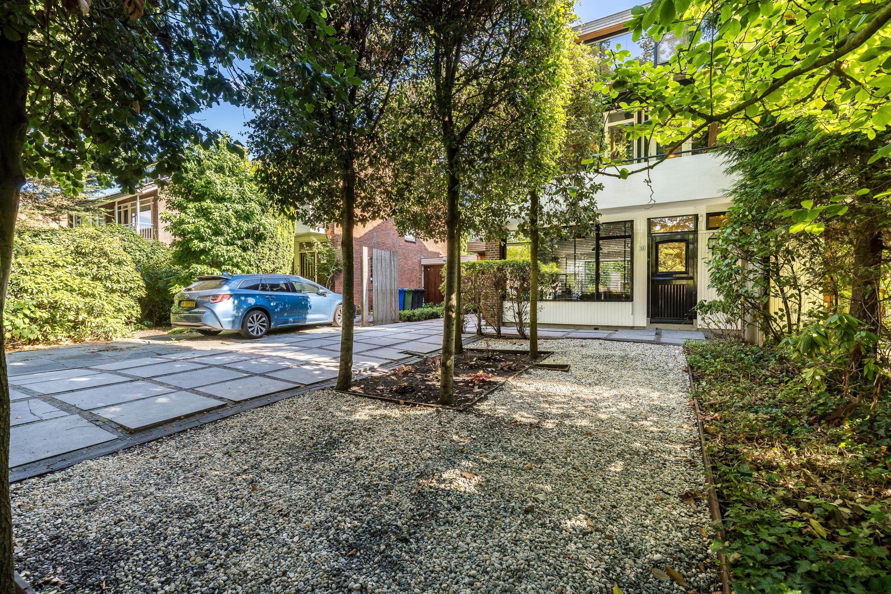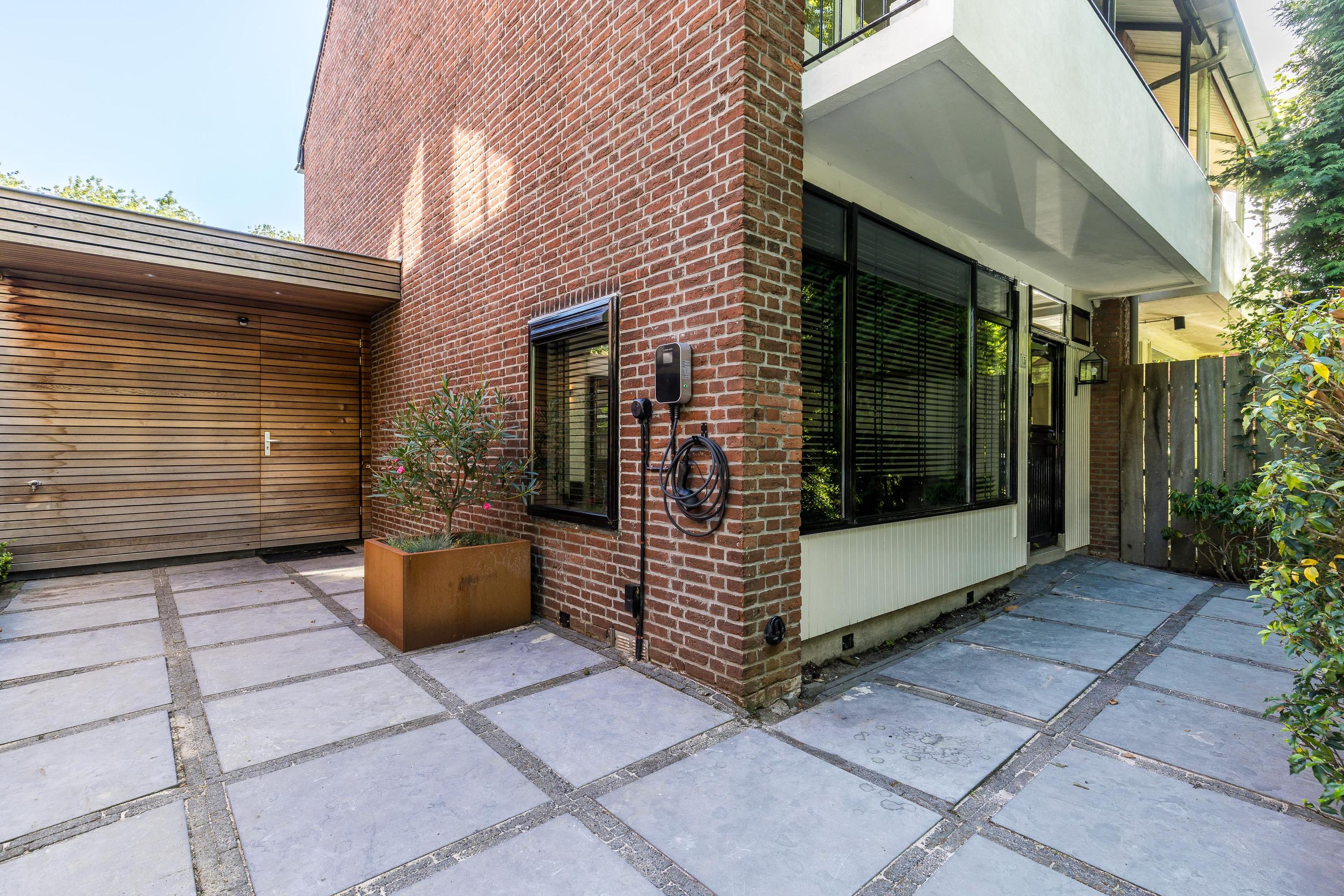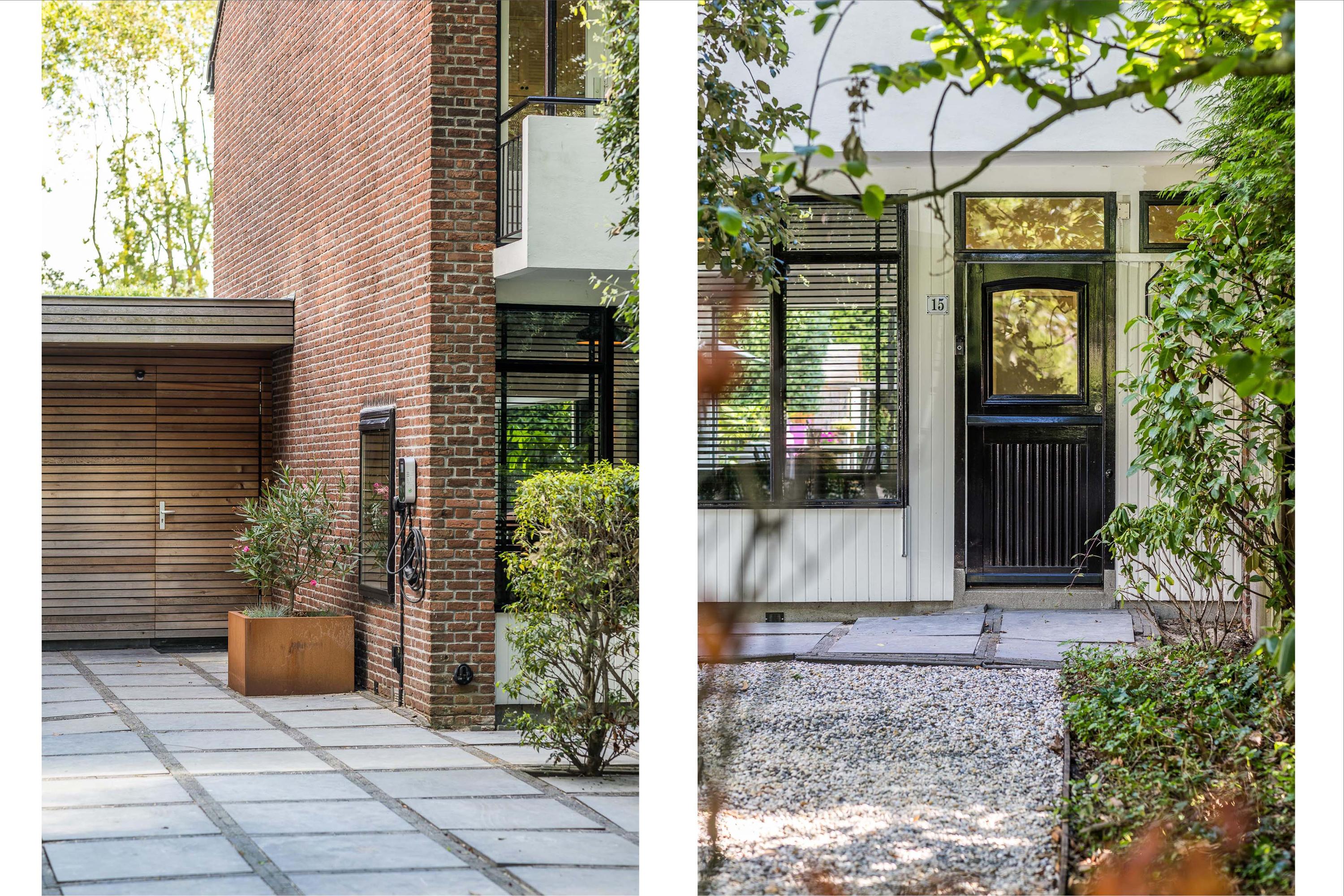 The spacious, beautifully landscaped front garden offers not only a welcoming entrance but also great convenience. There is private parking for two cars, an EV charging station, and ample space for bicycles.