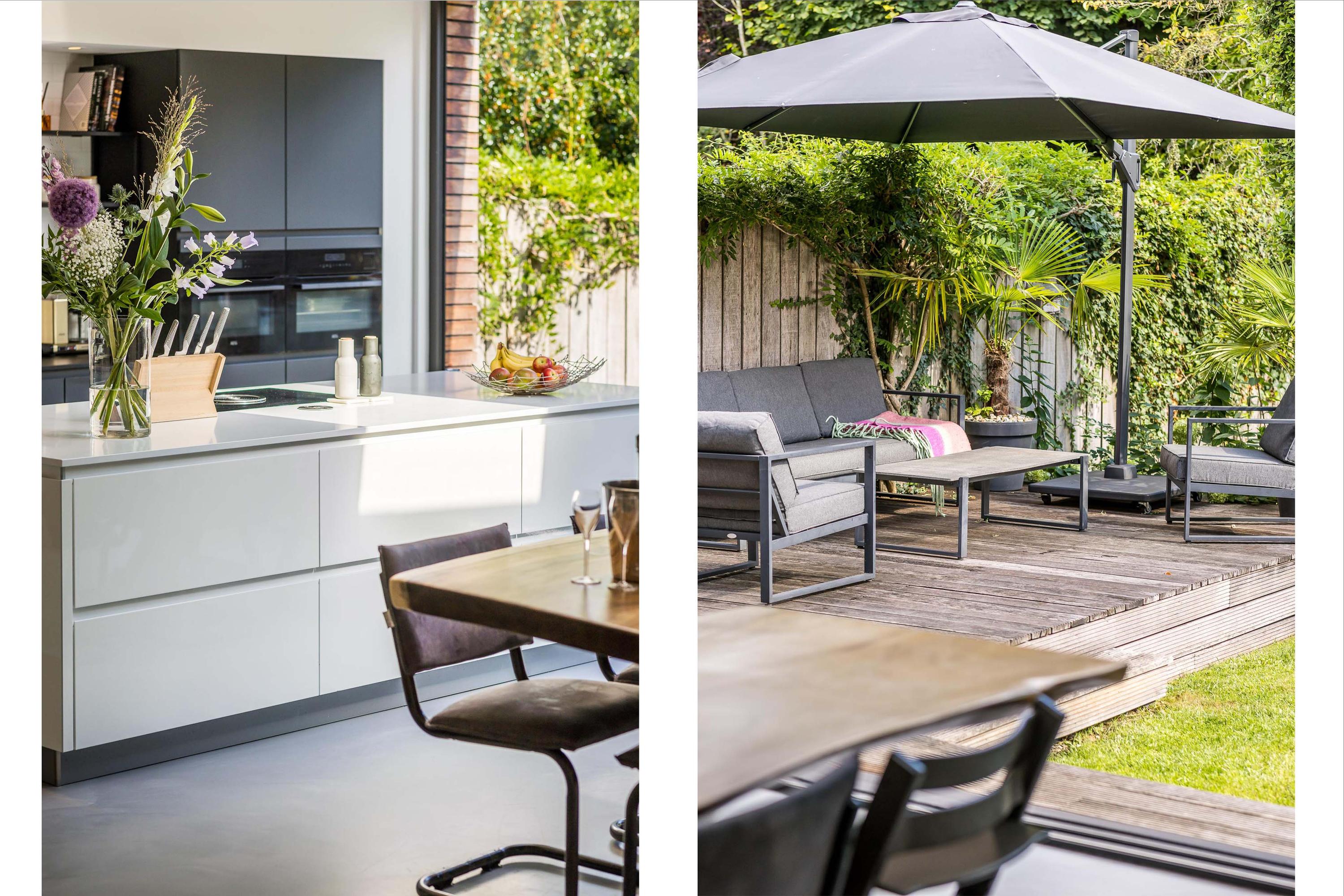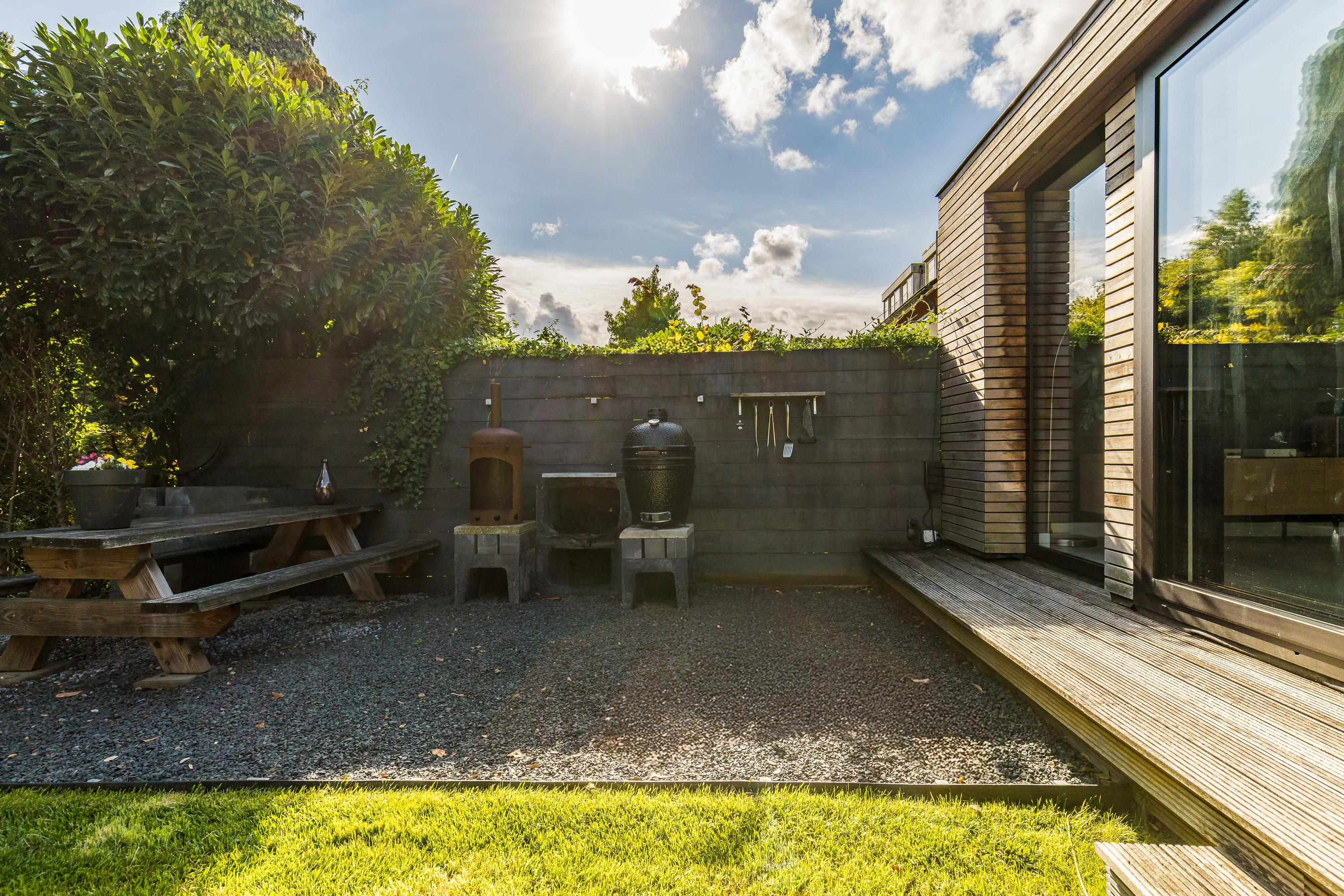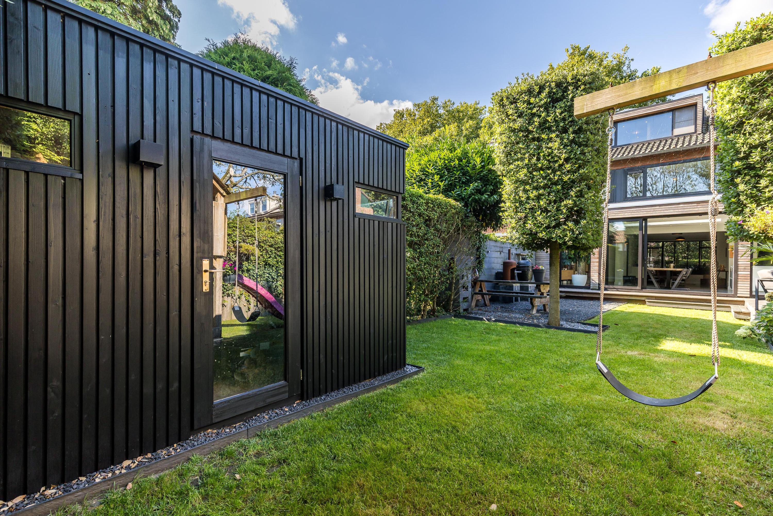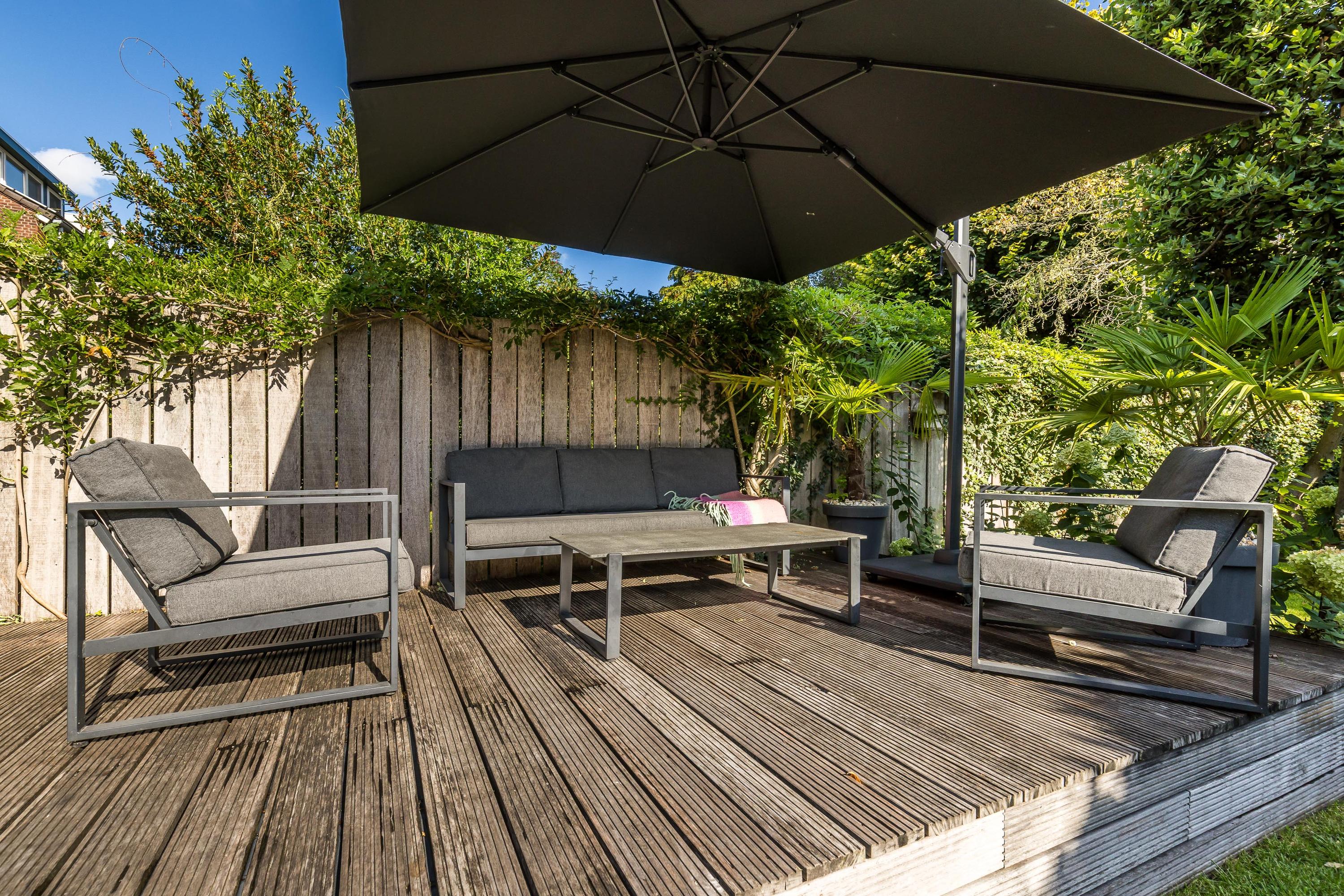 The sunny, deep back garden is beautifully landscaped and child-friendly. There is no rear entrance, offering complete privacy and safety. A play structure is available for children, and there's ample space for adults to enjoy the sun and privacy. The garden also includes a modern shed and atmospheric lighting with a timer switch.