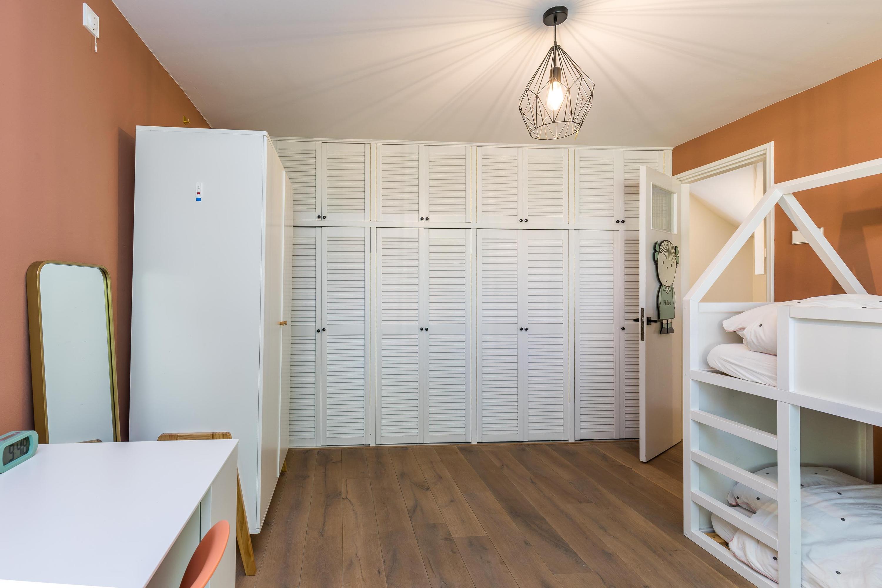 The first floor features two spacious bedrooms and a third, smaller room, ideal as a child’s bedroom or home office. The bathroom is neatly finished and includes a bathtub, perfect for families. A large built-in wardrobe provides additional storage.
