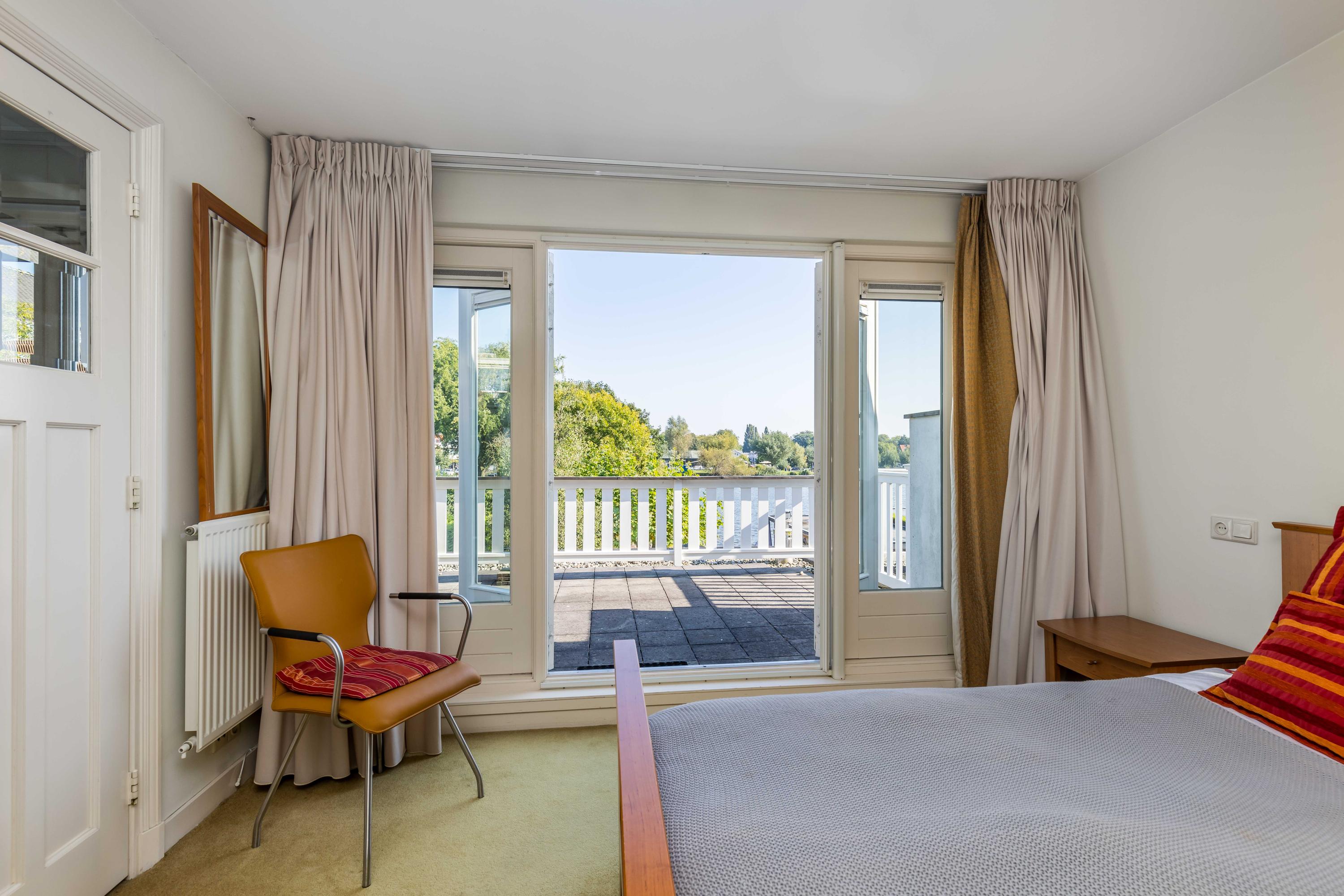 ground floor: entrance, vestibule with original marble wainscoting, granite floor and stained glass windows and draught door, hall with staircase, extra spacious toilet with toilet and washbasin, double doors to the living room and kitchen, originally the kitchen was at the rear, but now the open kitchen is at the front, which gives the extended living room a width of almost 6 meters over the entire width of the house, the living room has a well-positioned gas fireplace that you can sit around. By means of 2 Sola tubes, a surprising amount of extra daylight enters the living room. From the living room, patio doors give access to the terrace and the back garden (also largely piled) with, among other things, a terrace/deck on the water where you can relax. There is room for 1 sloop/boat at the jetty.