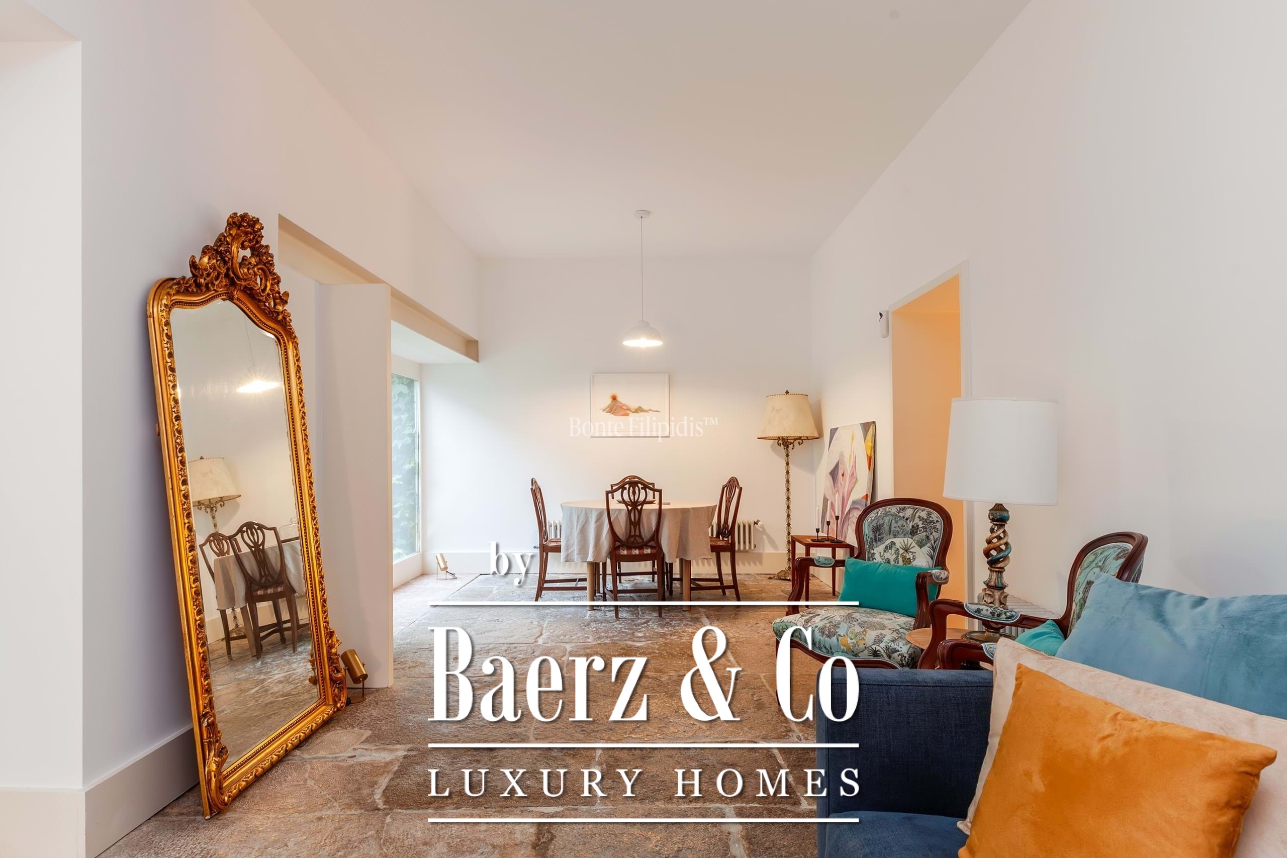 The primary living spaces are marked by original stone flooring and softly vintage accents, with large panoramic windows drawing natural light into the open-plan social area. Here, living and dining zones flow seamlessly out to an 80 m² private garden, a tranquil retreat bordered by mature greenery for quiet moments or reserved gatherings. Subtle material choices and precise detailing lend an understated sophistication to every space.