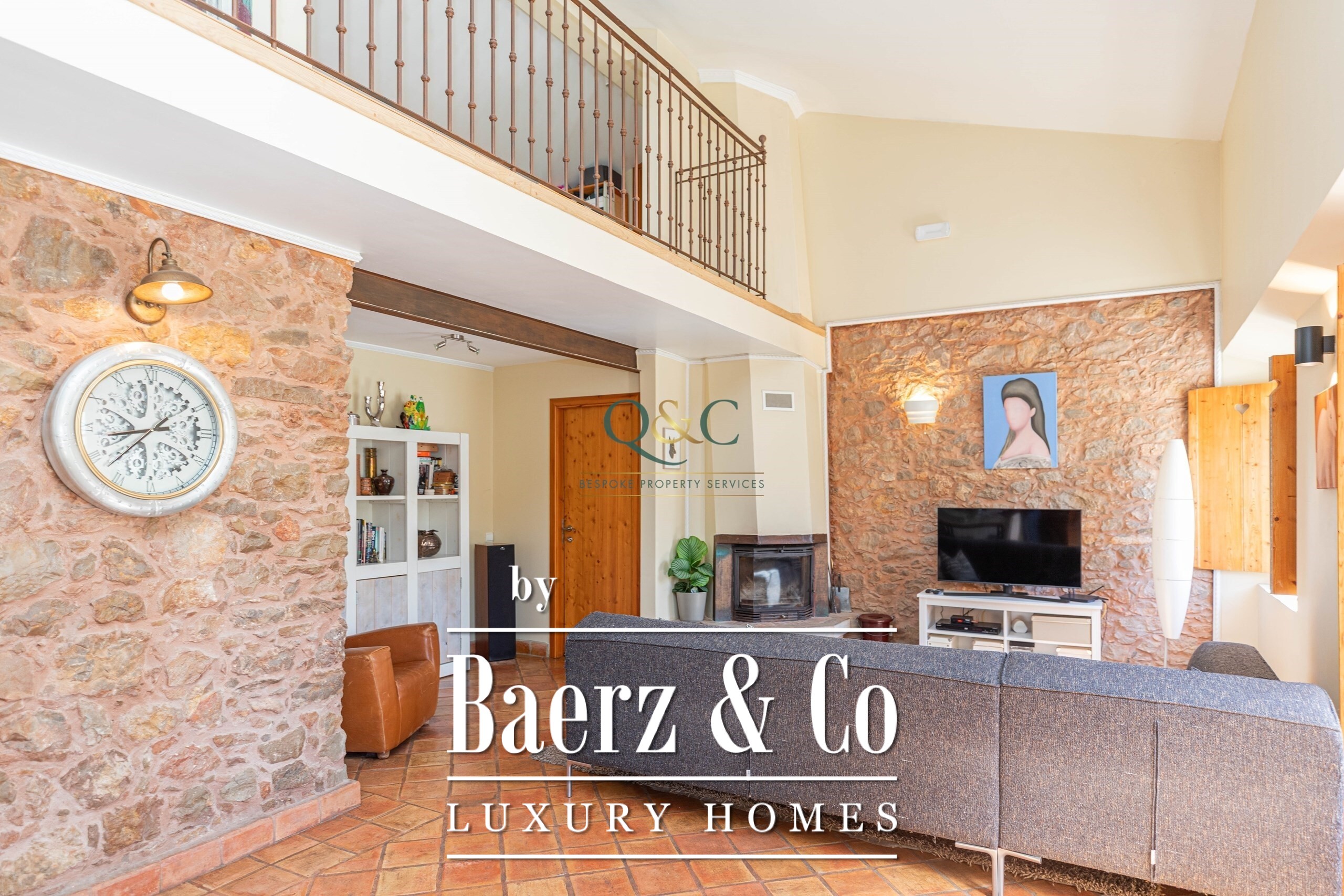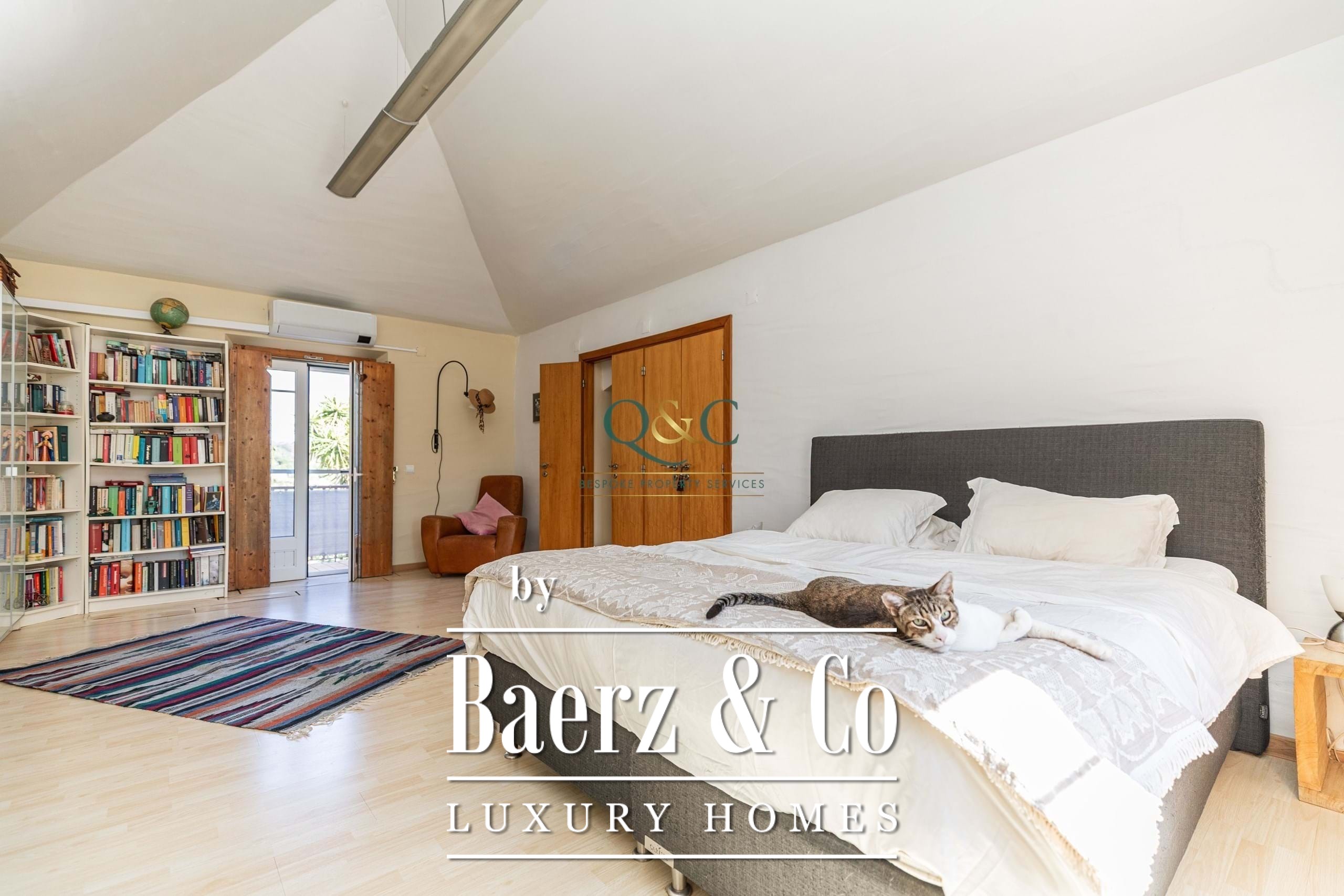The right wing offers another equipped kitchen, dining room and living room with a cosy fireplace, three additional bedrooms, three bathrooms and plenty of storage space. The high ceilings with natural stone details create an inviting space.