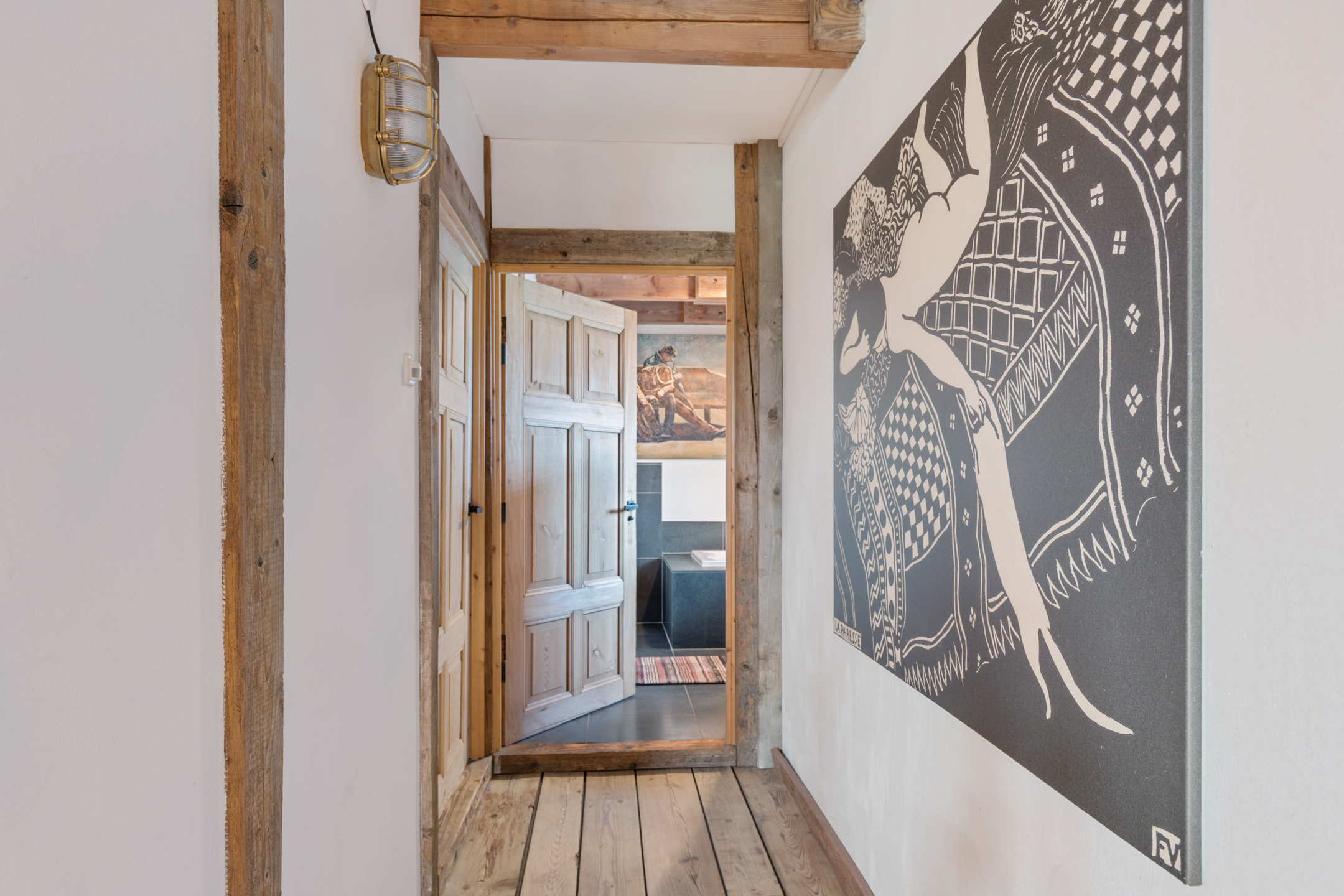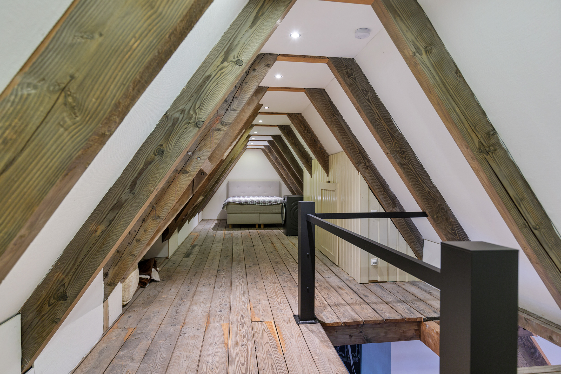 From the landing the technical room is accessible, housing the Nefit combi boiler (2024). The floors on this level are finished with solid pine boards.