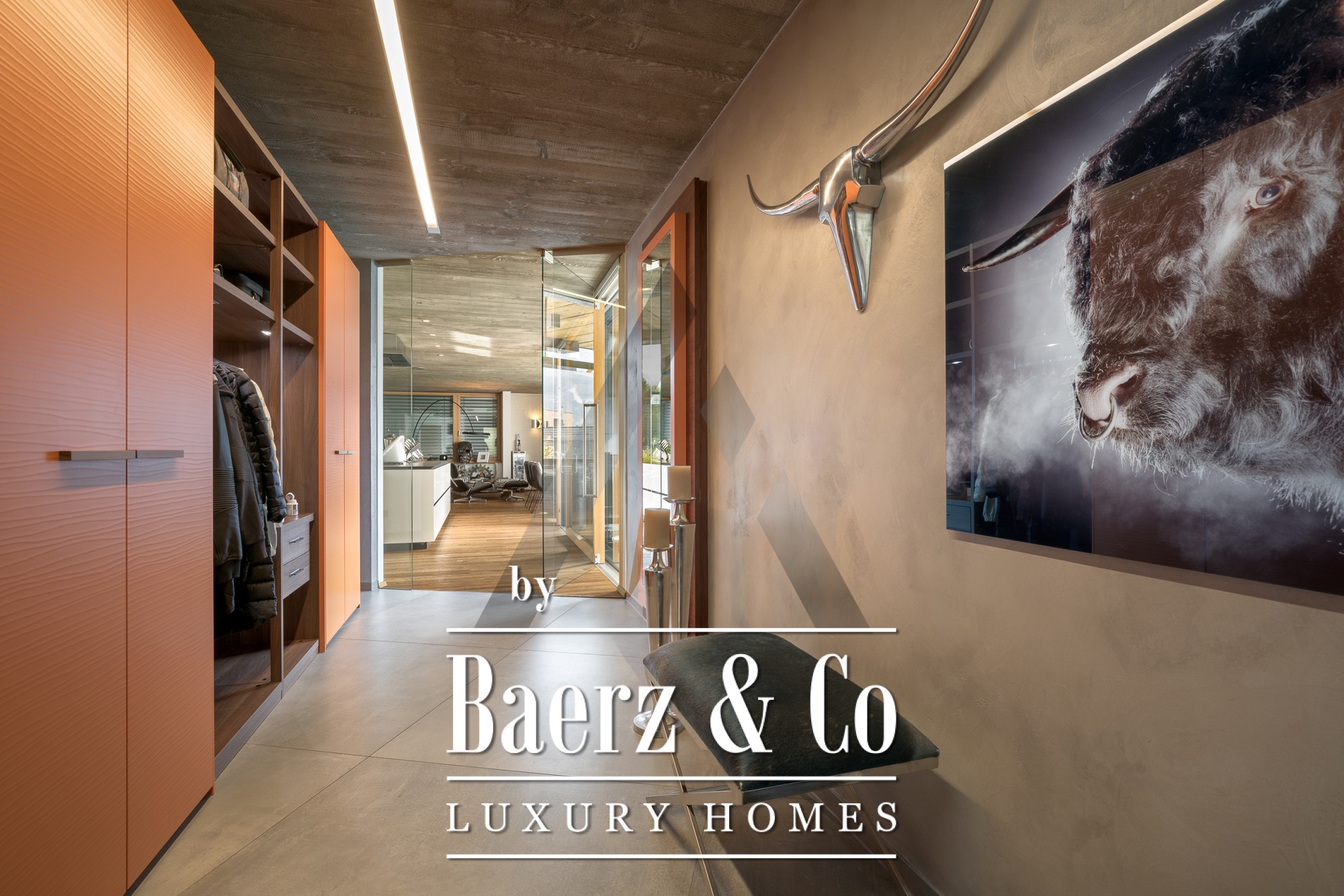 Detached house St. Johann in Tirol is set in a tranquil, sun-drenched position, offering sweeping views of the Kitzbühel Horn and Wilder Kaiser mountains. This contemporary property, offering 418 m² of living space on a 1,186 m² plot, captures the essence of refined alpine living. An idyllic landscape unfolds with a pond, landscaped streams, expansive terraces, and panoramic mountain vistas. The outdoor realm is enhanced by a stainless steel pool, a Treesse designer whirlpool, and a sauna, inviting leisurely mornings and restorative afternoons.