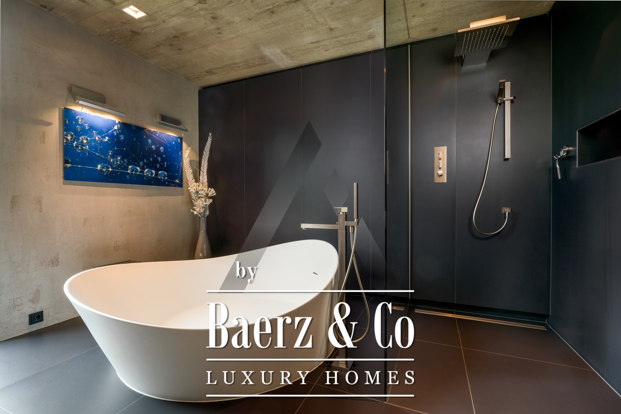 Inside, exposed concrete ceilings and reclaimed oak flooring introduce a subtle sophistication. The open-plan ground floor forms the heart of the home, where panoramic windows fill the living, dining, and designer Miele kitchen spaces with natural light. The ground level accommodates a master suite with dressing room, children's bedroom, ample bathrooms, and seamless storage. Upstairs, a separate apartment features two bedrooms, a living area with a fireplace, and a roof terrace that frames the mountain horizon. Completing the upper floor is an 18 m², fully air-conditioned fitness suite opening to its own terrace.