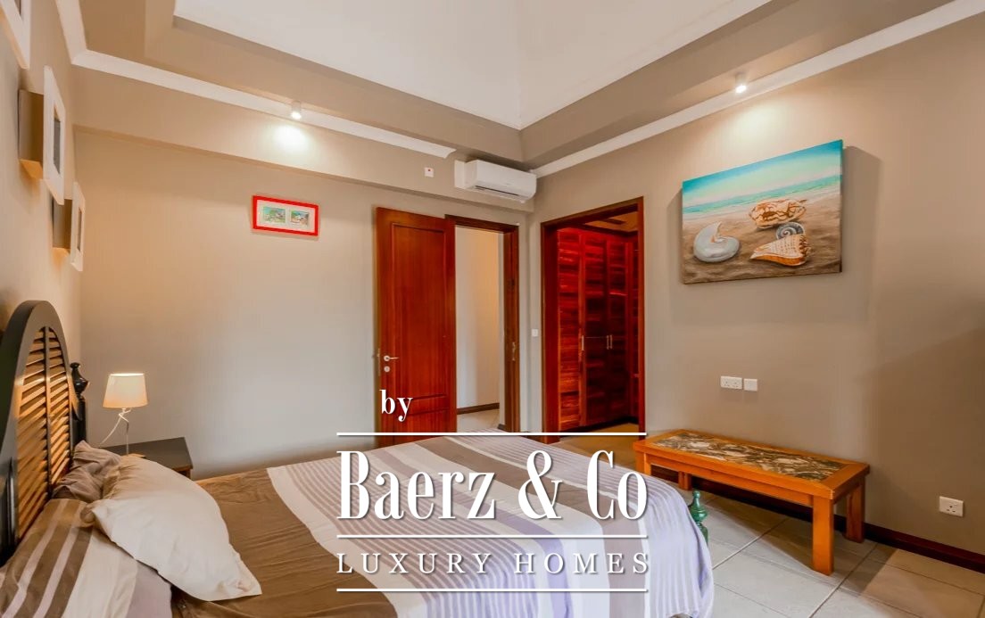 Thoughtful amenities ensure a refined experience, with an office, terrace, double garage, and carport for an electric golf cart. Residence within this privileged estate grants access to an 18-hole golf course, boutique hotel, and a private beach—reserved for owners. This luxury villa for sale in Tamarin links elegance, privacy, and access to leisure, rendering it a rare address in Mauritius.