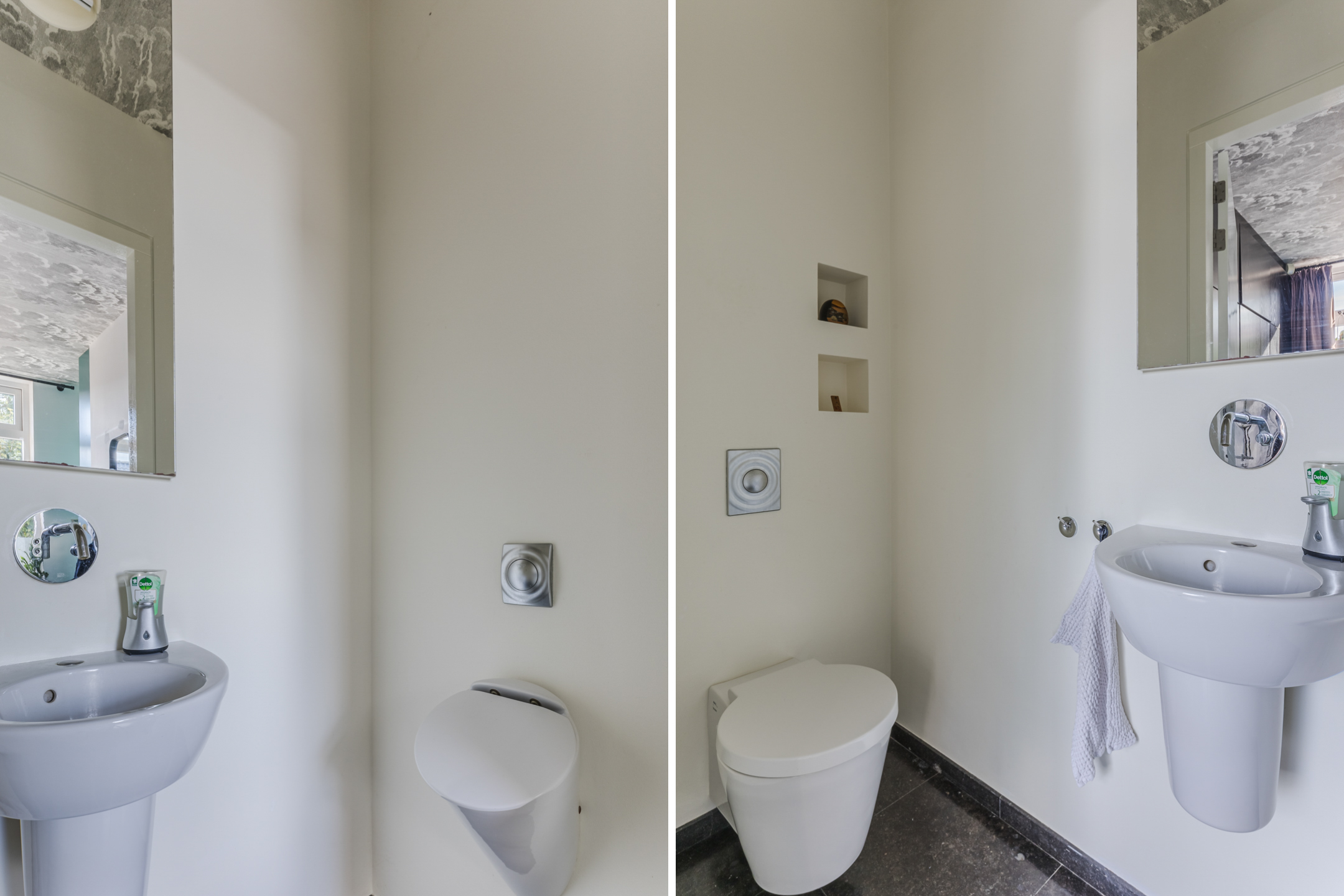 The modern, luxurious kitchen is both stylish and functional, offering generous space and beautiful views of the garden—perfect for relaxed dining. The kitchen is equipped with built-in appliances including a ceramic oven, combination oven-microwave, steam oven, American-style fridge (with water connection) and a Quooker tap. Provisions are also in place for a built-in coffee machine.
