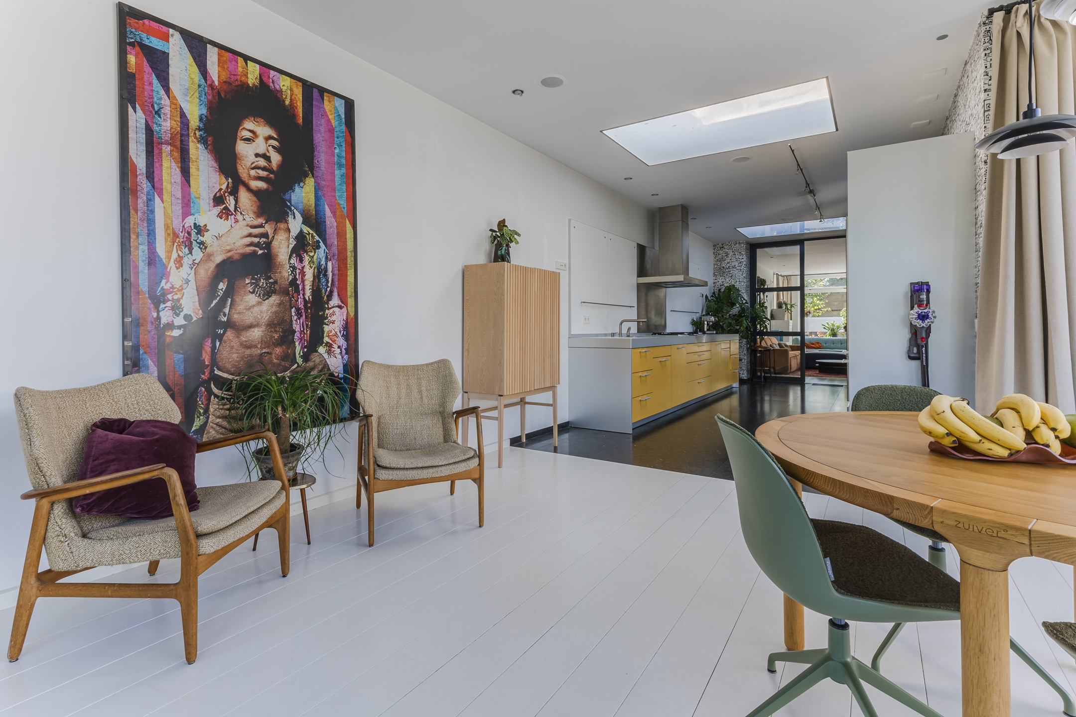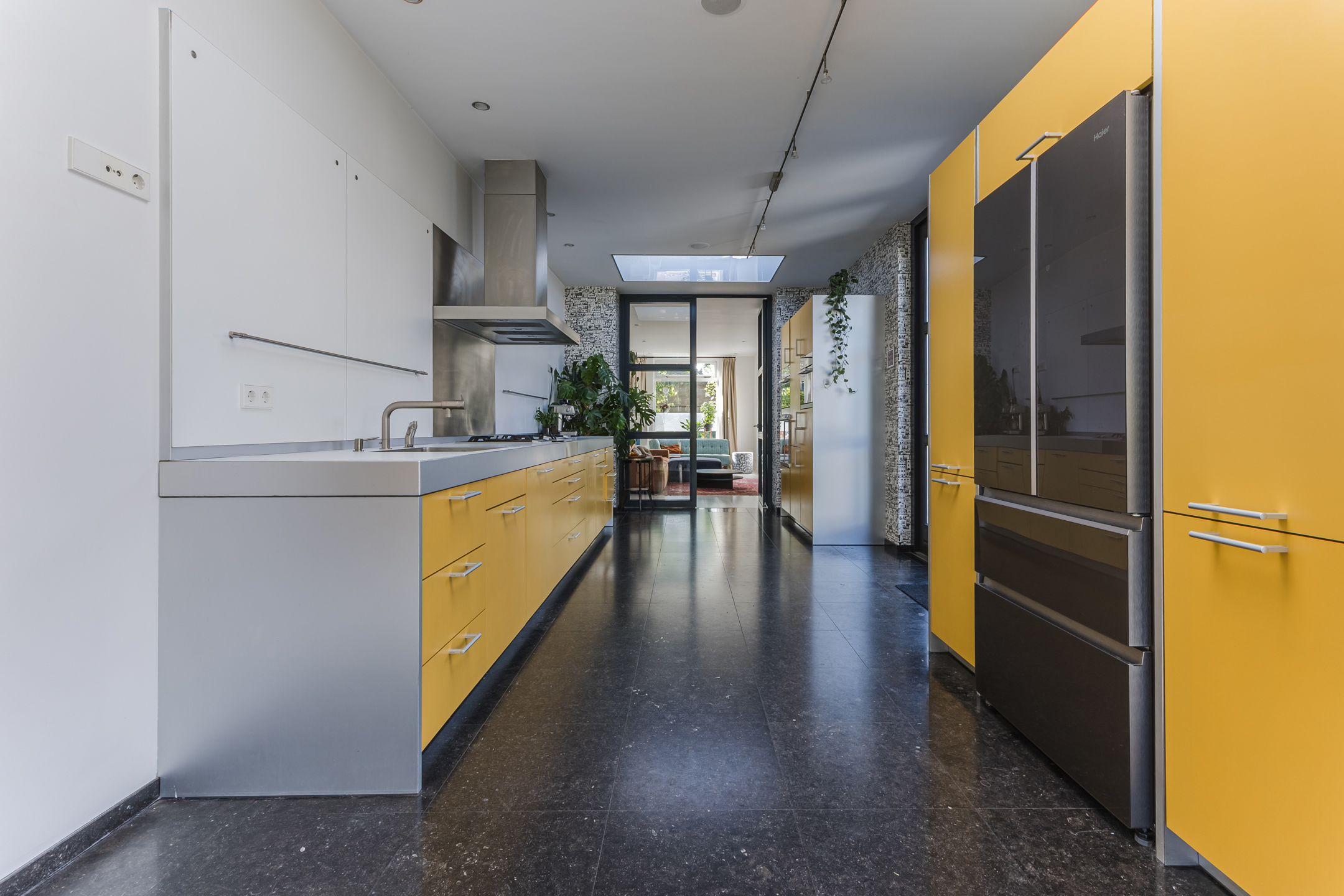 The spacious living area benefits from abundant natural light, underfloor heating, and a gas fireplace. The living room connects openly to the kitchen-diner but can be separated by elegant pivot doors. A practical cellar provides additional storage, and the unique raised room (opkamer) offers access to the first floor.