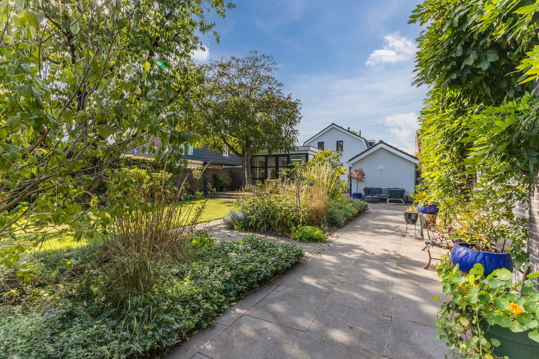 The beautifully landscaped garden is a true eye-catcher. With multiple terraces, a lawn, and borders filled with flowers and plants, it’s a wonderful place to relax and enjoy outdoor living. The property also includes a garage and a large driveway with space for multiple cars.