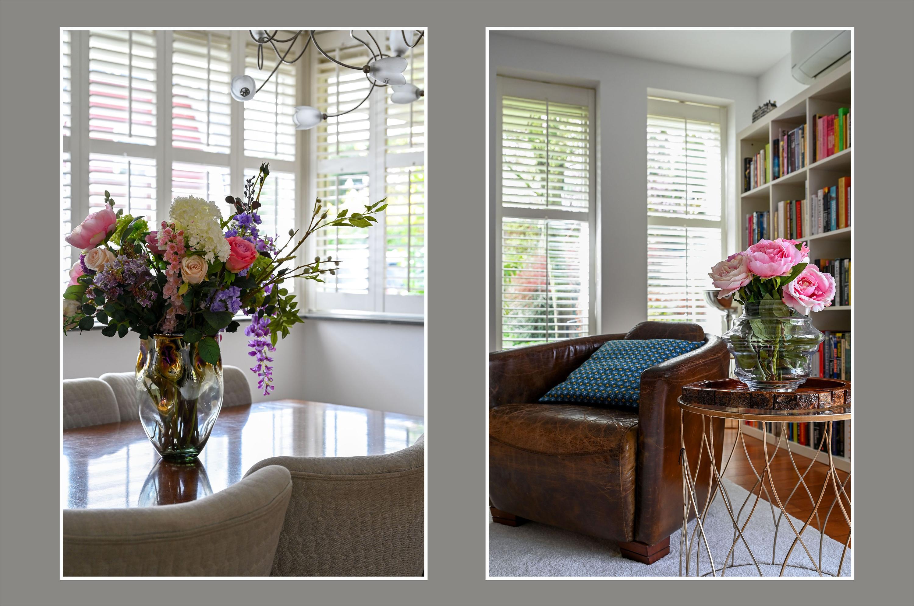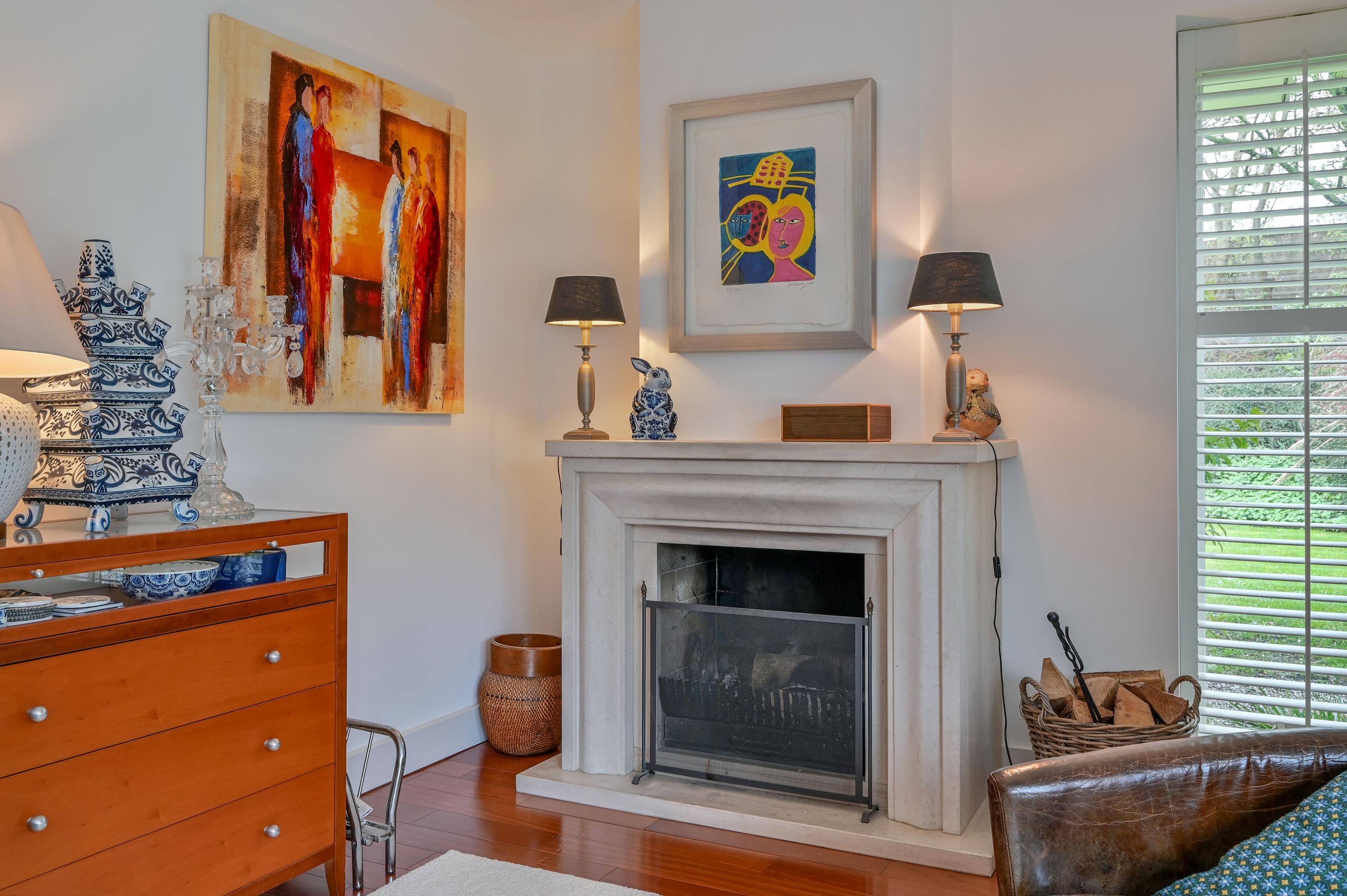 The L-shaped living room at the rear, with a generous seating area, offers beautiful views of the garden and a wide sliding door to the outside. The spacious seating area and a cozy reading corner with a wood-burning stove make it a place to completely unwind. The large side window overlooks the side garden, while shutters, sunscreens, and air conditioning ensure comfort in every season. The entire ground floor is finished with a warm, luxurious wooden floor.
