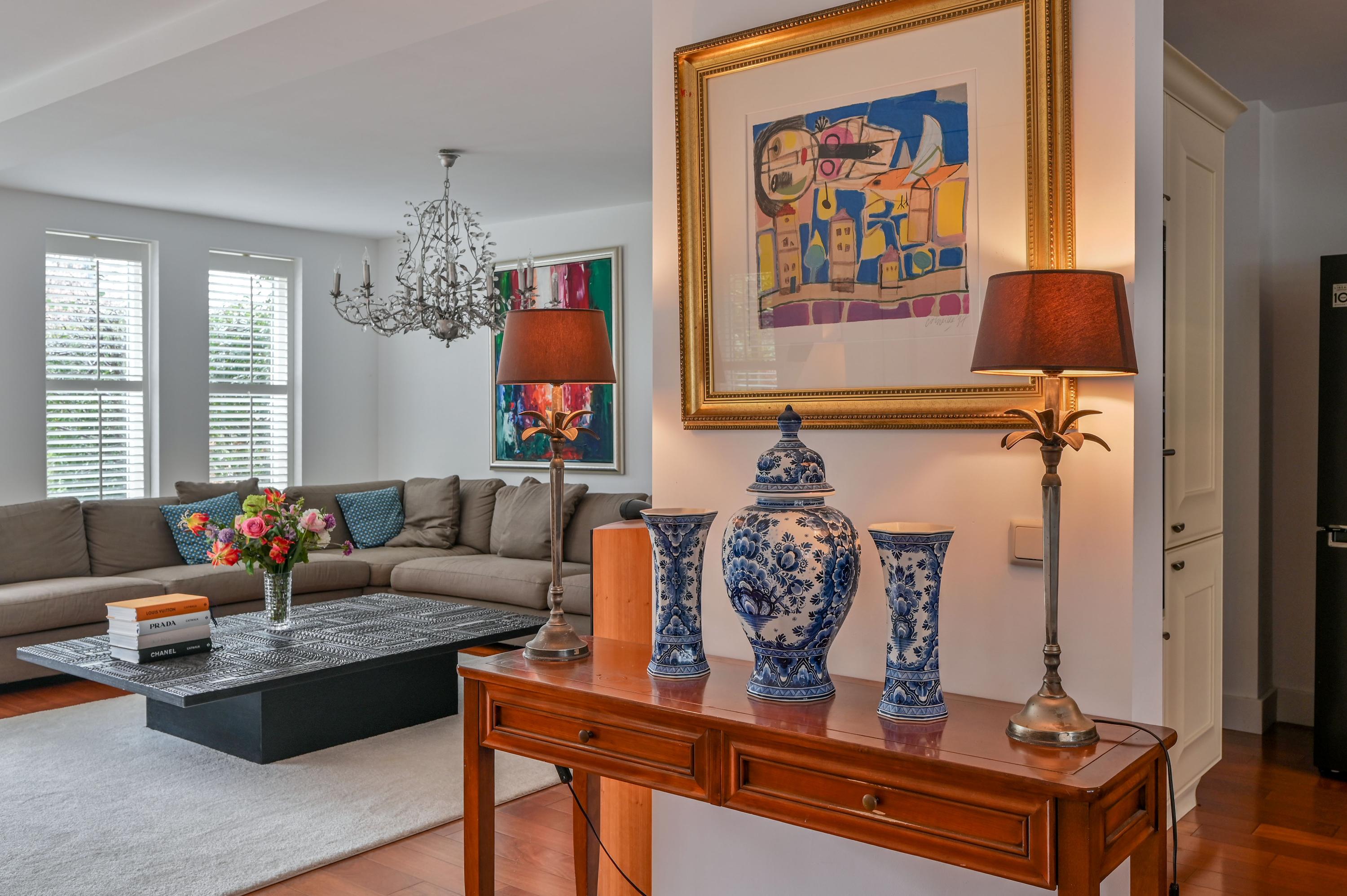 Via the beautifully paved front garden, with a path leading to the side of the house flanked by stately plane trees, you reach the front door. The representative, spacious hall immediately conveys a well-finished impression and provides access to the modern toilet with a sink, the meter cupboard, and the fixed staircase to the first floor. A stylish closed door leads to the impressive living space, where the living room and open-plan kitchen flow seamlessly into each other.
