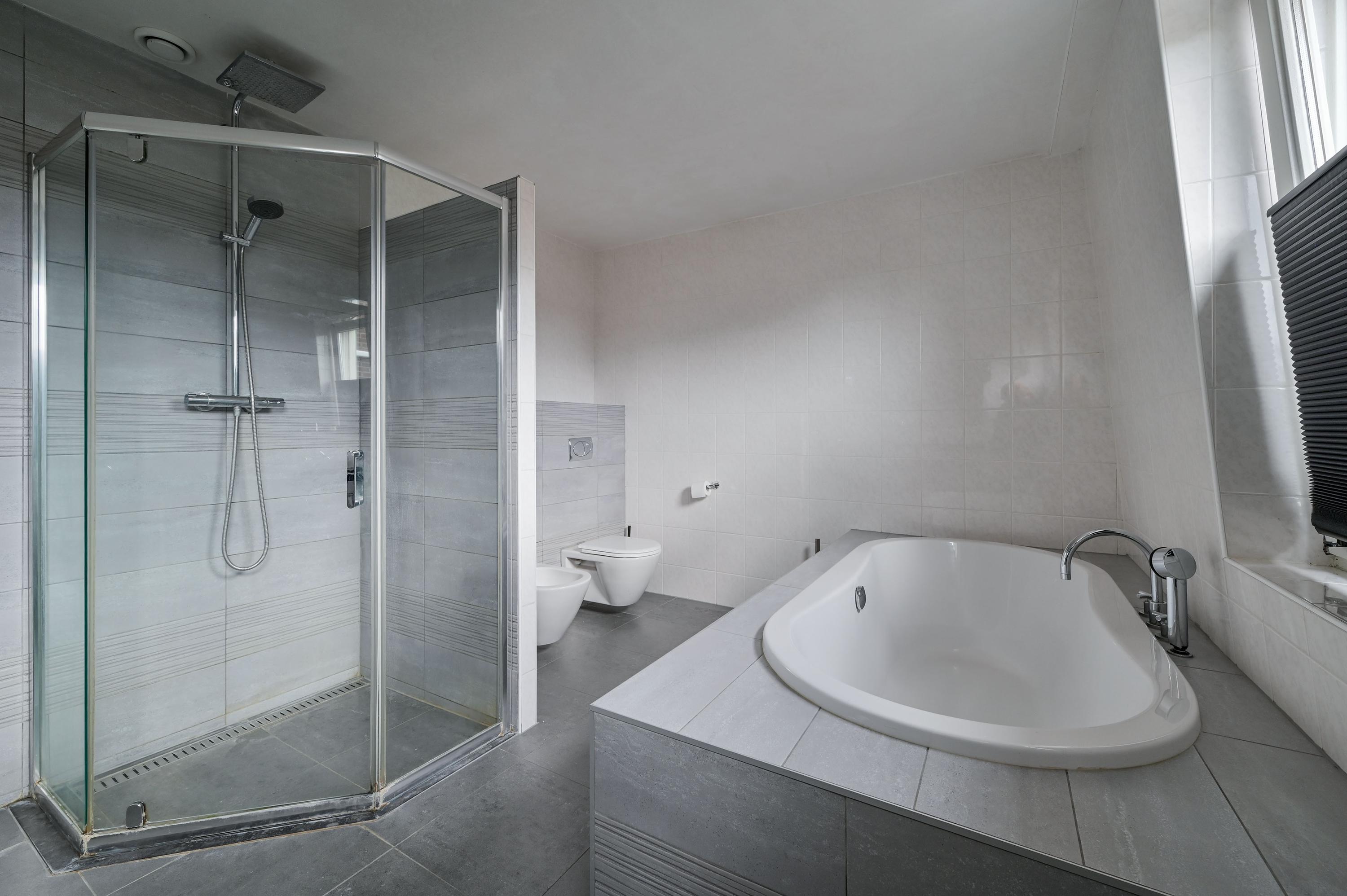 Via an open staircase, you reach the second floor, where the master suite is a true showstopper. This spacious room offers plenty of options for a luxurious and practical layout. The room features an open walk-in closet with a window overlooking the side garden, and a built-in wardrobe – both from the Italian brand Poliform – ensuring stylish and efficient storage. Two front windows and the side window provide ample natural light and are fitted with sunscreens. Laminate flooring and air conditioning complete the space. Due to its generous size, this floor also offers potential to add two attic rooms. Additionally, there is a spacious storage room with central heating and mechanical ventilation unit, ideal for extra storage and practical facilities.