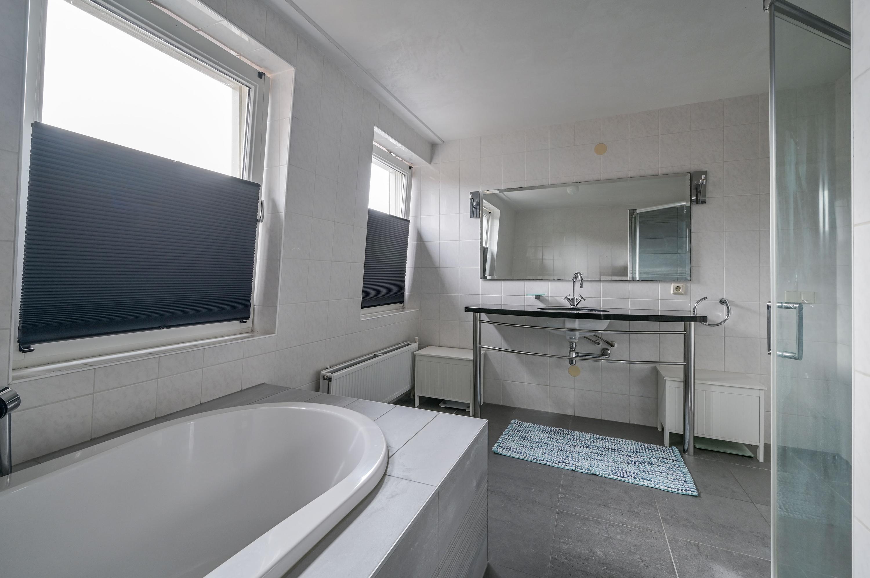 The spacious first-floor hall provides access to three large bedrooms, the stylish bathroom, and the practical laundry room. The spacious L-shaped master bedroom at the front features two large windows and a side window with garden views. The adjacent bathroom is equipped with a generous bathtub, modern shower, illuminated sink, toilet, and bidet – a space that perfectly combines luxury and functionality.