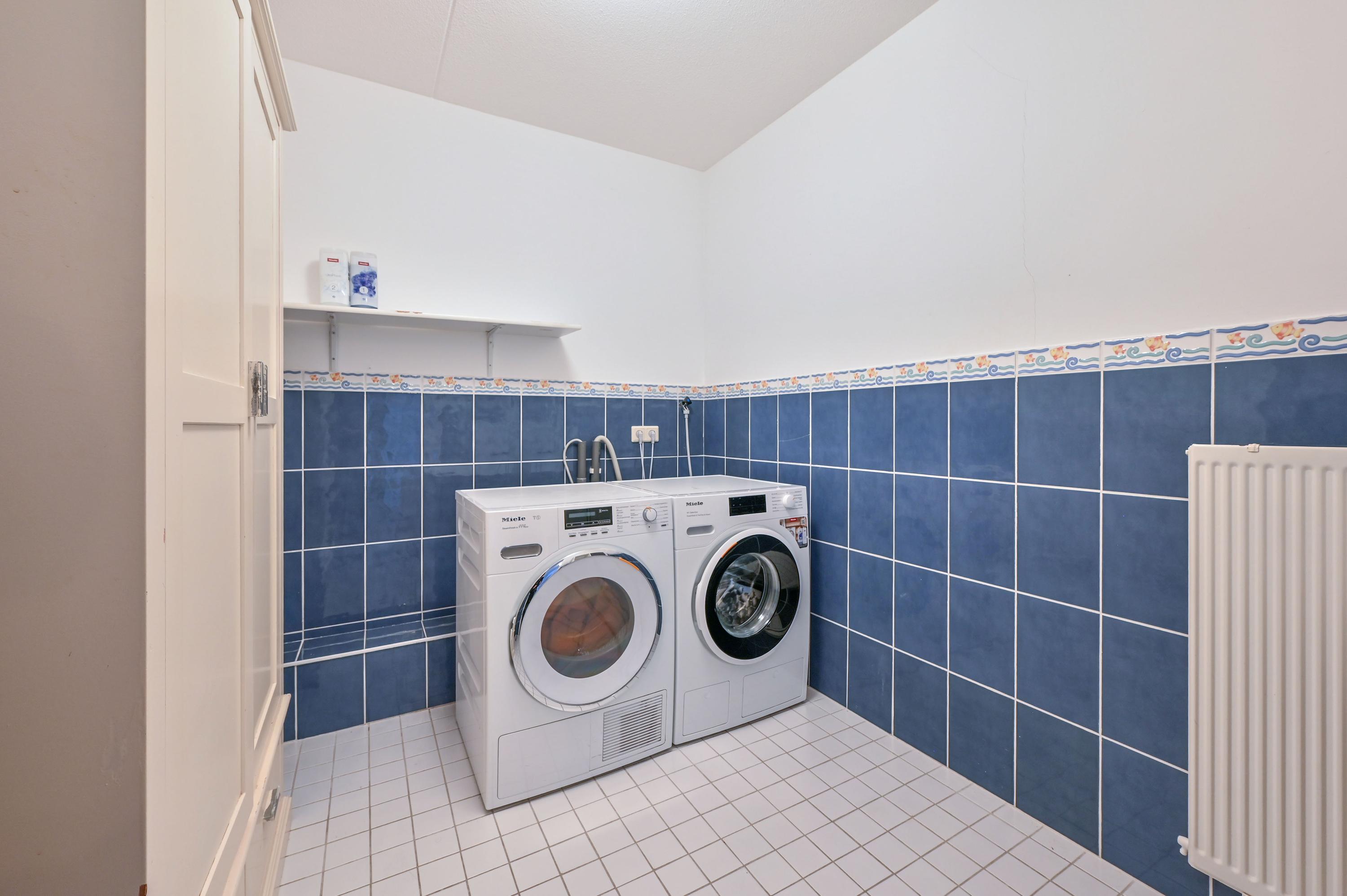 The kitchen at the front is bright and spacious, with large windows and a corner window at the dining area fitted with charming shutters – an ideal spot for cozy meals. The country-style kitchen features a central island with an induction hob and practical drawers on both sides, complemented by an elegant wine rack. The L-shaped countertop provides ample space and is equipped with luxury built-in appliances, including a grill plate, fryer with extractor hood, and built-in food processor. At the window side, there is the sink area with a double sink, Quooker, and dishwasher. A large cabinet wall with a combination microwave, additional oven on the other side of the kitchen, and space for a large double fridge/freezer with ice machine (available for takeover) completes the setup. Under the stairs, there is also a convenient cupboard for coats and extra storage.