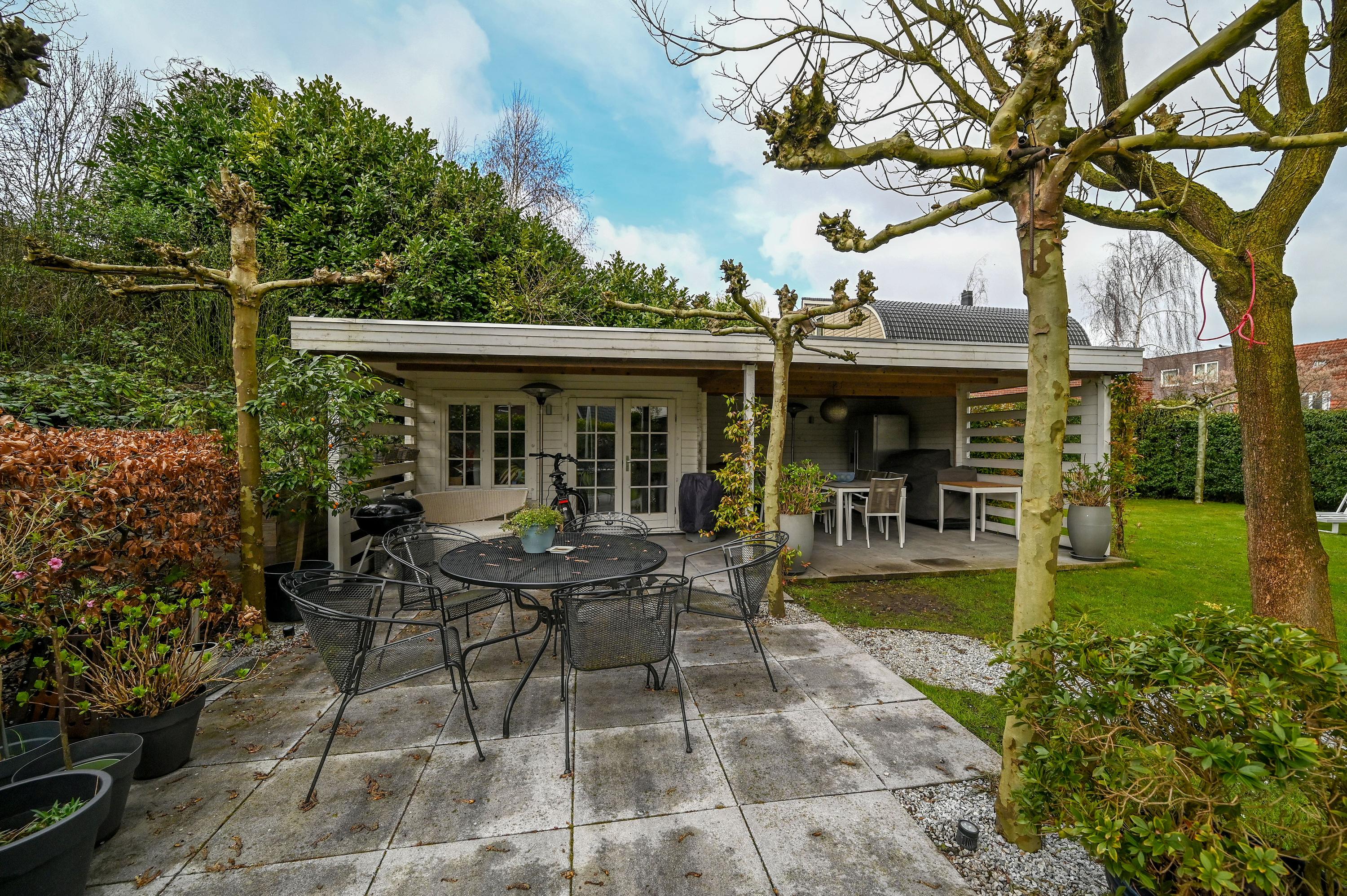 The beautiful garden is a true outdoor paradise, directly accessible via the sliding doors in the living room and via the side of the house through a charming open gate. The garden offers plenty of privacy and enjoys sunlight throughout the day, perfect for enjoying the outdoors. At the rear, there is a spacious terrace with a cozy seating area, complete with an awning spanning the full width of the house, ideal for both sun and shade. At the back of the garden stands a charming garden house with a covered area, perfect for a dining area with barbecue. The garden house features a neat wooden floor, electricity, and water, making it perfect as a workspace, hobby room, or for storage. Adjacent to the covered area is an additional terrace with seating, sheltered by a natural canopy of four beautiful plane trees, creating an idyllic spot to relax or entertain guests.