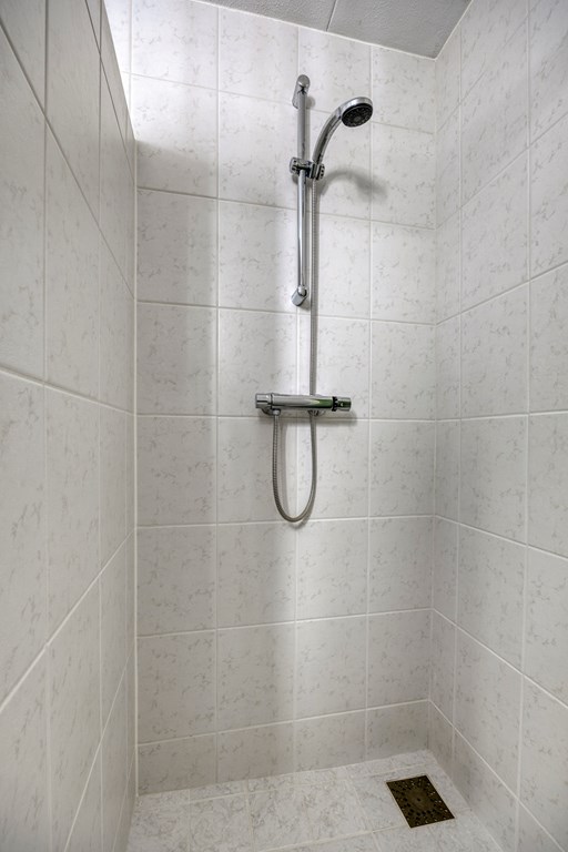 The landing on the first floor is surprisingly spacious and provides access to two comfortable bedrooms. The front bedroom is extra large with a view over the quiet street. At the rear is another full-size bedroom with a built-in wall wardrobe. The bathroom is fresh and functional, fitted with a bathtub, separate shower, double washbasin, second toilet, and a large window for abundant daylight.