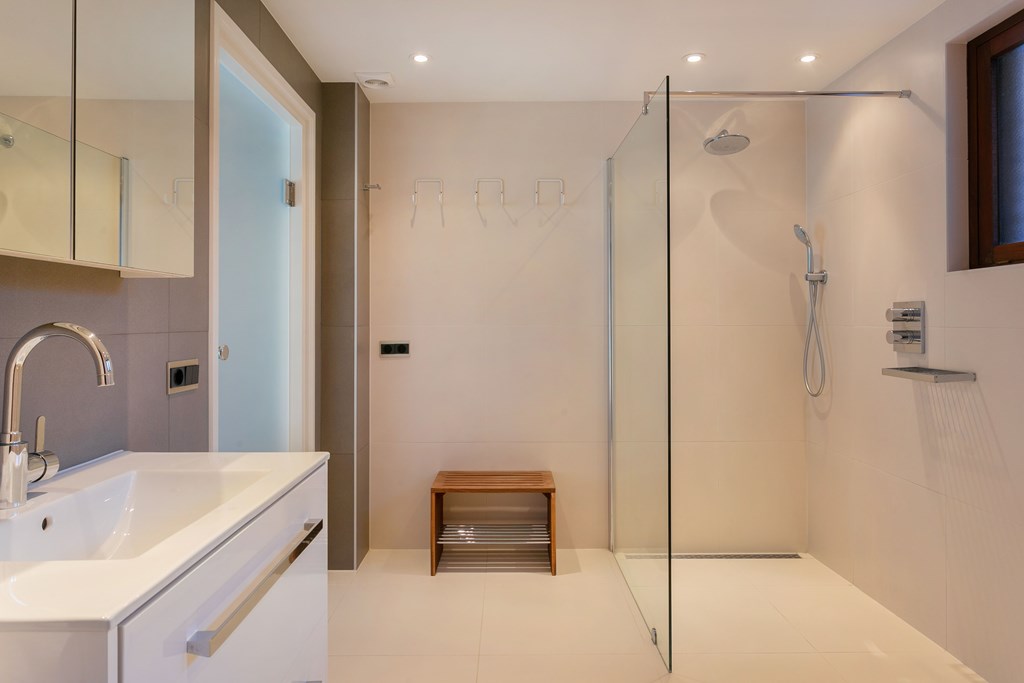 The ground floor hosts three bedrooms, three bathrooms, a live-in kitchen, study, utility room, and a double integral garage of 41 m². Upstairs, two further bedrooms, a hobby room, and a home office enhance versatility. Throughout, durable materials such as French slate, Alerce hardwood, glazed brick, and poured resin floors define a sophisticated yet understated aesthetic. Energy class C is maintained by insulation and 29 discreet solar panels, while zoned heating and cooling ensure comfort in every section.