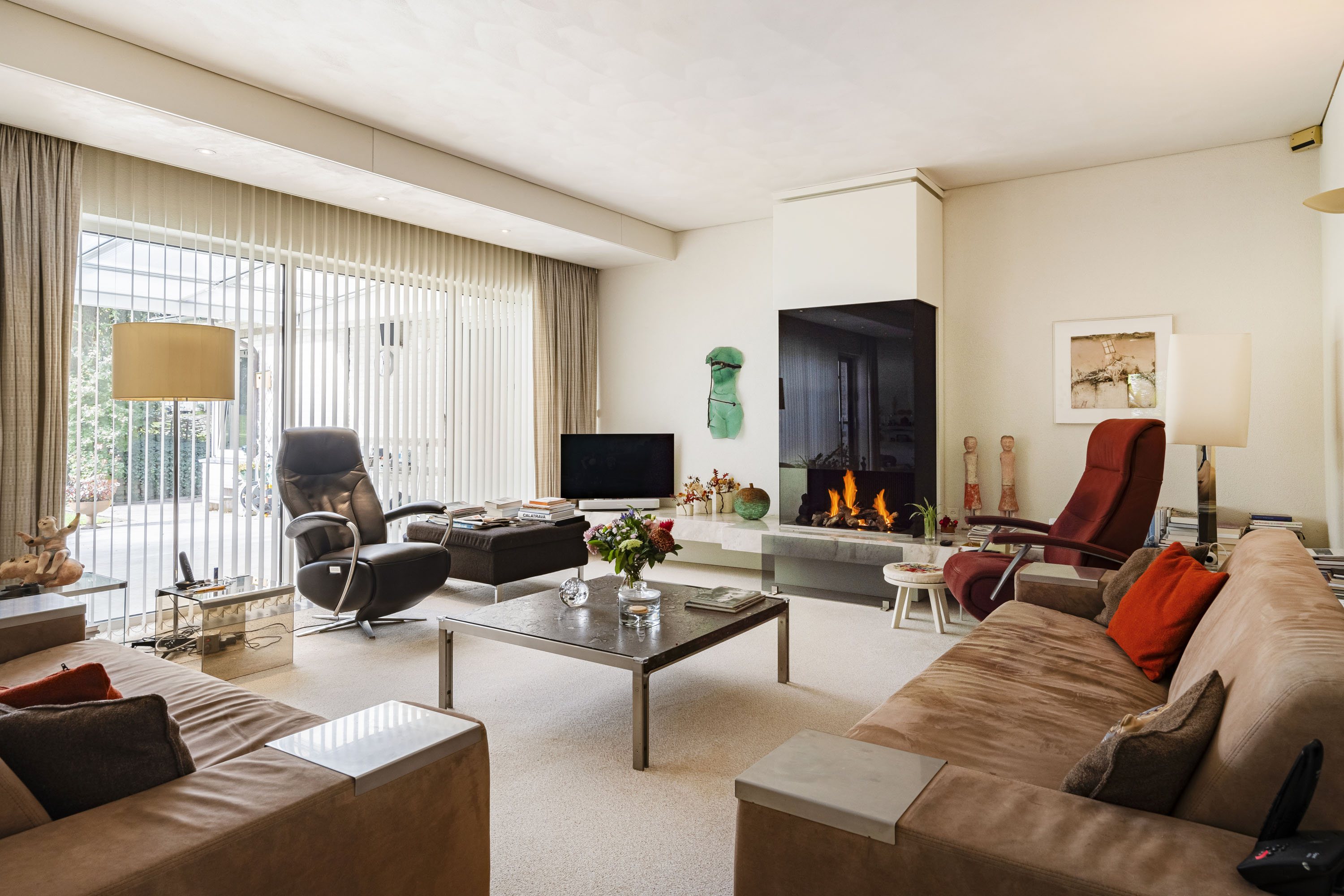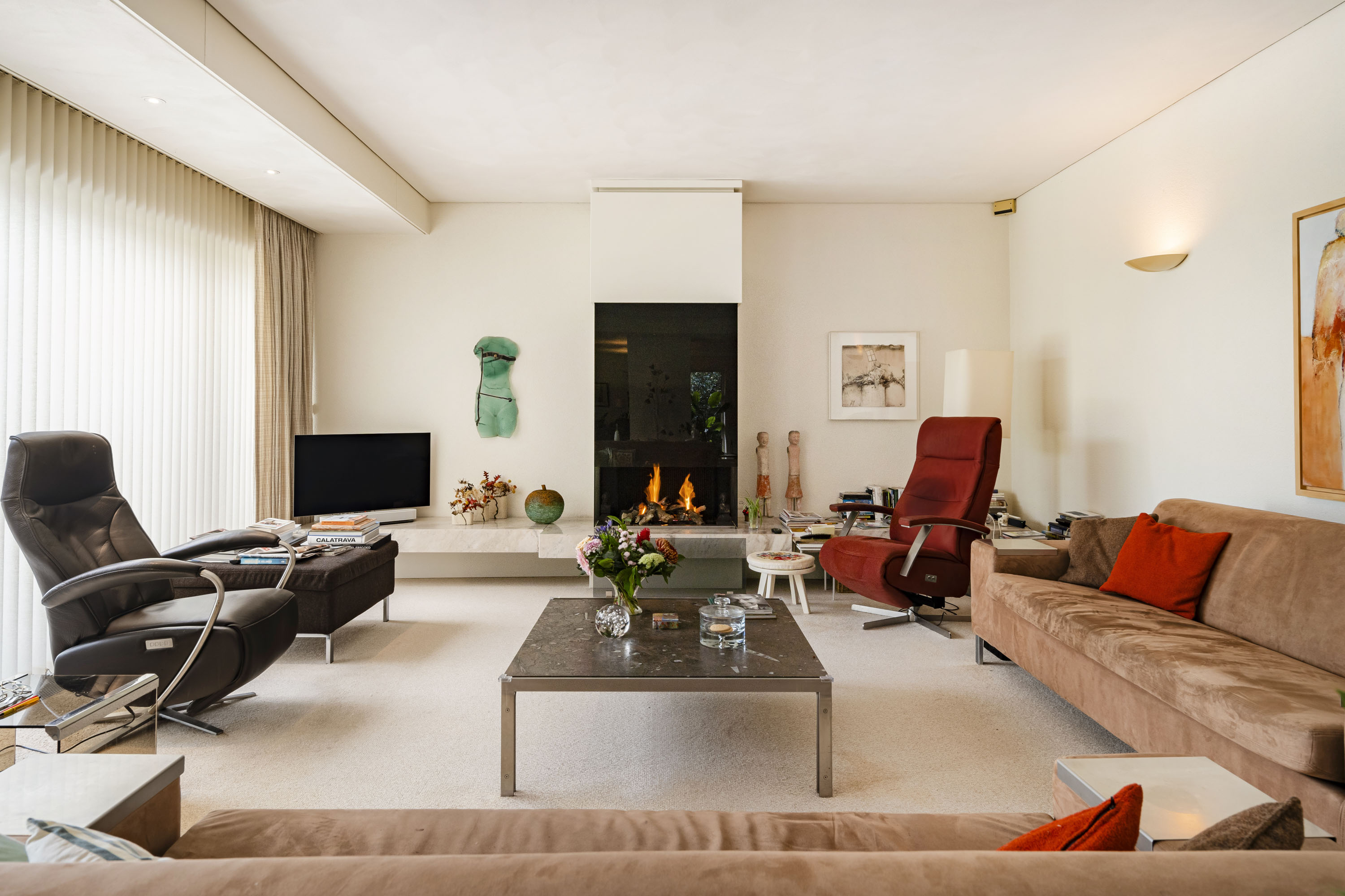 Moving further into the home, you enter the exceptionally large living area. The lounge features a full-width glass façade, offering breathtaking views of the garden. The open-plan kitchen is connected to a utility room, which includes a dumbwaiter from the basement. The dining room is located on the garden side, and in between lies a spacious study. All of these areas flow openly into each other, while the study and kitchen can be closed off with elegant sliding doors. The large covered terrace, accessible from the living room through sliding doors, features an electric retractable roof and sunshade.