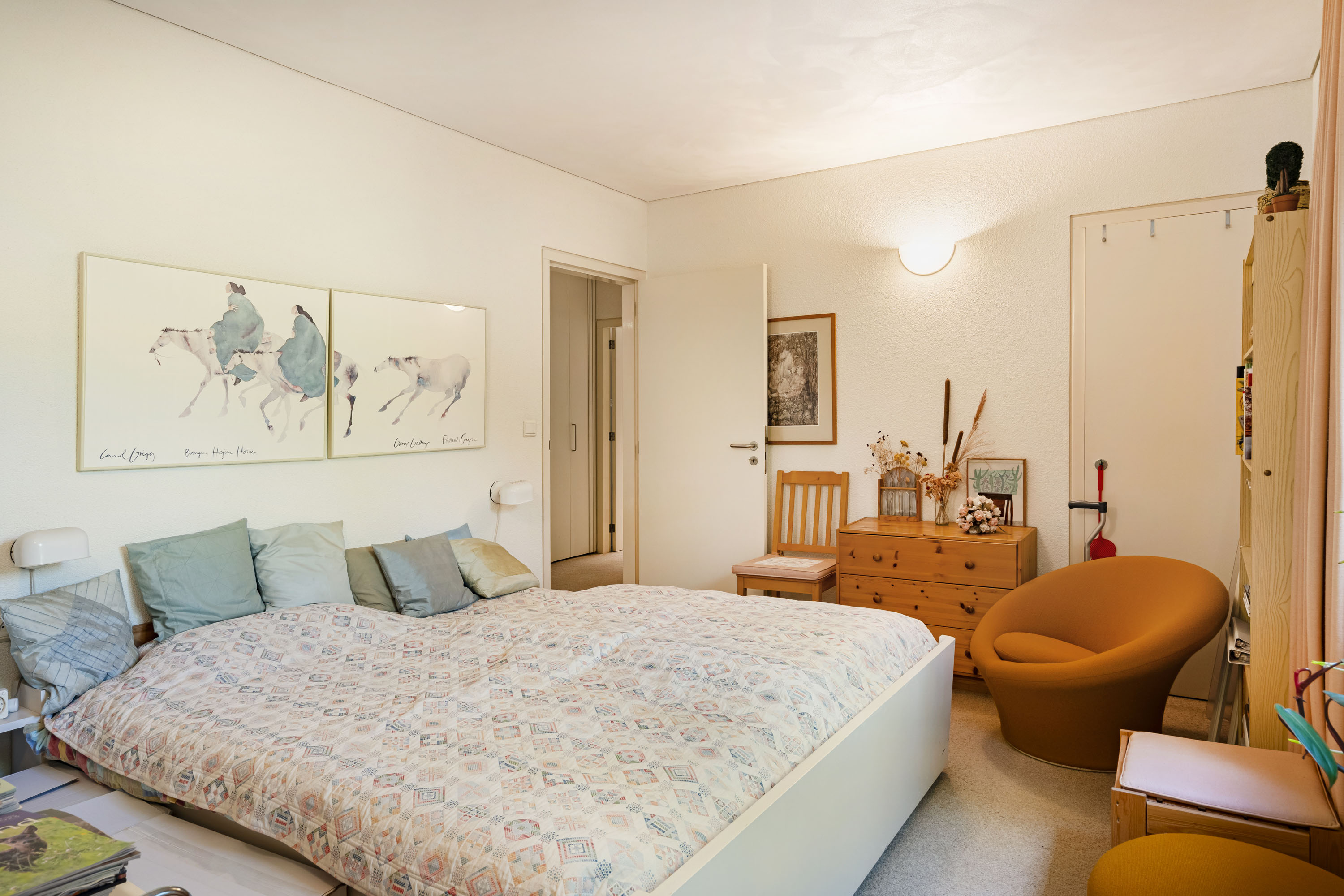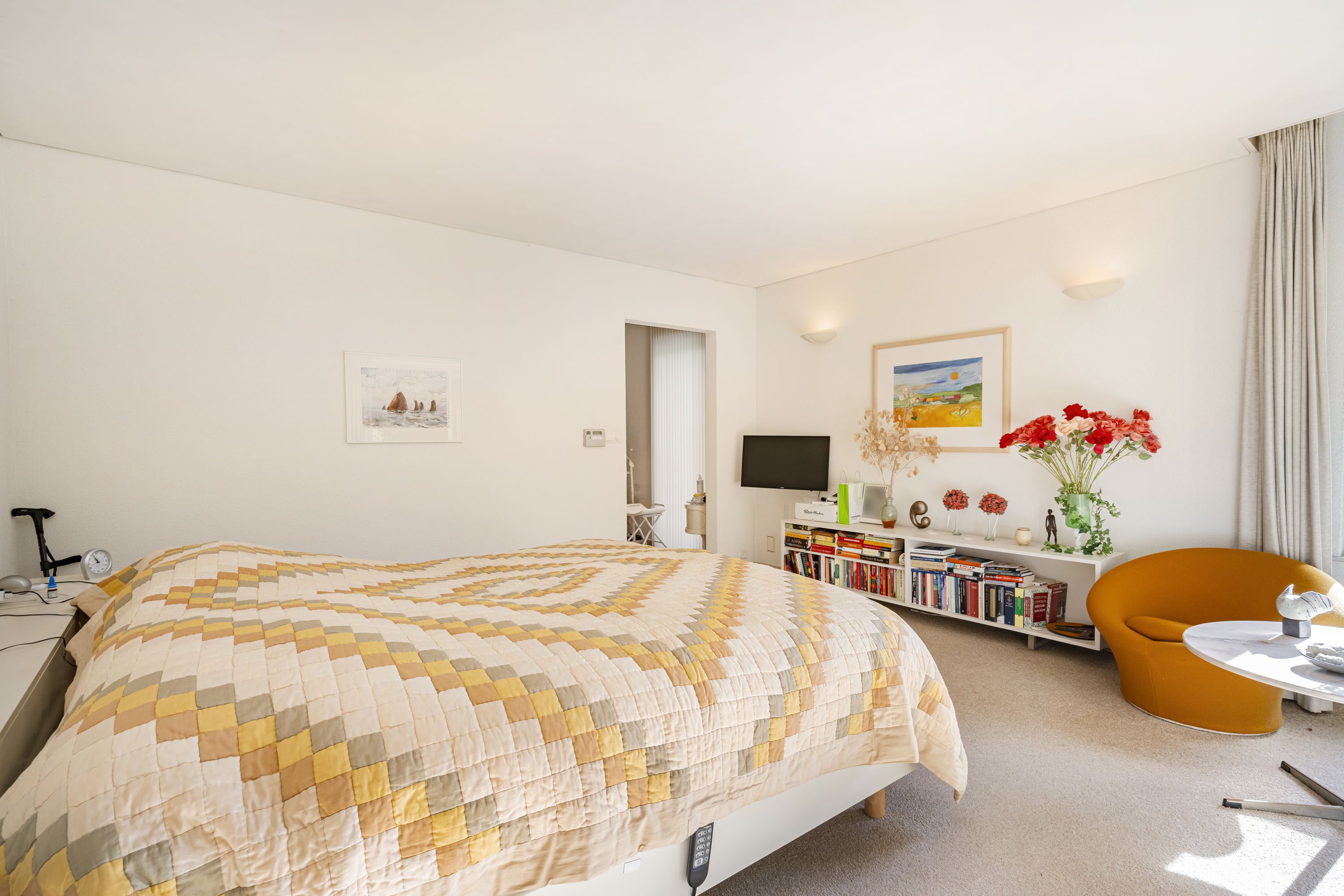 The bathrooms are equipped with a washbasin and shower, while the main bathroom includes a bathtub and a second toilet. The master bedroom, located on the garden side of the house, includes ample closet space and air conditioning.