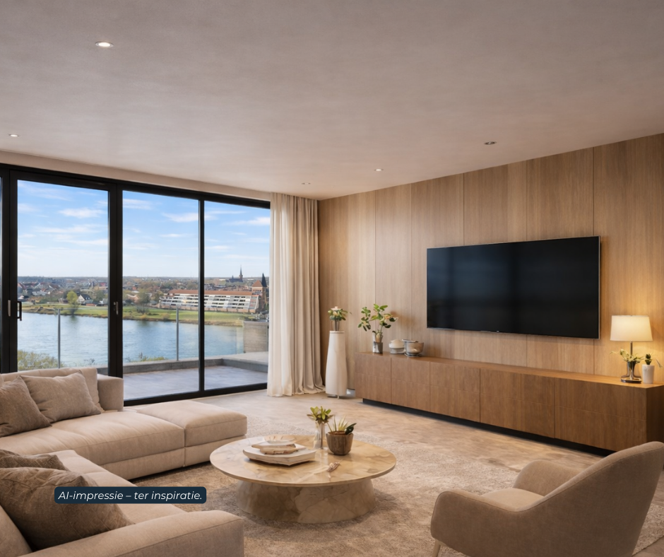 The expansive terrace of approximately 39 m² acts as a natural extension of the living space and offers an uninterrupted panoramic view over the Maas — a view that offers a new experience in every season.