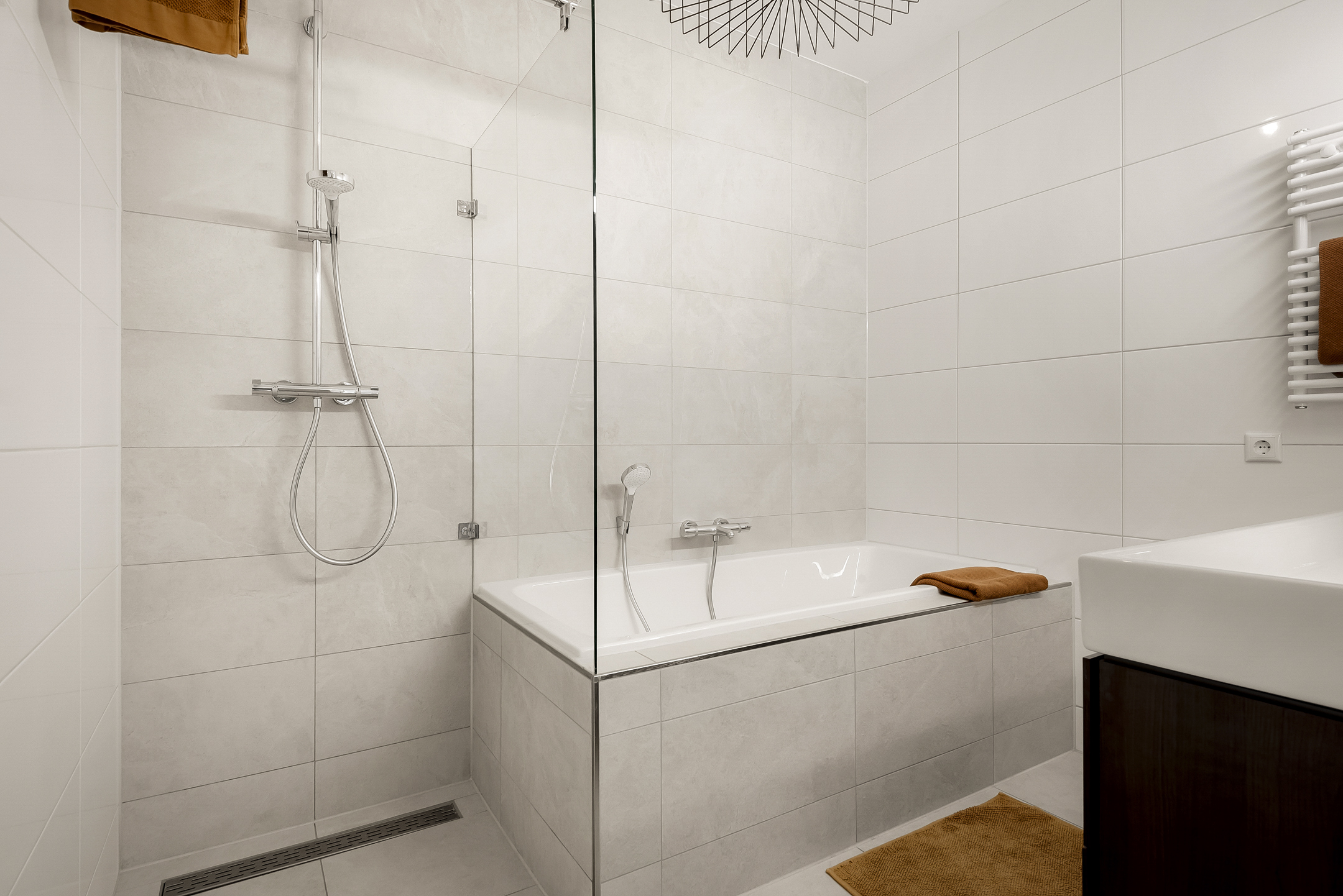 The bathroom exudes luxury and is fitted with a walk-in shower with linear drain, a bathtub, a stylish vanity with mirror cabinet and a towel radiator. This floor also has a PVC floor throughout and a separate toilet with wall-mounted closet.