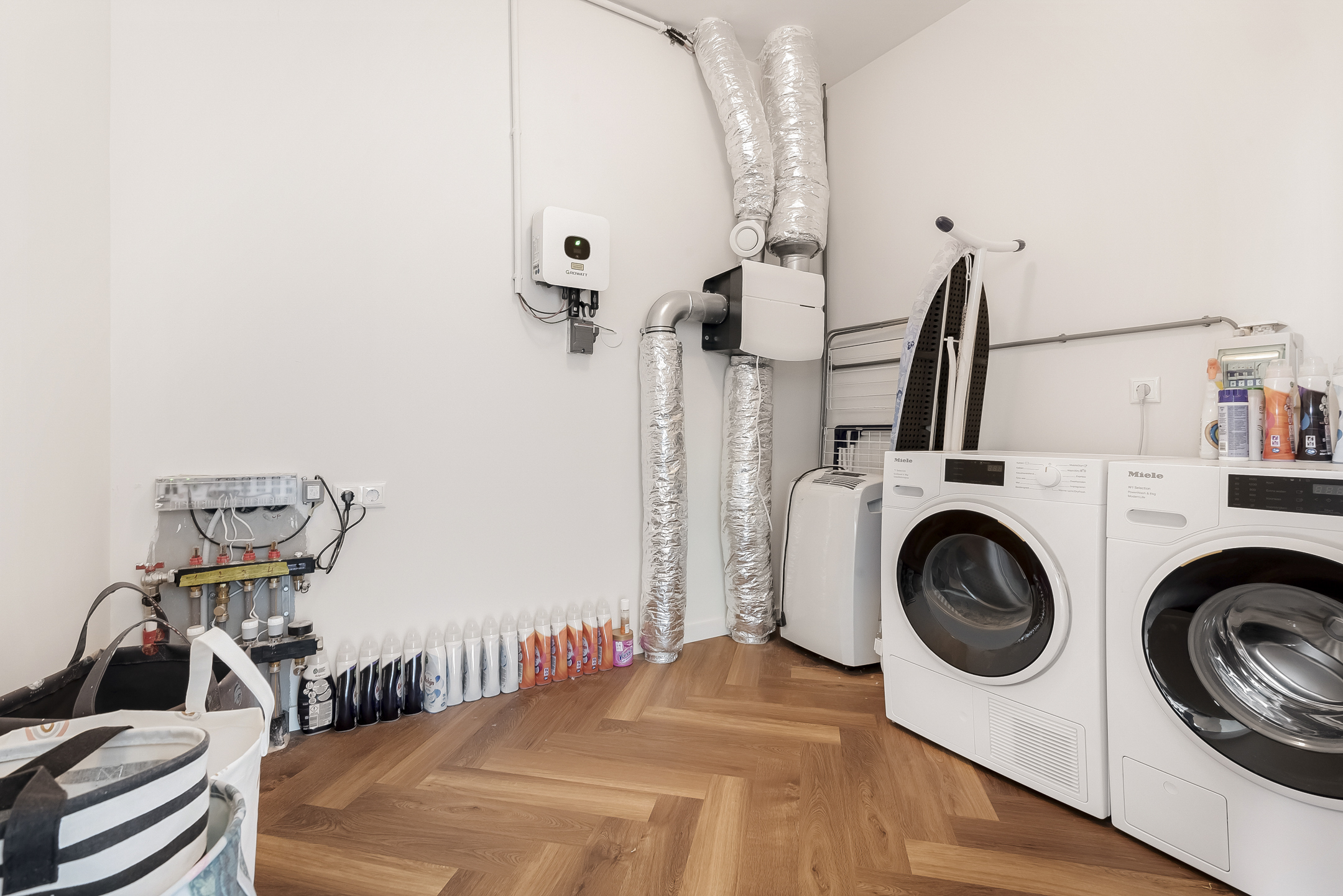 Upon arrival, the spacious front garden immediately stands out, featuring a private driveway with parking for two cars. The heated and insulated storage room, accessible through double doors, offers numerous possibilities such as storage or the creation of a home office or hobby space. From this storage room—where the heat pump and hot water boiler are also located—there is direct access to both the house and the back garden. This space can potentially be extended.