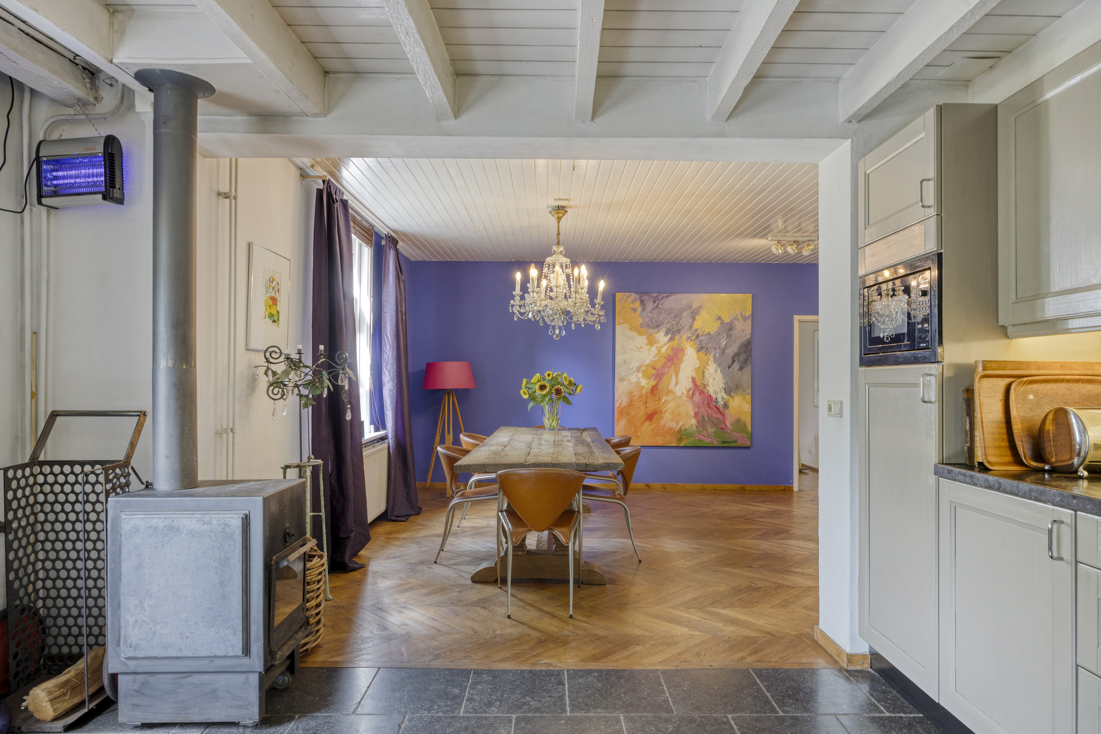 Spacious kitchen-diner featuring a corner-installed fitted kitchen with natural stone worktop and double sink, built-in gas hob, refrigerator, microwave, dishwasher and extractor hood; also equipped with a wood-burning stove; tiled and plastered walls, oak herringbone floor partly combined with natural stone flooring; ceiling finished with wooden panelling and exposed beams; French doors to the garden/terrace;