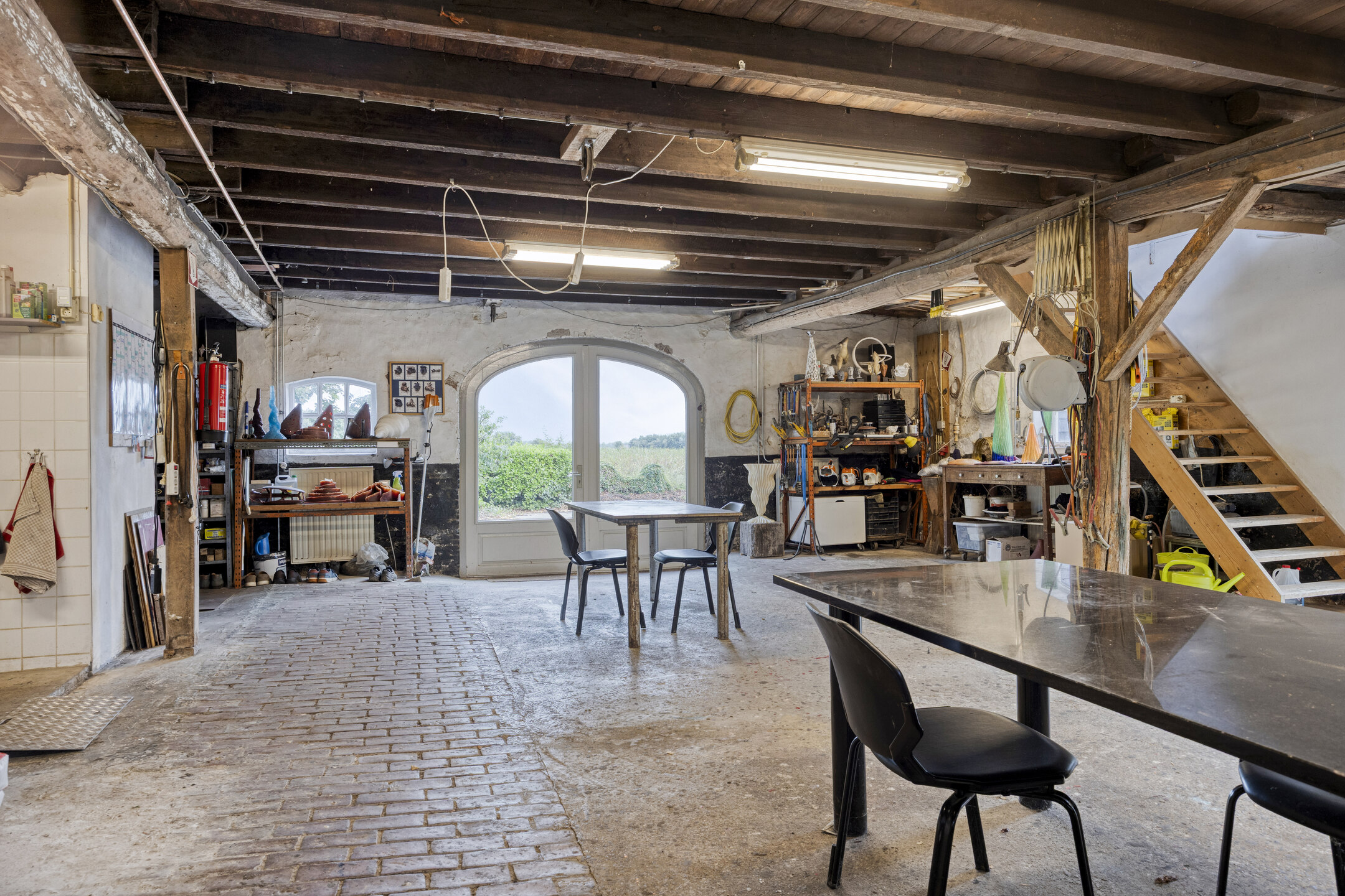Internal studio located at the front of the farmhouse (approx. 87 m²), multifunctional and suitable for various purposes; equipped with a kitchenette, second staircase to the first floor, French doors to the garden/terrace, pedestrian door to the driveway; plastered walls, concrete floor partly finished with paving, exposed beam ceiling.