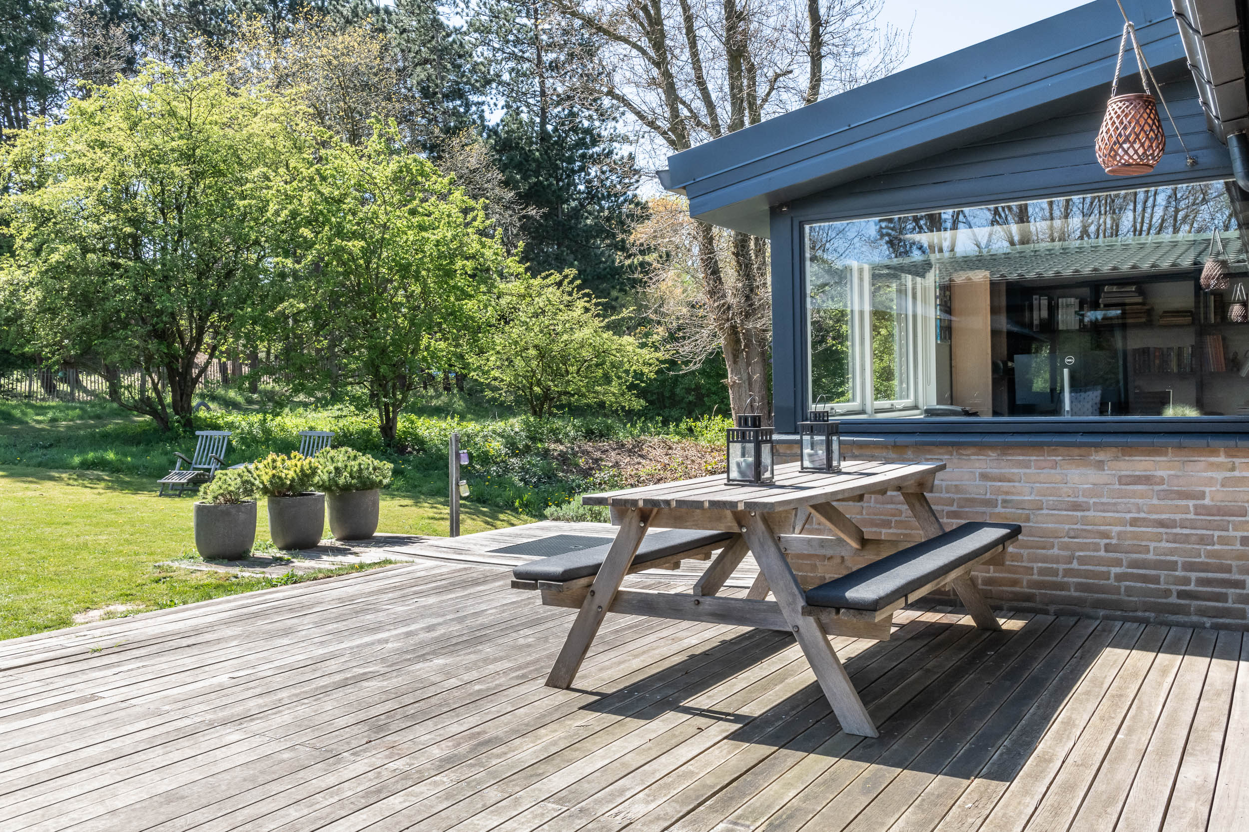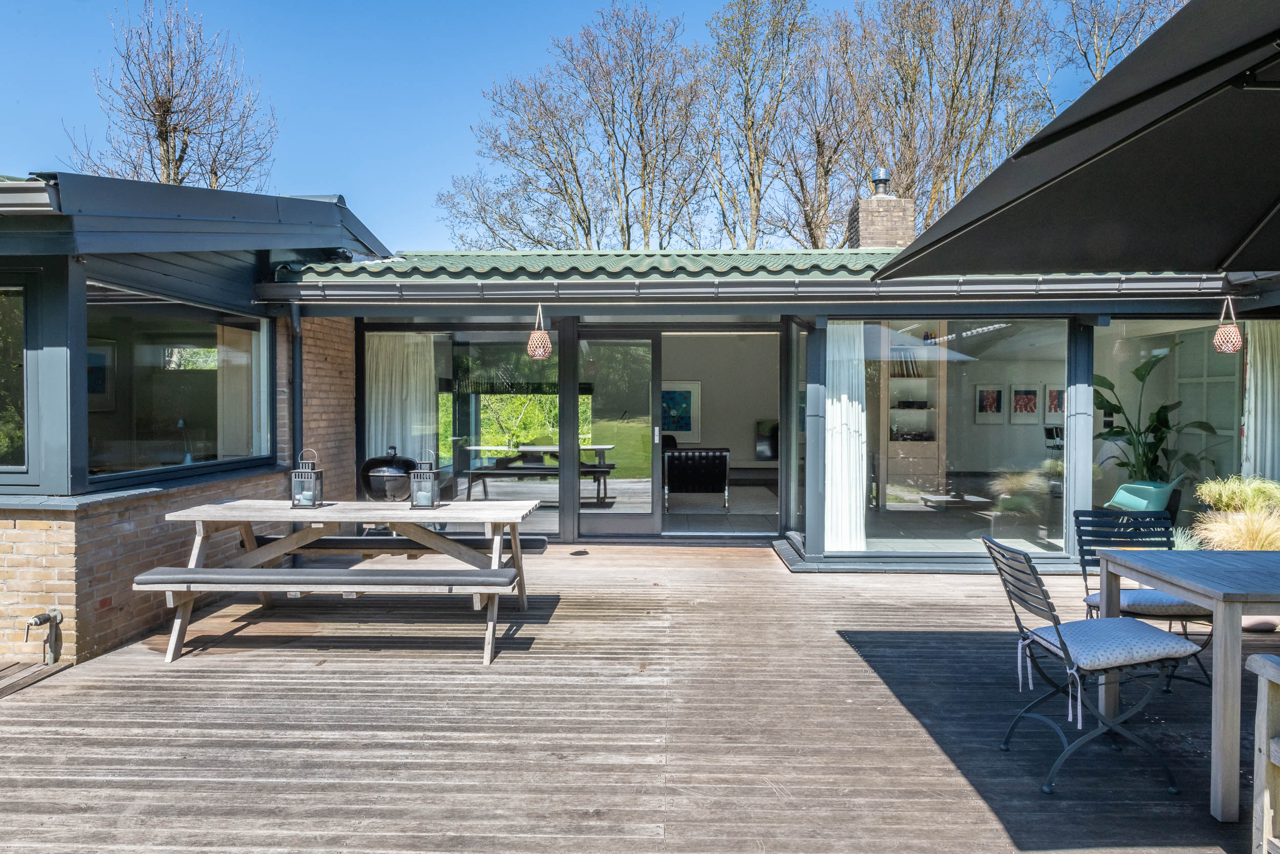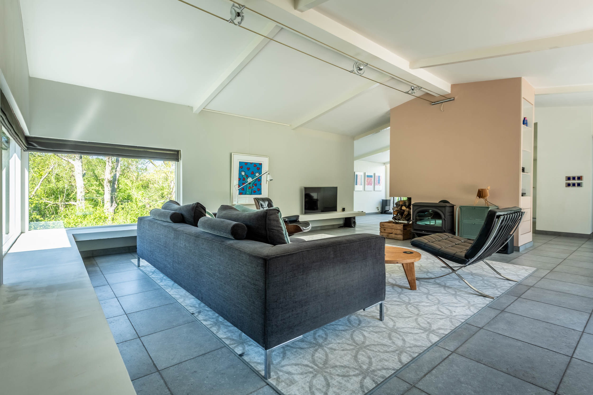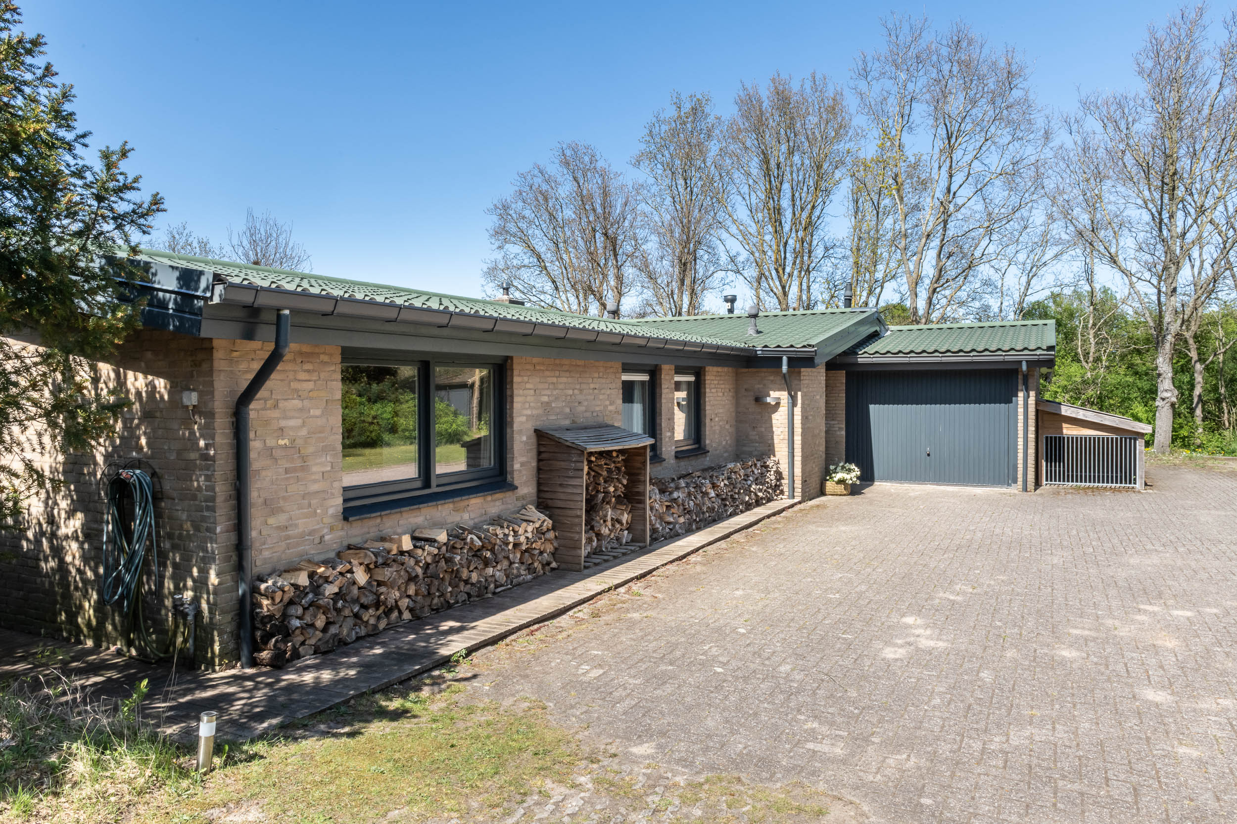 The home is approached by a long driveway with plentiful parking and features an airy living room, illuminated by large windows and two sliding doors, opening onto a sunny terrace with sweeping views of the surrounding dune garden. The wood burning stove, underfloor heating, and careful insulation including double glazing and facade insulation contribute to year round comfort, reflected in its energy class C status.