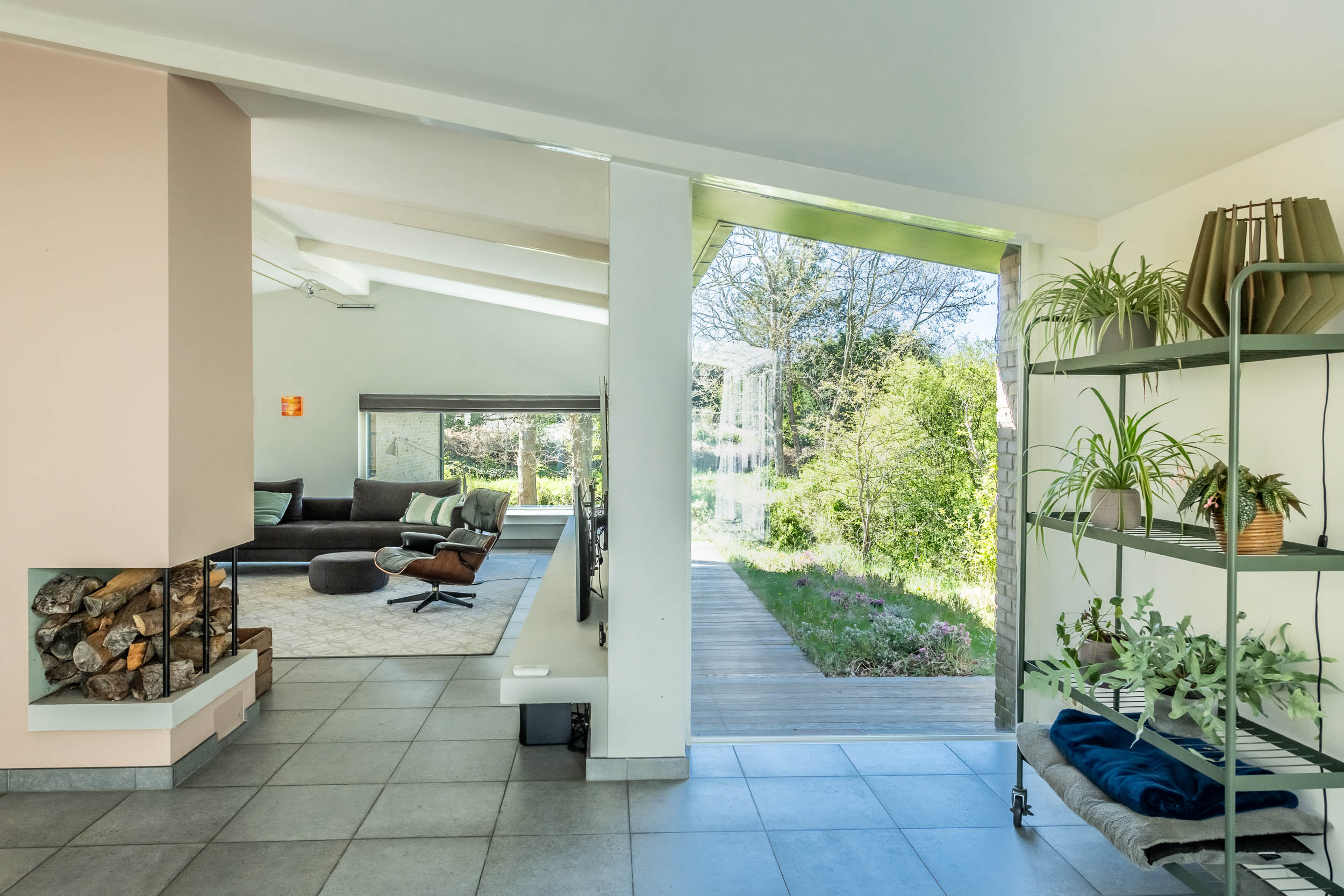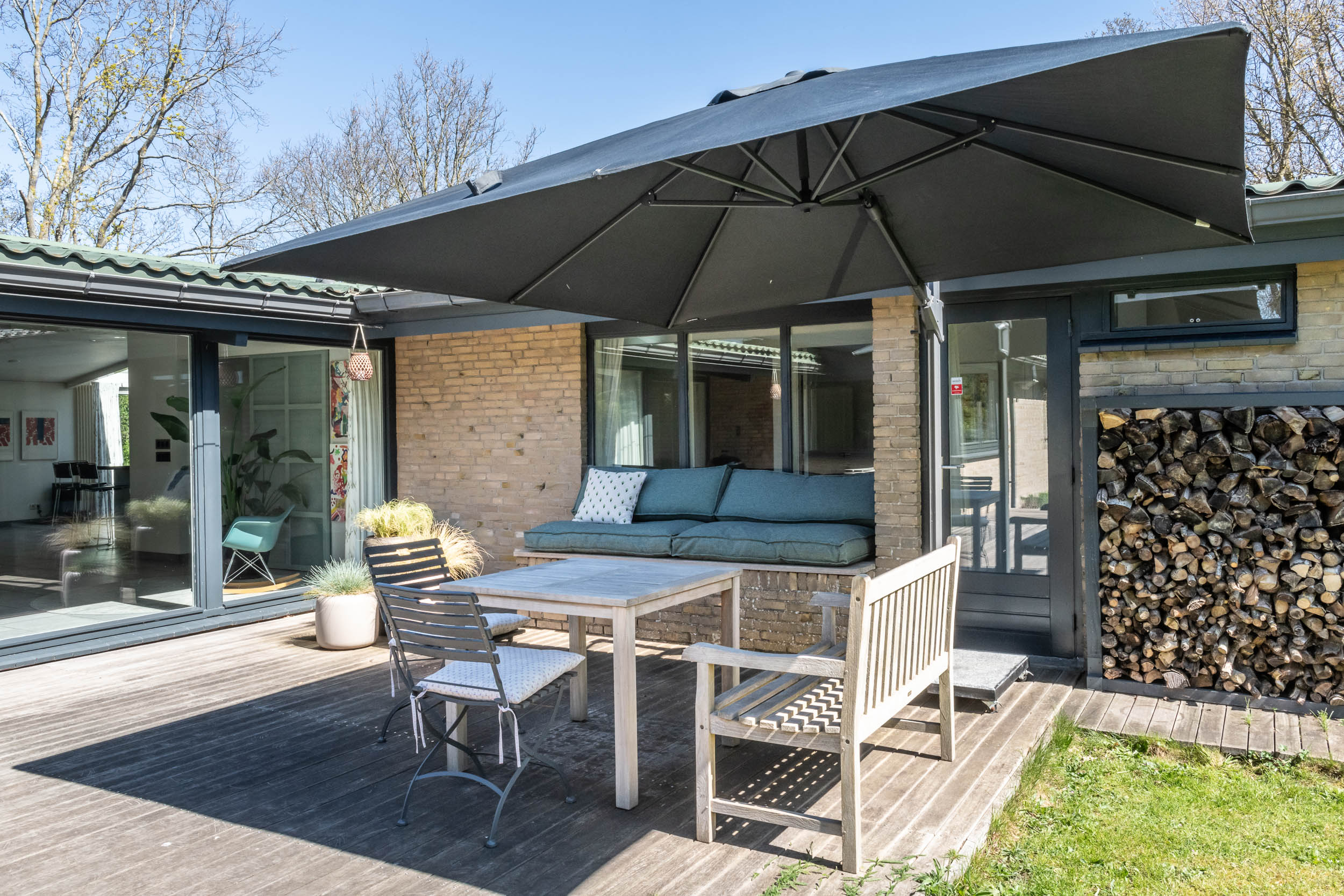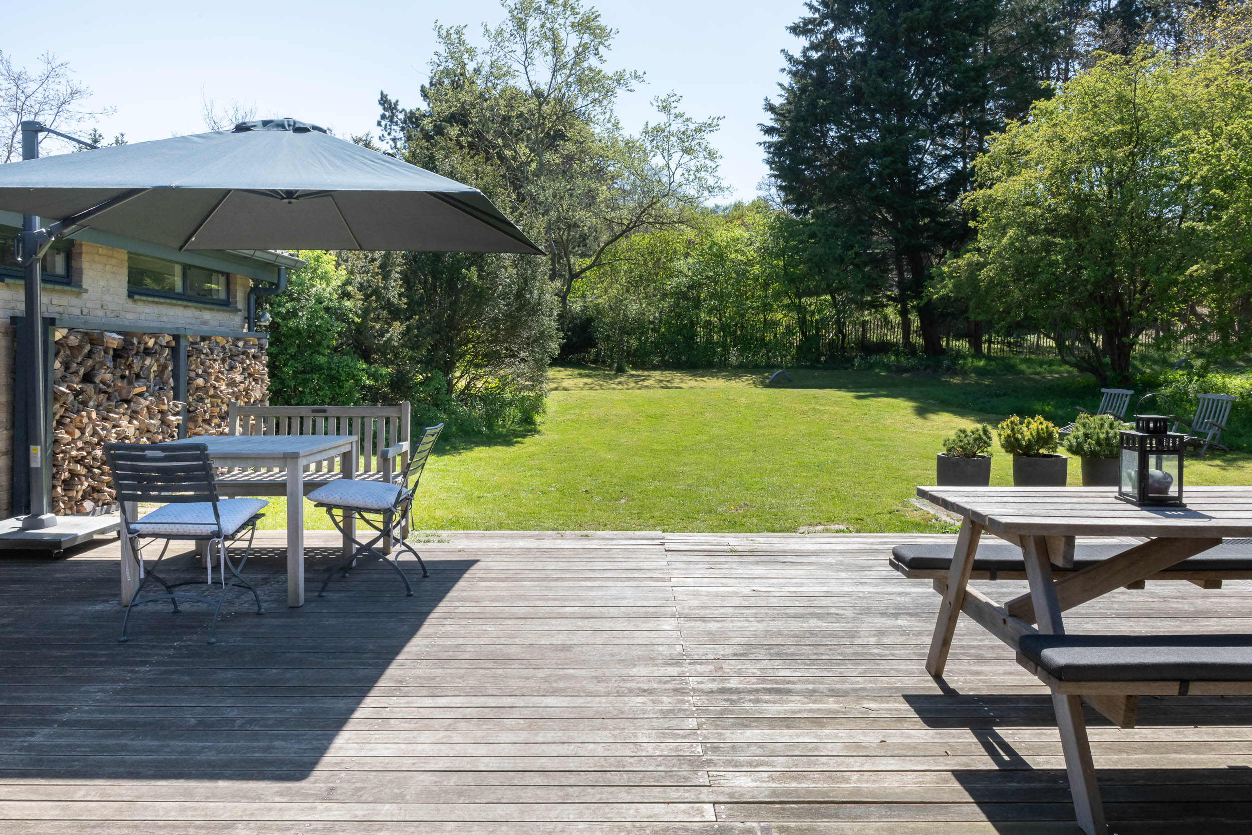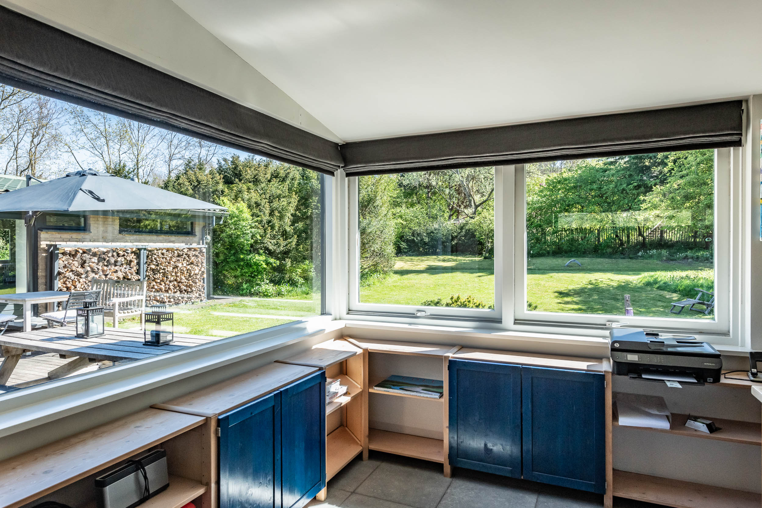The home is approached by a long driveway with plentiful parking and features an airy living room, illuminated by large windows and two sliding doors, opening onto a sunny terrace with sweeping views of the surrounding dune garden. The wood burning stove, underfloor heating, and careful insulation including double glazing and facade insulation contribute to year round comfort, reflected in its energy class C status.