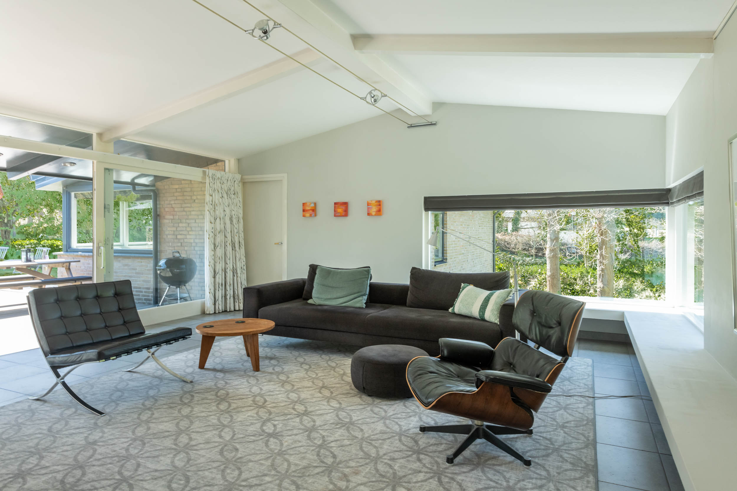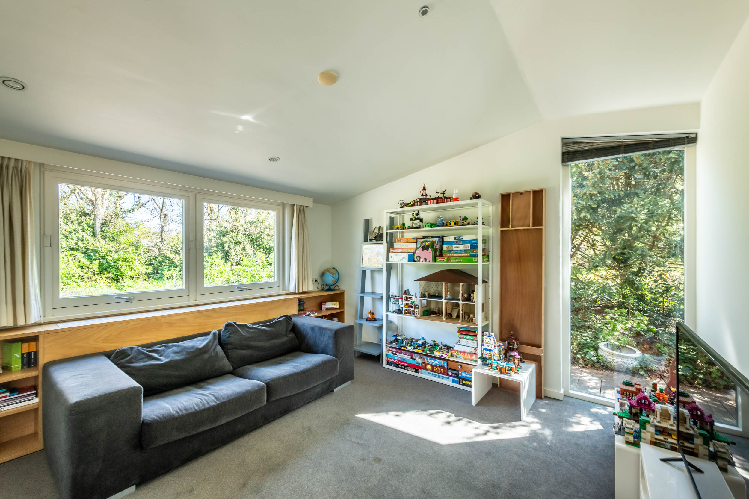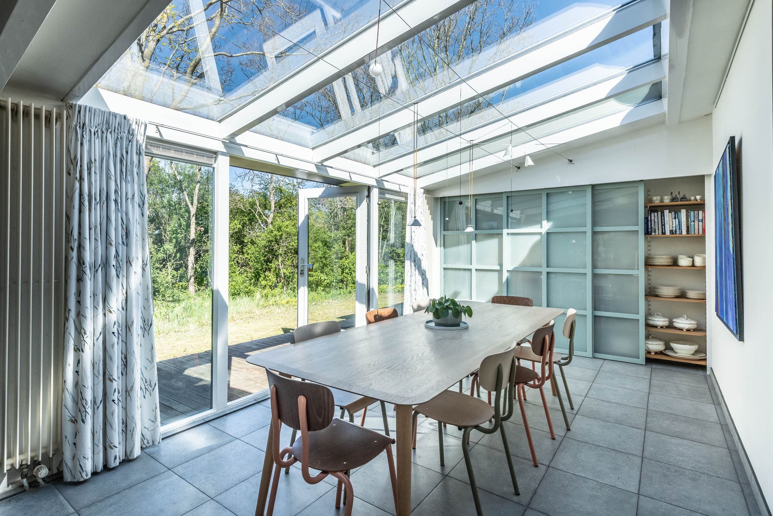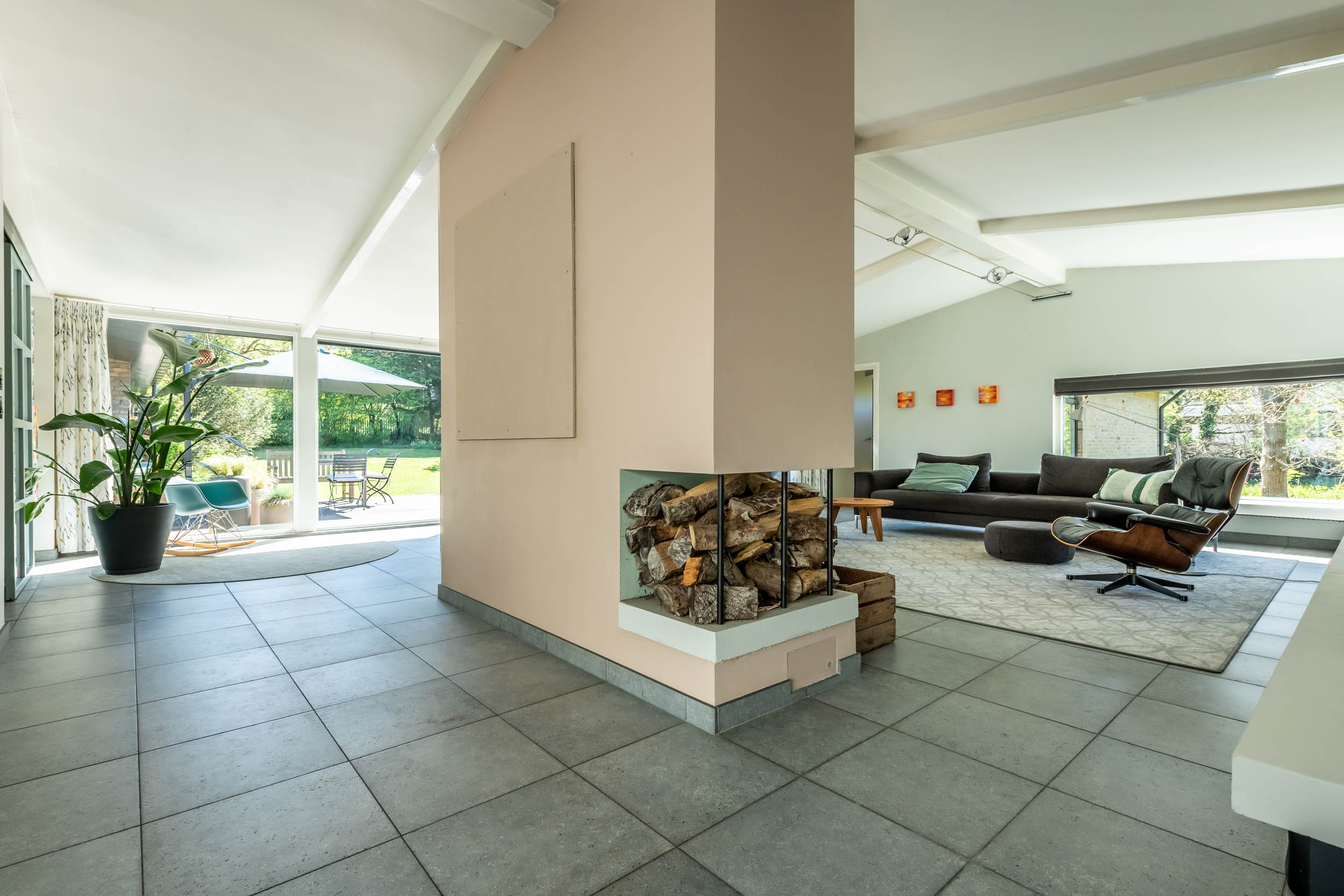 The home is approached by a long driveway with plentiful parking and features an airy living room, illuminated by large windows and two sliding doors, opening onto a sunny terrace with sweeping views of the surrounding dune garden. The wood burning stove, underfloor heating, and careful insulation including double glazing and facade insulation contribute to year round comfort, reflected in its energy class C status.
