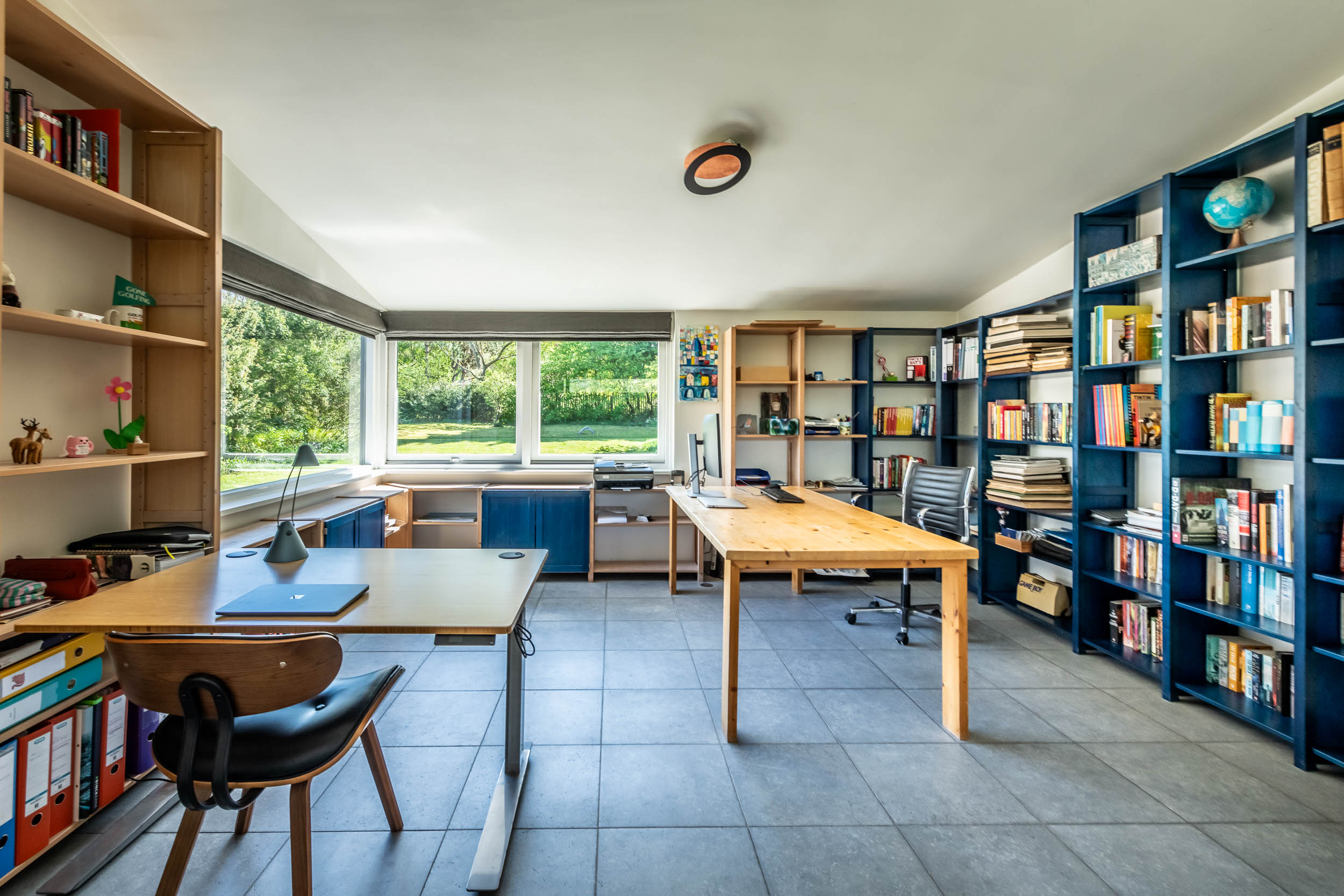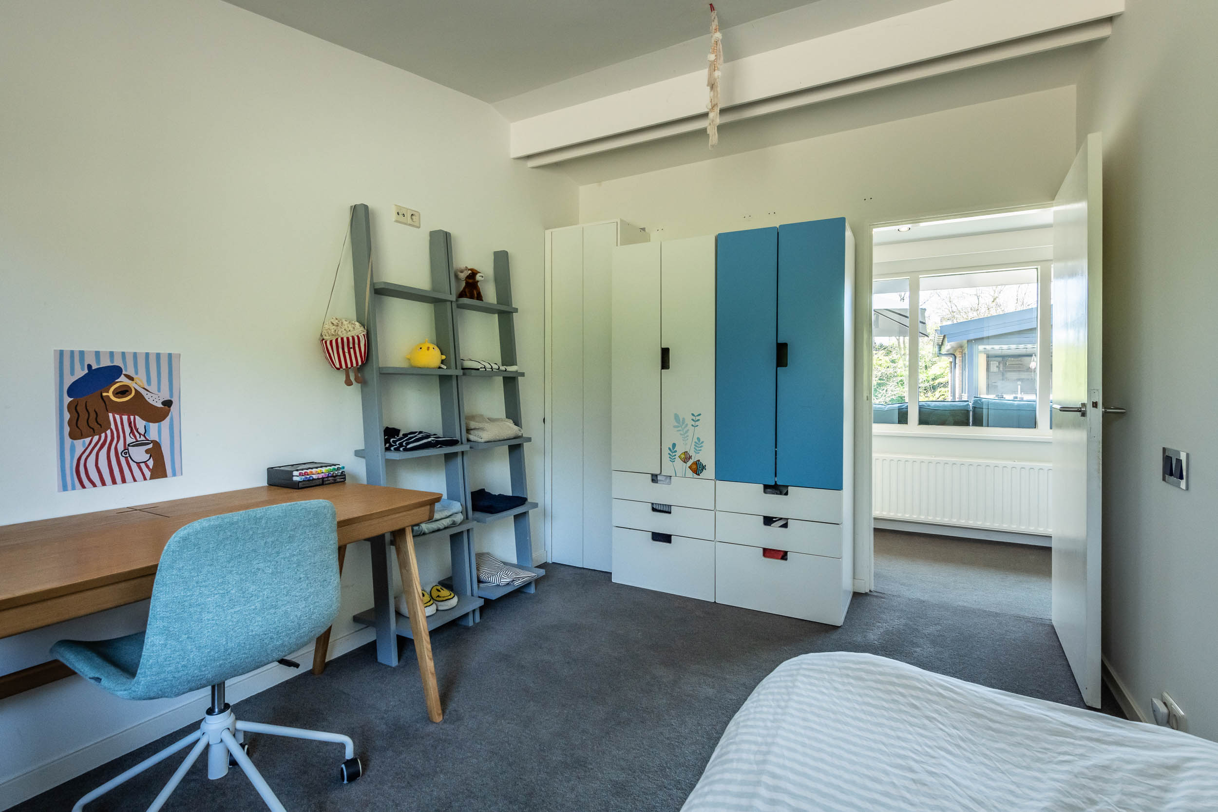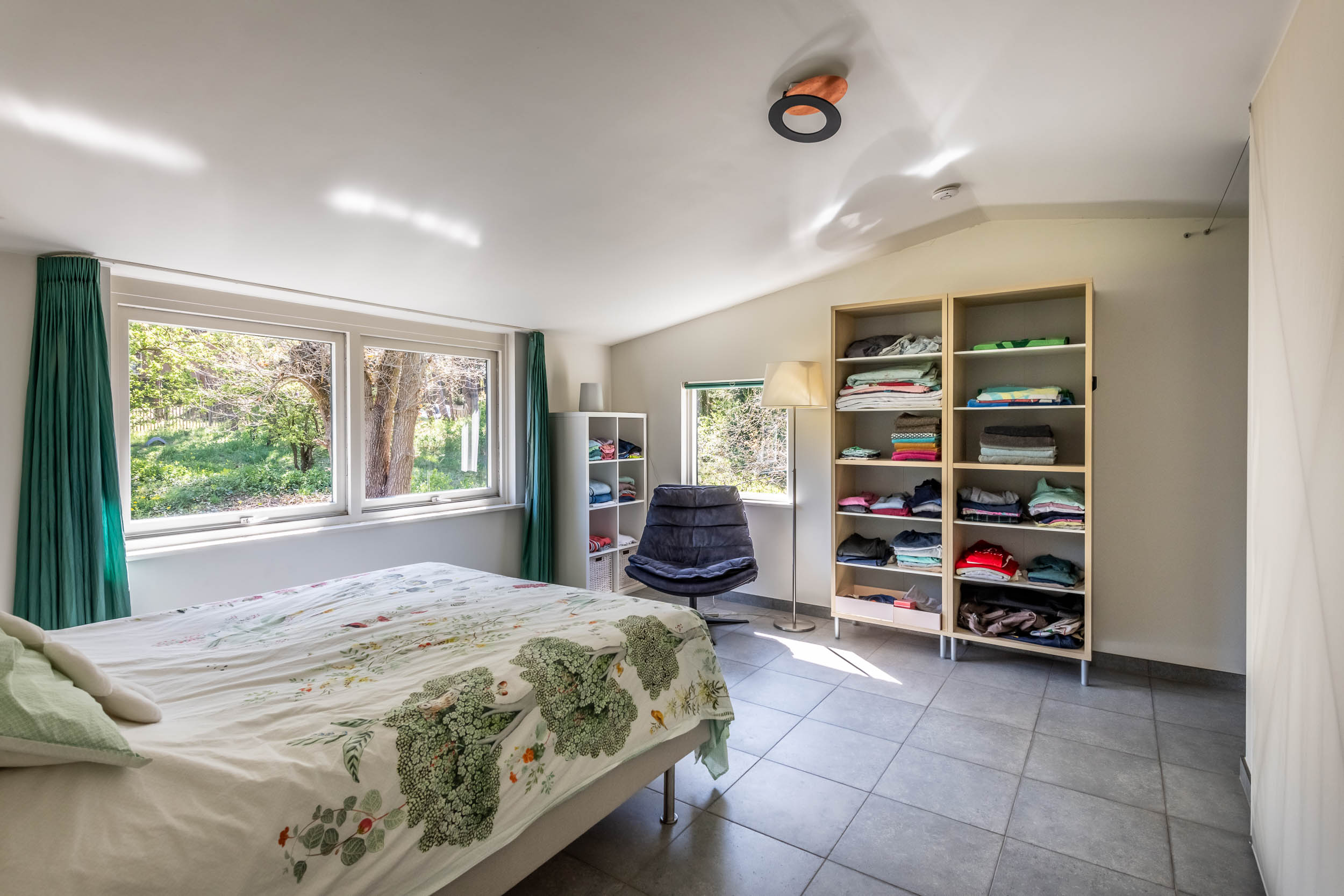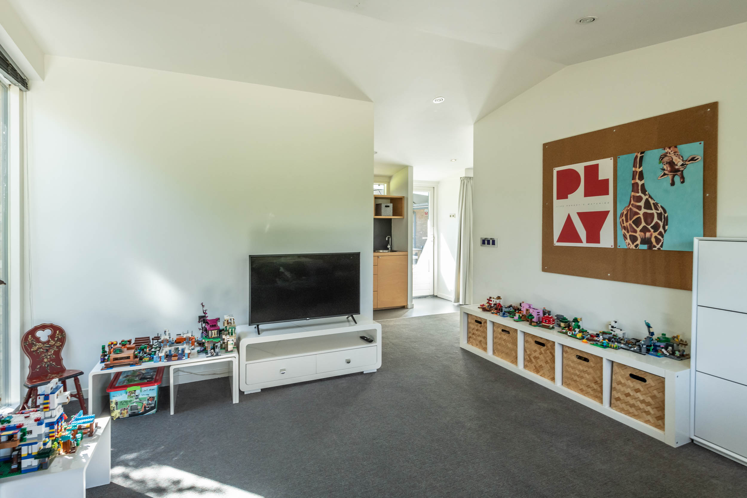 The home is approached by a long driveway with plentiful parking and features an airy living room, illuminated by large windows and two sliding doors, opening onto a sunny terrace with sweeping views of the surrounding dune garden. The wood burning stove, underfloor heating, and careful insulation including double glazing and facade insulation contribute to year round comfort, reflected in its energy class C status.