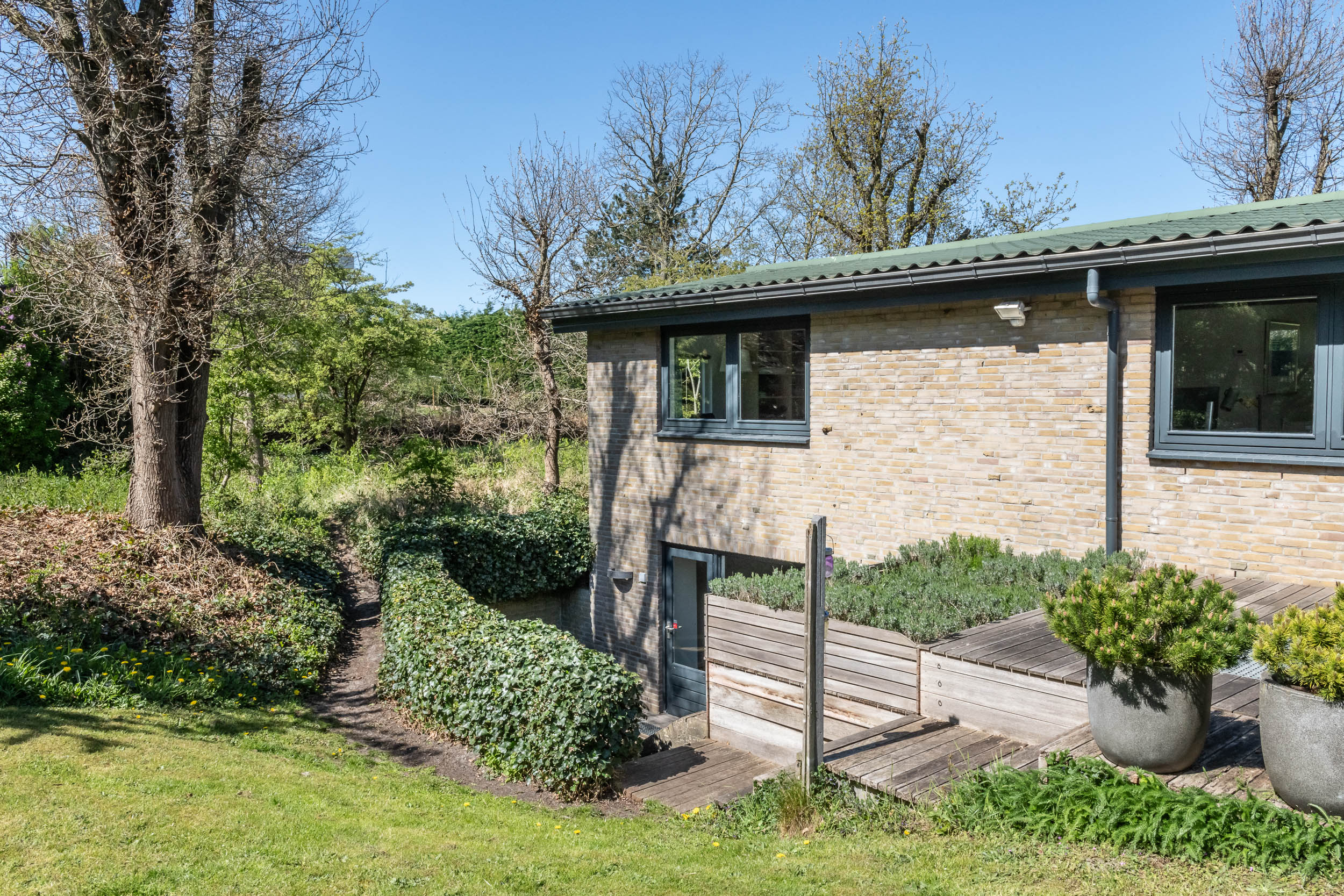 There are two distinct bedroom wings, supporting privacy for family living or guests. The basement features a large multifunctional space with outdoor access, ideal for a studio or guest suite. A utility room, attached garage, and thoughtful spatial arrangement enhance daily ease. The low maintenance garden, with its own well and water pump, can be enjoyed indoors or out.