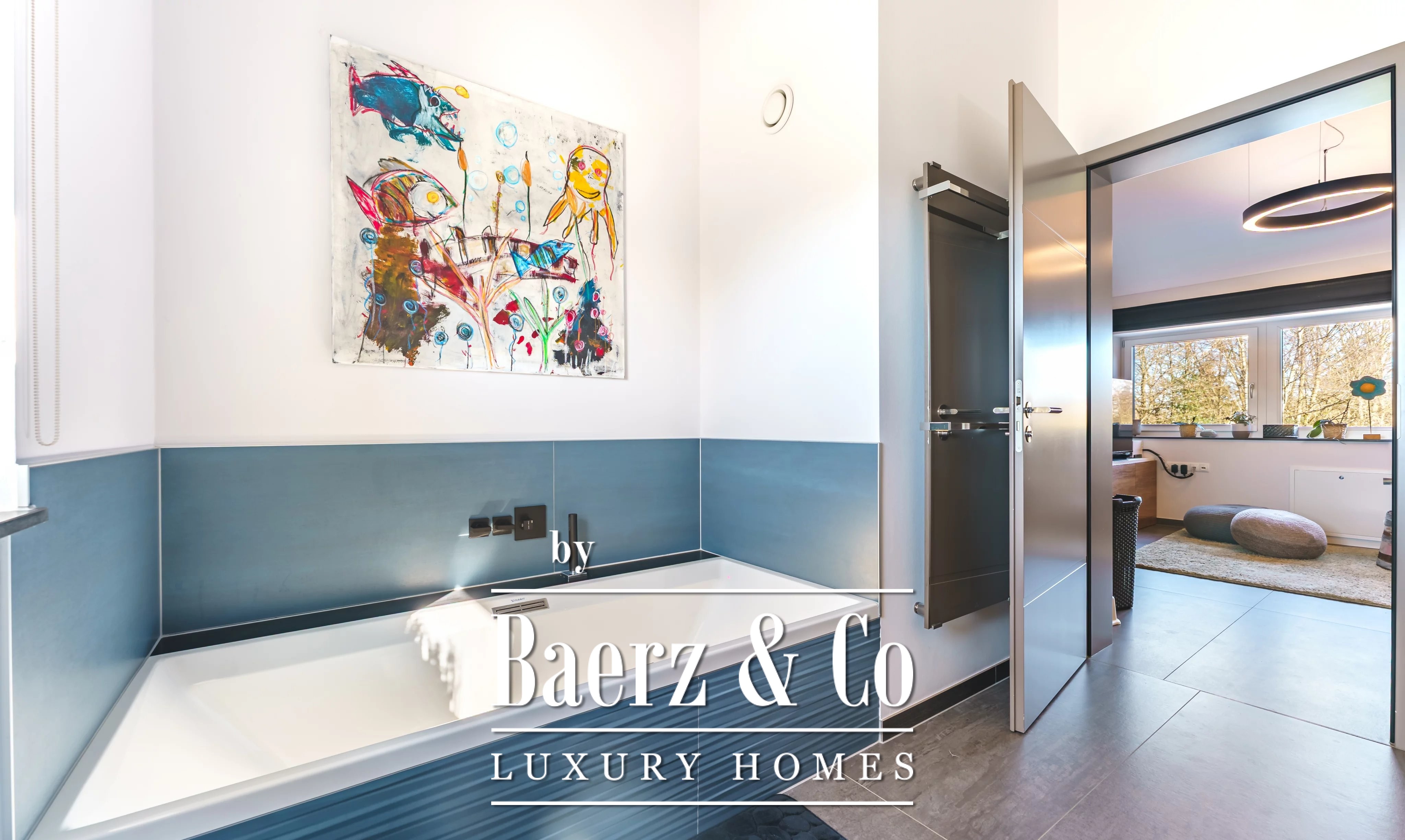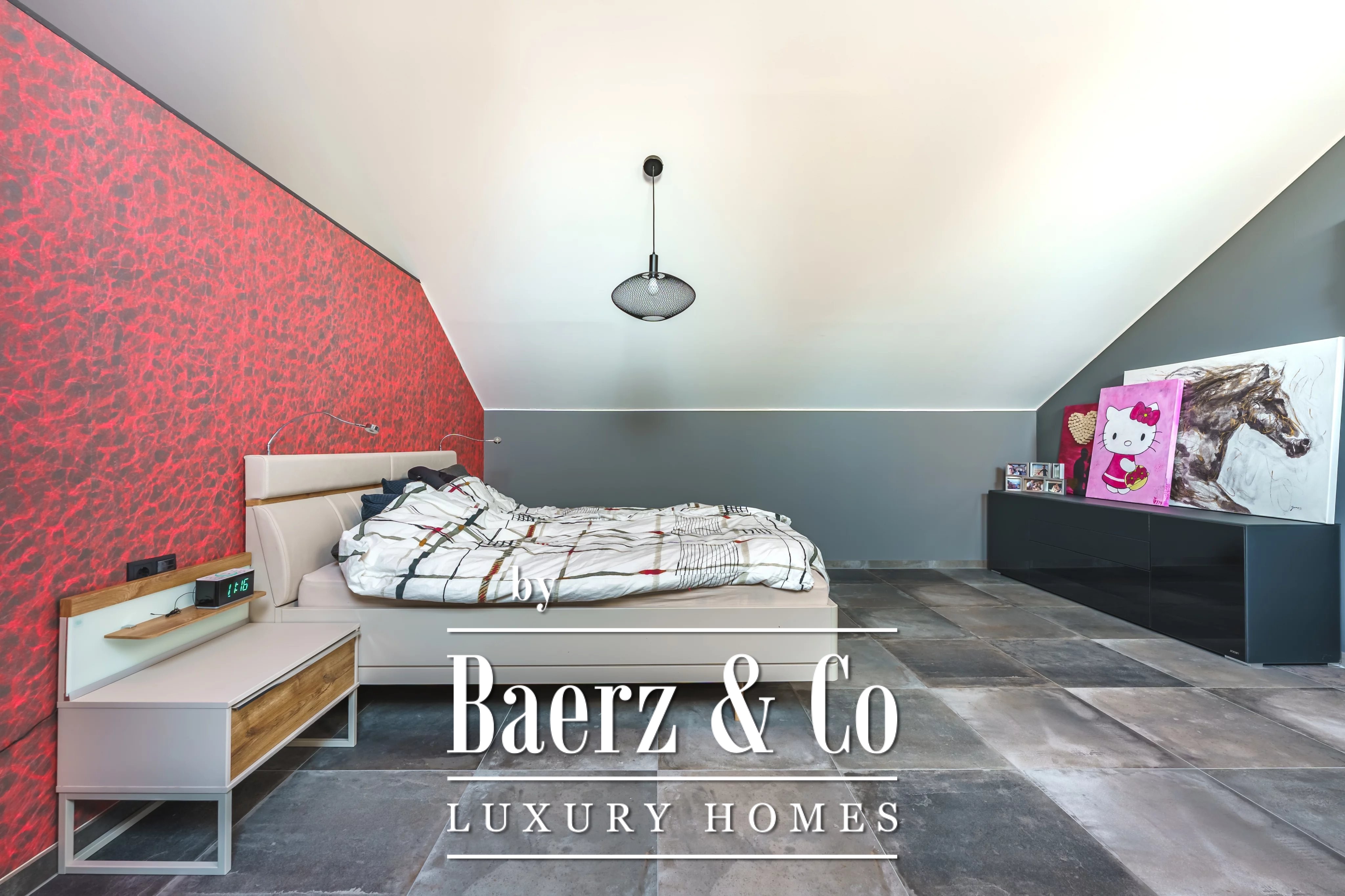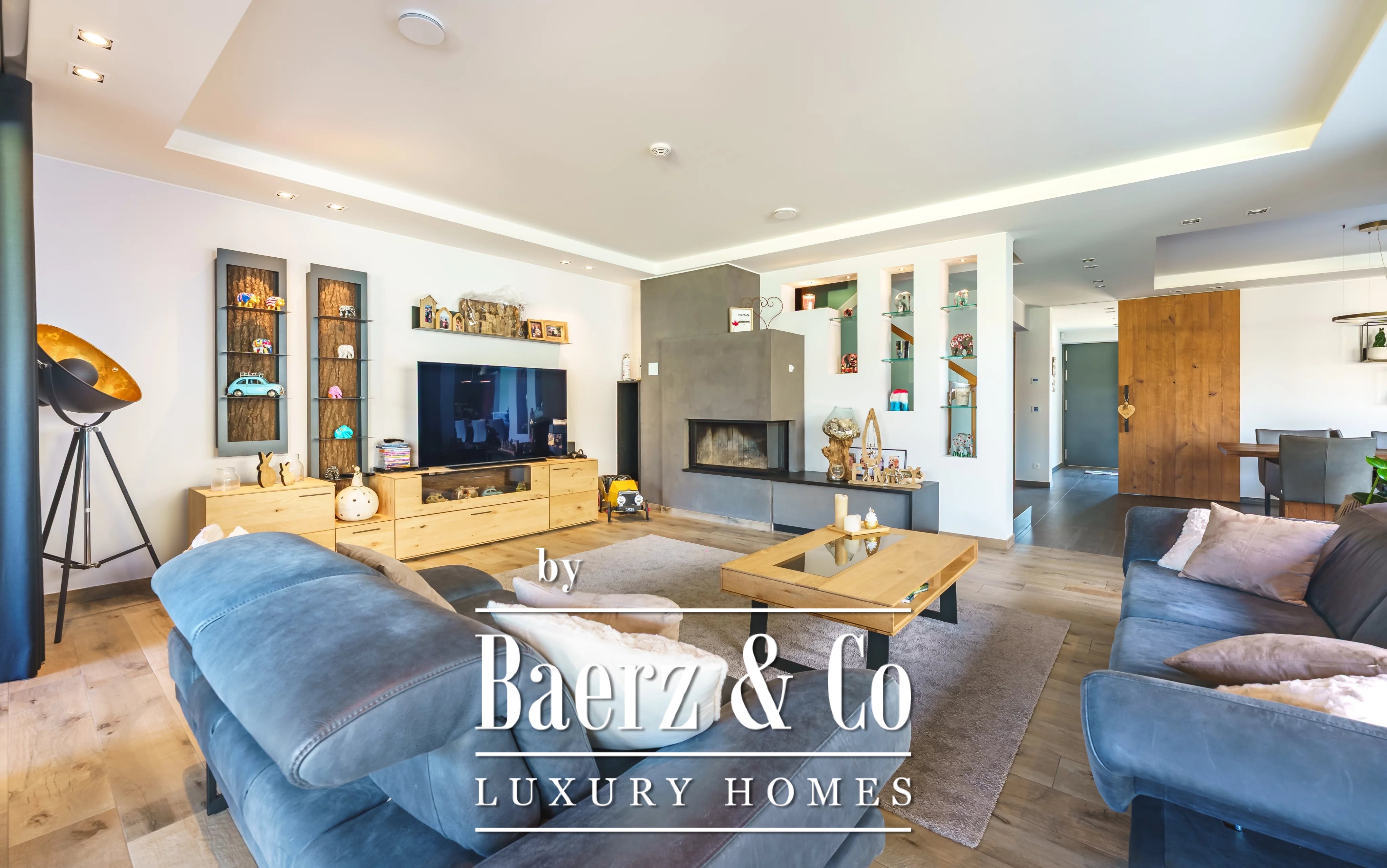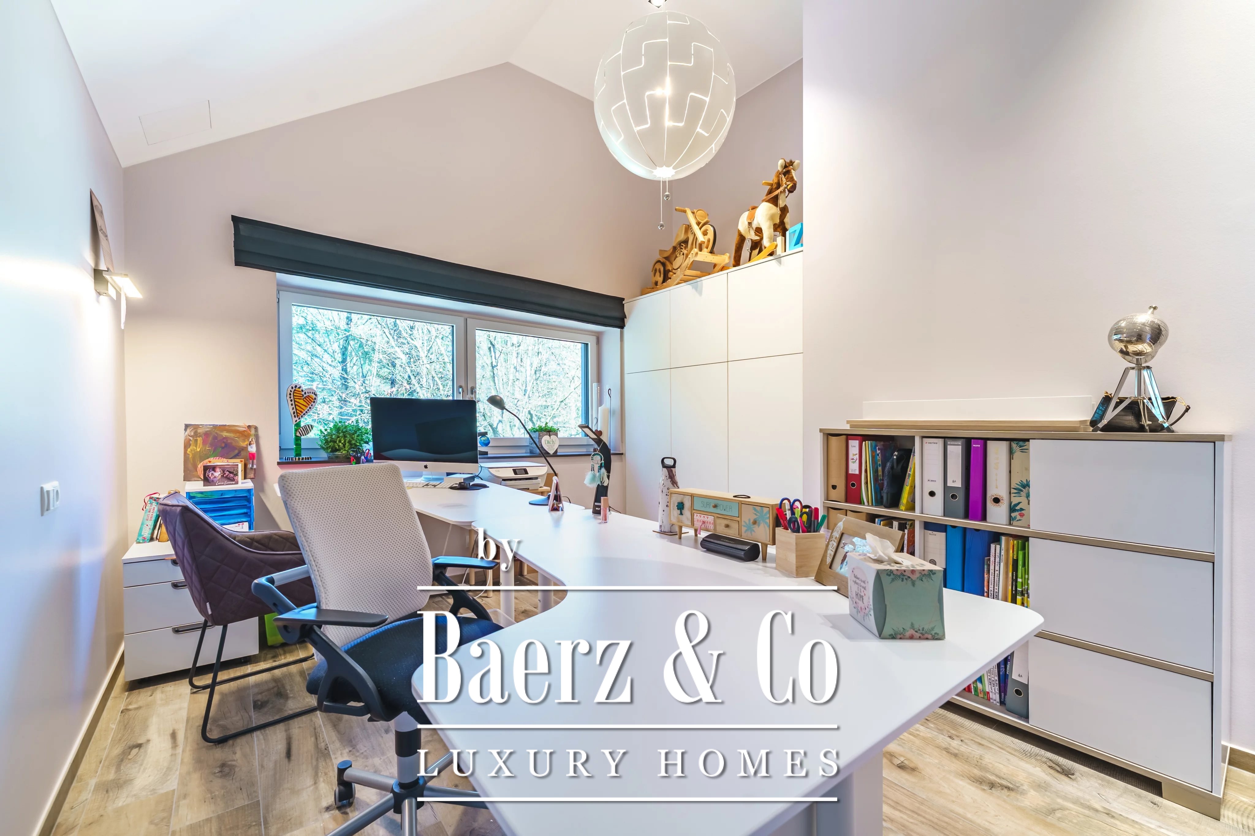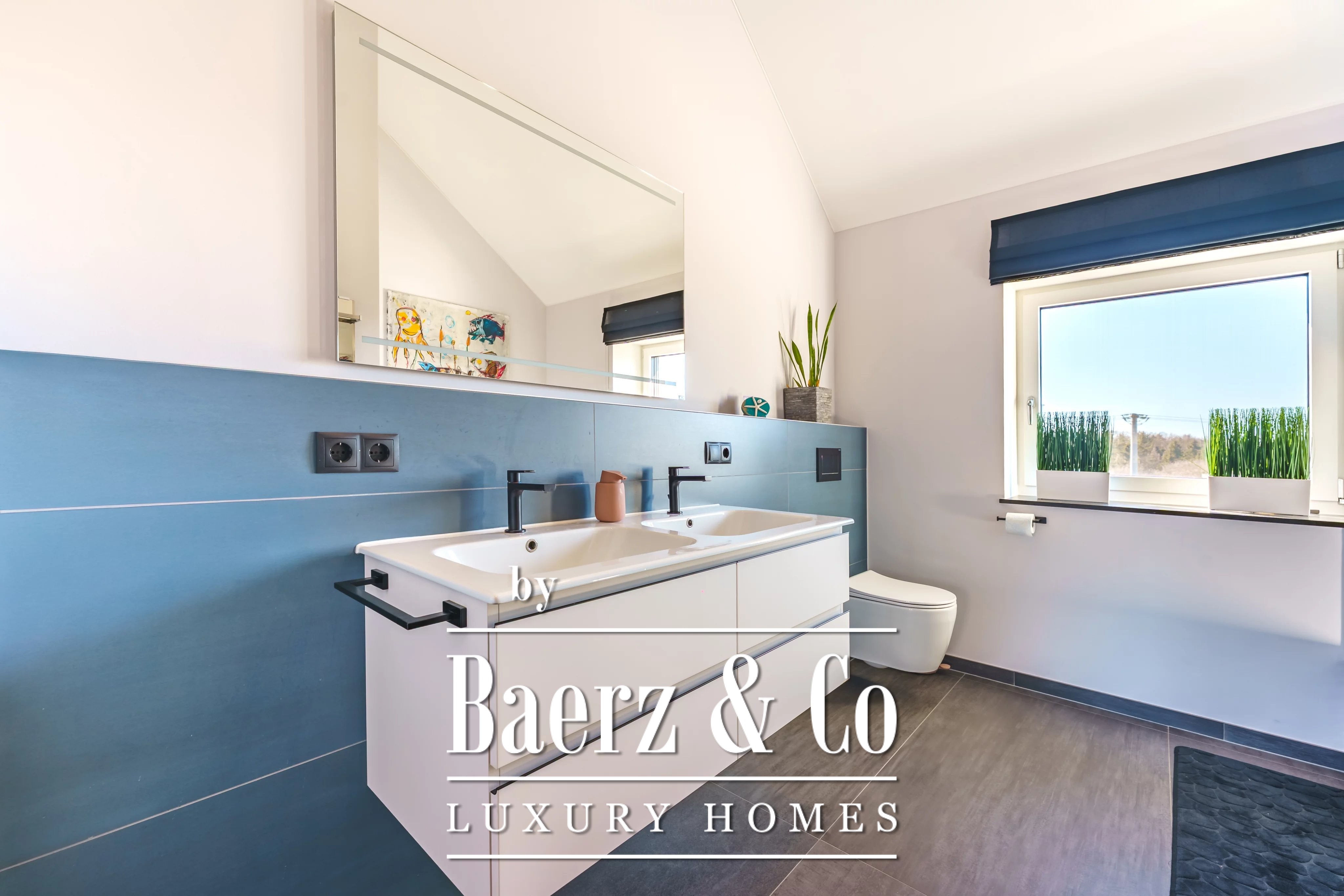 En la planta superior, una segunda sala de estar crea un refugio privado para reuniones familiares. La propiedad cuenta con cinco dormitorios y cuatro baños, entre ellos una suite principal con vestidor y baño privado con ducha, así como un dormitorio de invitados con baño en suite. El cuarto de lavandería es discreto y eficiente, contribuyendo al confort cotidiano.
