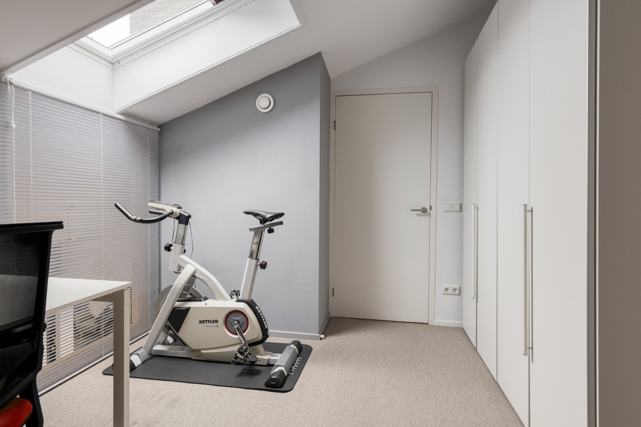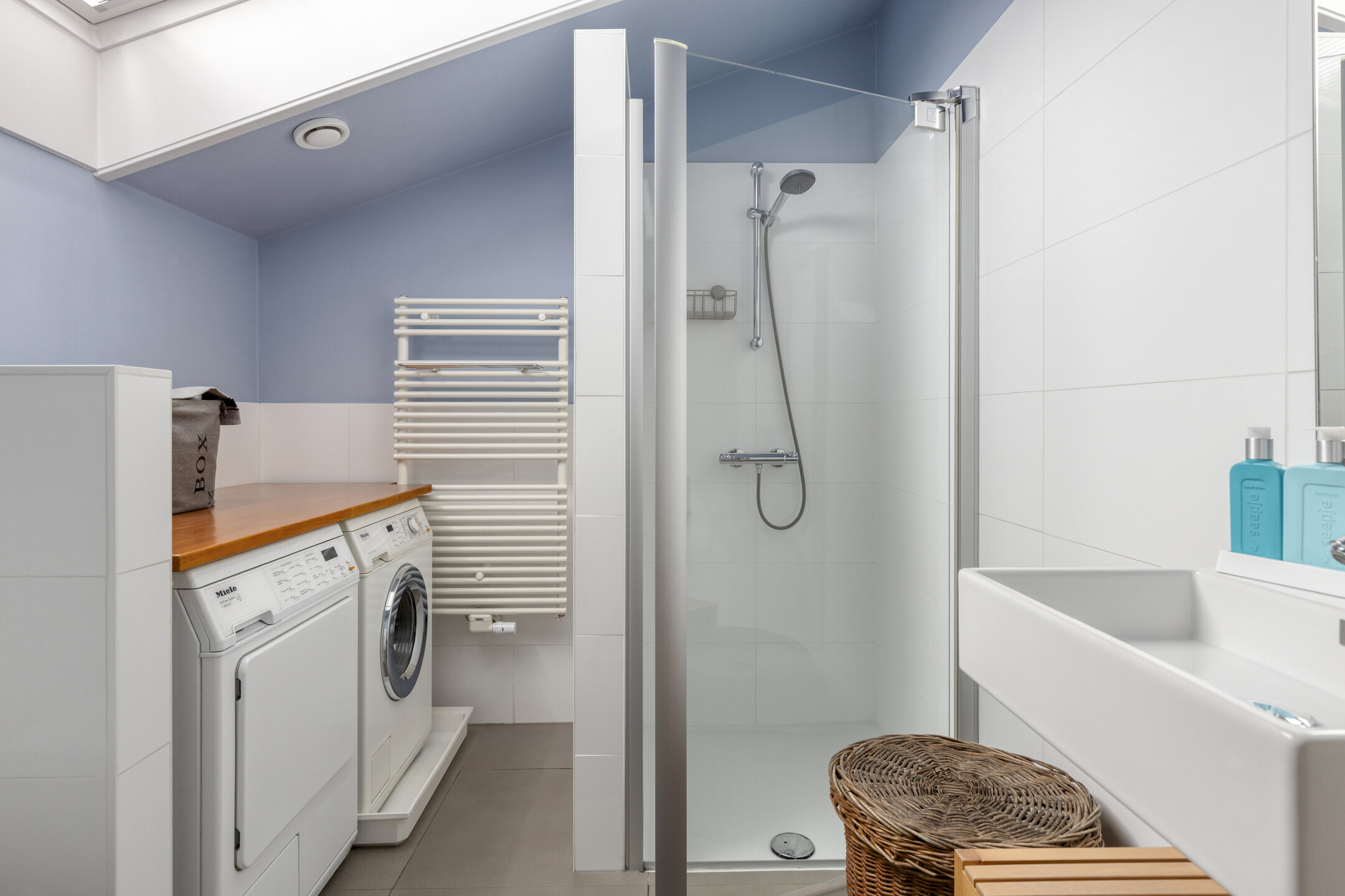 En la planta superior, la suite principal cuenta con baño privado con bañera y ducha a ras de suelo, mientras los dormitorios secundarios mantienen la sensación de amplitud y luz. Entre los equipamientos técnicos destacan la ventilación mecánica, calefacción por suelo radiante y conexión de fibra óptica, reflejando la completa modernización y excelente estado de conservación.